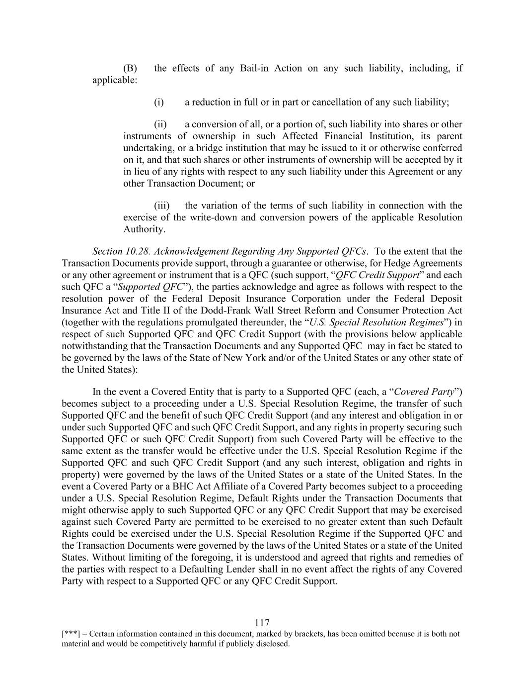117 [***] = Certain information contained in this document, marked by brackets, has been omitted because it is both not material and would be competitively harmful if publicly disclosed. (B) the effects of any Bail-in Action on any such liability, including, if applicable: (i) a reduction in full or in part or cancellation of any such liability; (ii) a conversion of all, or a portion of, such liability into shares or other instruments of ownership in such Affected Financial Institution, its parent undertaking, or a bridge institution that may be issued to it or otherwise conferred on it, and that such shares or other instruments of ownership will be accepted by it in lieu of any rights with respect to any such liability under this Agreement or any other Transaction Document; or (iii) the variation of the terms of such liability in connection with the exercise of the write-down and conversion powers of the applicable Resolution Authority. Section 10.28. Acknowledgement Regarding Any Supported QFCs. To the extent that the Transaction Documents provide support, through a guarantee or otherwise, for Hedge Agreements or any other agreement or instrument that is a QFC (such support, “QFC Credit Support” and each such QFC a “Supported QFC”), the parties acknowledge and agree as follows with respect to the resolution power of the Federal Deposit Insurance Corporation under the Federal Deposit Insurance Act and Title II of the Dodd-Frank Wall Street Reform and Consumer Protection Act (together with the regulations promulgated thereunder, the “U.S. Special Resolution Regimes”) in respect of such Supported QFC and QFC Credit Support (with the provisions below applicable notwithstanding that the Transaction Documents and any Supported QFC may in fact be stated to be governed by the laws of the State of New York and/or of the United States or any other state of the United States): In the event a Covered Entity that is party to a Supported QFC (each, a “Covered Party”) becomes subject to a proceeding under a U.S. Special Resolution Regime, the transfer of such Supported QFC and the benefit of such QFC Credit Support (and any interest and obligation in or under such Supported QFC and such QFC Credit Support, and any rights in property securing such Supported QFC or such QFC Credit Support) from such Covered Party will be effective to the same extent as the transfer would be effective under the U.S. Special Resolution Regime if the Supported QFC and such QFC Credit Support (and any such interest, obligation and rights in property) were governed by the laws of the United States or a state of the United States. In the event a Covered Party or a BHC Act Affiliate of a Covered Party becomes subject to a proceeding under a U.S. Special Resolution Regime, Default Rights under the Transaction Documents that might otherwise apply to such Supported QFC or any QFC Credit Support that may be exercised against such Covered Party are permitted to be exercised to no greater extent than such Default Rights could be exercised under the U.S. Special Resolution Regime if the Supported QFC and the Transaction Documents were governed by the laws of the United States or a state of the United States. Without limiting of the foregoing, it is understood and agreed that rights and remedies of the parties with respect to a Defaulting Lender shall in no event affect the rights of any Covered Party with respect to a Supported QFC or any QFC Credit Support.