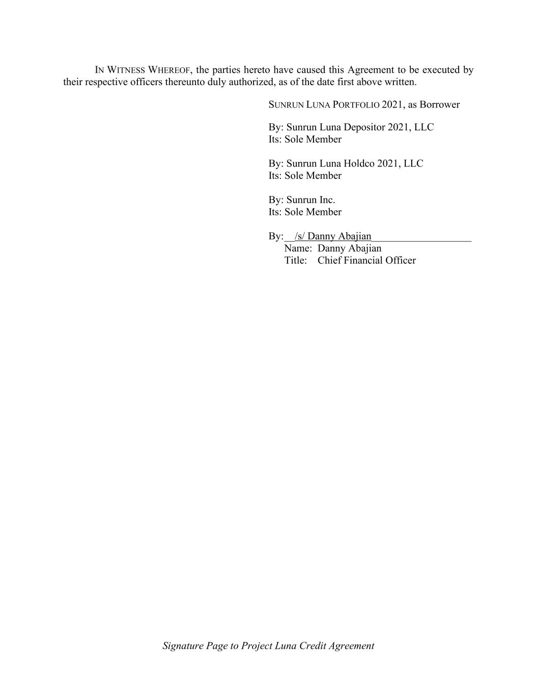 Signature Page to Project Luna Credit Agreement IN WITNESS WHEREOF, the parties hereto have caused this Agreement to be executed by their respective officers thereunto duly authorized, as of the date first above written. SUNRUN LUNA PORTFOLIO 2021, as Borrower By: Sunrun Luna Depositor 2021, LLC Its: Sole Member By: Sunrun Luna Holdco 2021, LLC Its: Sole Member By: Sunrun Inc. Its: Sole Member By: __/s/ Danny Abajian___________________ Name: Danny Abajian Title: Chief Financial Officer