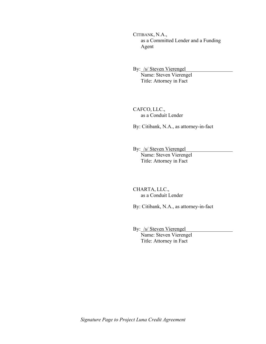 Signature Page to Project Luna Credit Agreement CITIBANK, N.A., as a Committed Lender and a Funding Agent By: _/s/ Steven Vierengel__________________ Name: Steven Vierengel Title: Attorney in Fact CAFCO, LLC., as a Conduit Lender By: Citibank, N.A., as attorney-in-fact By: _/s/ Steven Vierengel__________________ Name: Steven Vierengel Title: Attorney in Fact CHARTA, LLC., as a Conduit Lender By: Citibank, N.A., as attorney-in-fact By: _/s/ Steven Vierengel__________________ Name: Steven Vierengel Title: Attorney in Fact
