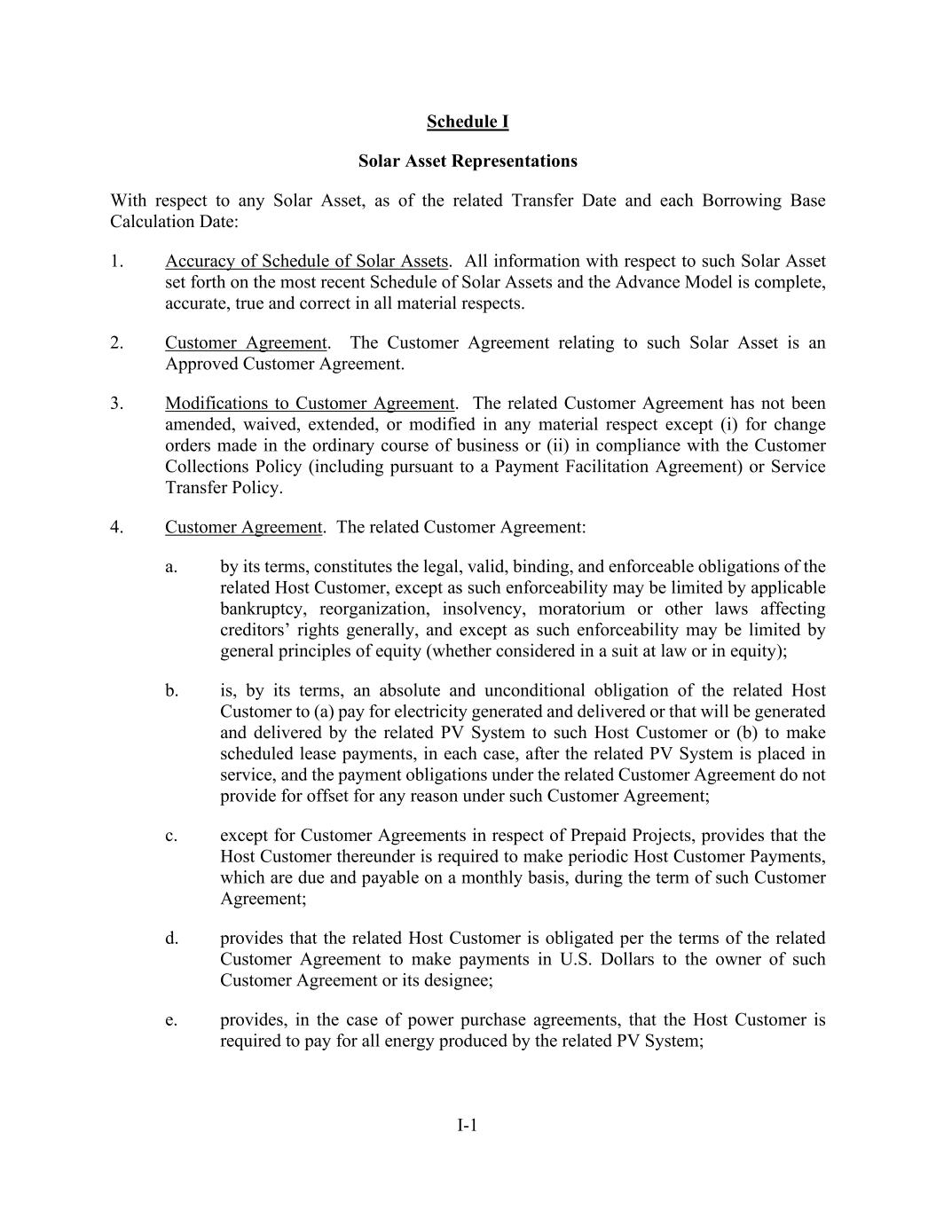 I-1 Schedule I Solar Asset Representations With respect to any Solar Asset, as of the related Transfer Date and each Borrowing Base Calculation Date: 1. Accuracy of Schedule of Solar Assets. All information with respect to such Solar Asset set forth on the most recent Schedule of Solar Assets and the Advance Model is complete, accurate, true and correct in all material respects. 2. Customer Agreement. The Customer Agreement relating to such Solar Asset is an Approved Customer Agreement. 3. Modifications to Customer Agreement. The related Customer Agreement has not been amended, waived, extended, or modified in any material respect except (i) for change orders made in the ordinary course of business or (ii) in compliance with the Customer Collections Policy (including pursuant to a Payment Facilitation Agreement) or Service Transfer Policy. 4. Customer Agreement. The related Customer Agreement: a. by its terms, constitutes the legal, valid, binding, and enforceable obligations of the related Host Customer, except as such enforceability may be limited by applicable bankruptcy, reorganization, insolvency, moratorium or other laws affecting creditors’ rights generally, and except as such enforceability may be limited by general principles of equity (whether considered in a suit at law or in equity); b. is, by its terms, an absolute and unconditional obligation of the related Host Customer to (a) pay for electricity generated and delivered or that will be generated and delivered by the related PV System to such Host Customer or (b) to make scheduled lease payments, in each case, after the related PV System is placed in service, and the payment obligations under the related Customer Agreement do not provide for offset for any reason under such Customer Agreement; c. except for Customer Agreements in respect of Prepaid Projects, provides that the Host Customer thereunder is required to make periodic Host Customer Payments, which are due and payable on a monthly basis, during the term of such Customer Agreement; d. provides that the related Host Customer is obligated per the terms of the related Customer Agreement to make payments in U.S. Dollars to the owner of such Customer Agreement or its designee; e. provides, in the case of power purchase agreements, that the Host Customer is required to pay for all energy produced by the related PV System;