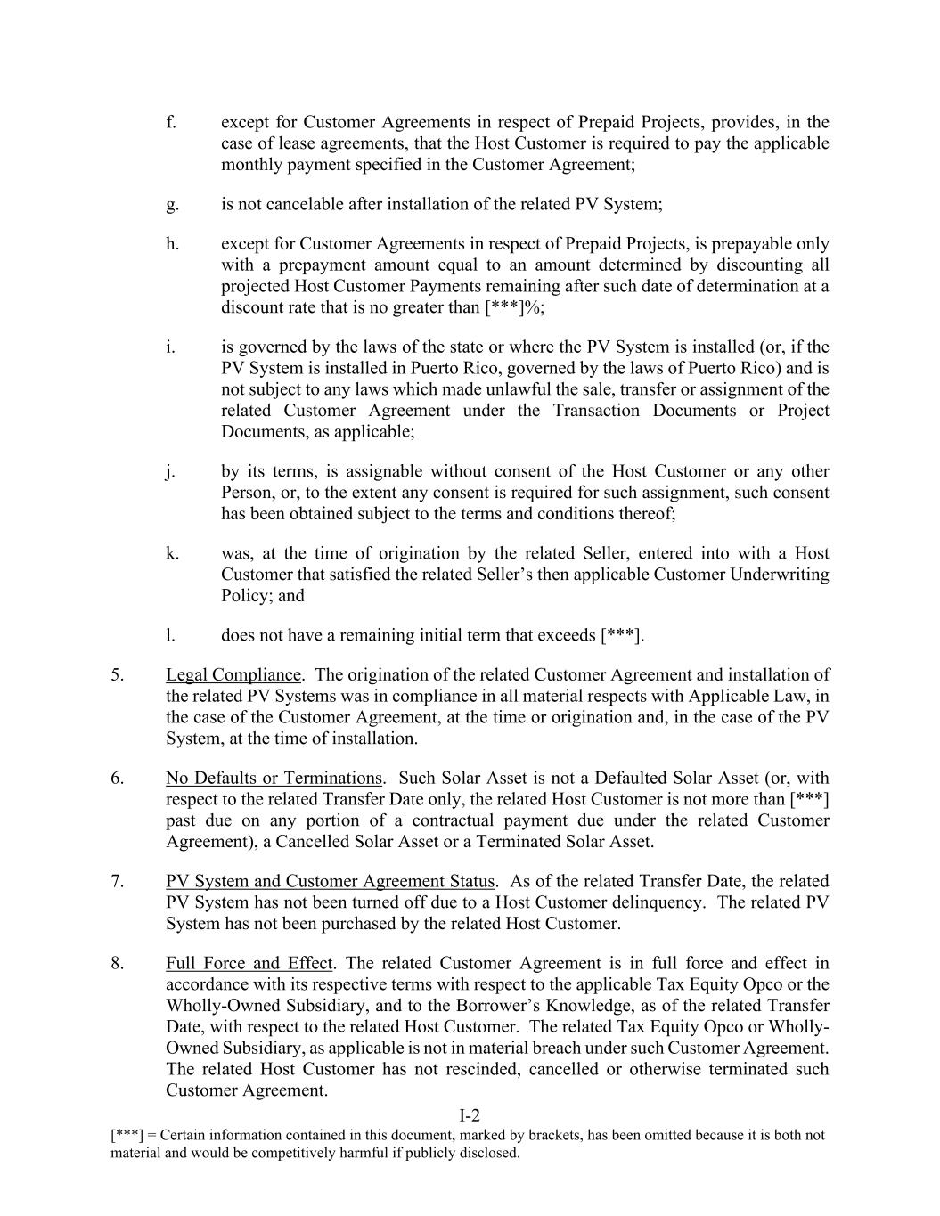 I-2 [***] = Certain information contained in this document, marked by brackets, has been omitted because it is both not material and would be competitively harmful if publicly disclosed. f. except for Customer Agreements in respect of Prepaid Projects, provides, in the case of lease agreements, that the Host Customer is required to pay the applicable monthly payment specified in the Customer Agreement; g. is not cancelable after installation of the related PV System; h. except for Customer Agreements in respect of Prepaid Projects, is prepayable only with a prepayment amount equal to an amount determined by discounting all projected Host Customer Payments remaining after such date of determination at a discount rate that is no greater than [***]%; i. is governed by the laws of the state or where the PV System is installed (or, if the PV System is installed in Puerto Rico, governed by the laws of Puerto Rico) and is not subject to any laws which made unlawful the sale, transfer or assignment of the related Customer Agreement under the Transaction Documents or Project Documents, as applicable; j. by its terms, is assignable without consent of the Host Customer or any other Person, or, to the extent any consent is required for such assignment, such consent has been obtained subject to the terms and conditions thereof; k. was, at the time of origination by the related Seller, entered into with a Host Customer that satisfied the related Seller’s then applicable Customer Underwriting Policy; and l. does not have a remaining initial term that exceeds [***]. 5. Legal Compliance. The origination of the related Customer Agreement and installation of the related PV Systems was in compliance in all material respects with Applicable Law, in the case of the Customer Agreement, at the time or origination and, in the case of the PV System, at the time of installation. 6. No Defaults or Terminations. Such Solar Asset is not a Defaulted Solar Asset (or, with respect to the related Transfer Date only, the related Host Customer is not more than [***] past due on any portion of a contractual payment due under the related Customer Agreement), a Cancelled Solar Asset or a Terminated Solar Asset. 7. PV System and Customer Agreement Status. As of the related Transfer Date, the related PV System has not been turned off due to a Host Customer delinquency. The related PV System has not been purchased by the related Host Customer. 8. Full Force and Effect. The related Customer Agreement is in full force and effect in accordance with its respective terms with respect to the applicable Tax Equity Opco or the Wholly-Owned Subsidiary, and to the Borrower’s Knowledge, as of the related Transfer Date, with respect to the related Host Customer. The related Tax Equity Opco or Wholly- Owned Subsidiary, as applicable is not in material breach under such Customer Agreement. The related Host Customer has not rescinded, cancelled or otherwise terminated such Customer Agreement.
