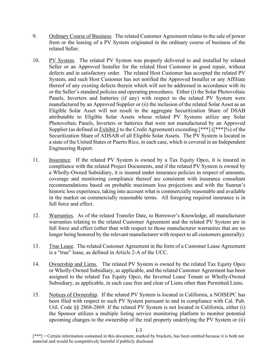I-3 [***] = Certain information contained in this document, marked by brackets, has been omitted because it is both not material and would be competitively harmful if publicly disclosed. 9. Ordinary Course of Business. The related Customer Agreement relates to the sale of power from or the leasing of a PV System originated in the ordinary course of business of the related Seller. 10. PV System. The related PV System was properly delivered to and installed by related Seller or an Approved Installer for the related Host Customer in good repair, without defects and in satisfactory order. The related Host Customer has accepted the related PV System, and such Host Customer has not notified the Approved Installer or any Affiliate thereof of any existing defects therein which will not be addressed in accordance with its or the Seller’s standard policies and operating procedures. Either (i) the Solar Photovoltaic Panels, Inverters and batteries (if any) with respect to the related PV System were manufactured by an Approved Supplier or (ii) the inclusion of the related Solar Asset as an Eligible Solar Asset will not result in the aggregate Securitization Share of DSAB attributable to Eligible Solar Assets whose related PV Systems utilize any Solar Photovoltaic Panels, Inverters or batteries that were not manufactured by an Approved Supplier (as defined in Exhibit J to the Credit Agreement) exceeding [***] ([***]%) of the Securitization Share of ADSAB of all Eligible Solar Assets. The PV System is located in a state of the United States or Puerto Rico, in each case, which is covered in an Independent Engineering Report. 11. Insurance. If the related PV System is owned by a Tax Equity Opco, it is insured in compliance with the related Project Documents, and if the related PV System is owned by a Wholly-Owned Subsidiary, it is insured under insurance policies in respect of amounts, coverage and monitoring compliance thereof are consistent with insurance consultant recommendations based on probable maximum loss projections and with the Sunrun’s historic loss experience, taking into account what is commercially reasonable and available in the market on commercially reasonable terms. All foregoing required insurance is in full force and effect. 12. Warranties. As of the related Transfer Date, to Borrower’s Knowledge, all manufacturer warranties relating to the related Customer Agreement and the related PV System are in full force and effect (other than with respect to those manufacturer warranties that are no longer being honored by the relevant manufacturer with respect to all customers generally). 13. True Lease. The related Customer Agreement in the form of a Customer Lease Agreement is a “true” lease, as defined in Article 2-A of the UCC. 14. Ownership and Liens. The related PV System is owned by the related Tax Equity Opco or Wholly-Owned Subsidiary, as applicable, and the related Customer Agreement has been assigned to the related Tax Equity Opco, the Inverted Lease Tenant or Wholly-Owned Subsidiary, as applicable, in each case free and clear of Liens other than Permitted Liens. 15. Notices of Ownership. If the related PV System is located in California, a NOISEPC has been filed with respect to such PV System pursuant to and in compliance with Cal. Pub. Util. Code §§ 2868-2869. If the related PV System is not located in California, either (i) the Sponsor utilizes a multiple listing service monitoring platform to monitor potential upcoming changes to the ownership of the real property underlying the PV System or (ii)
