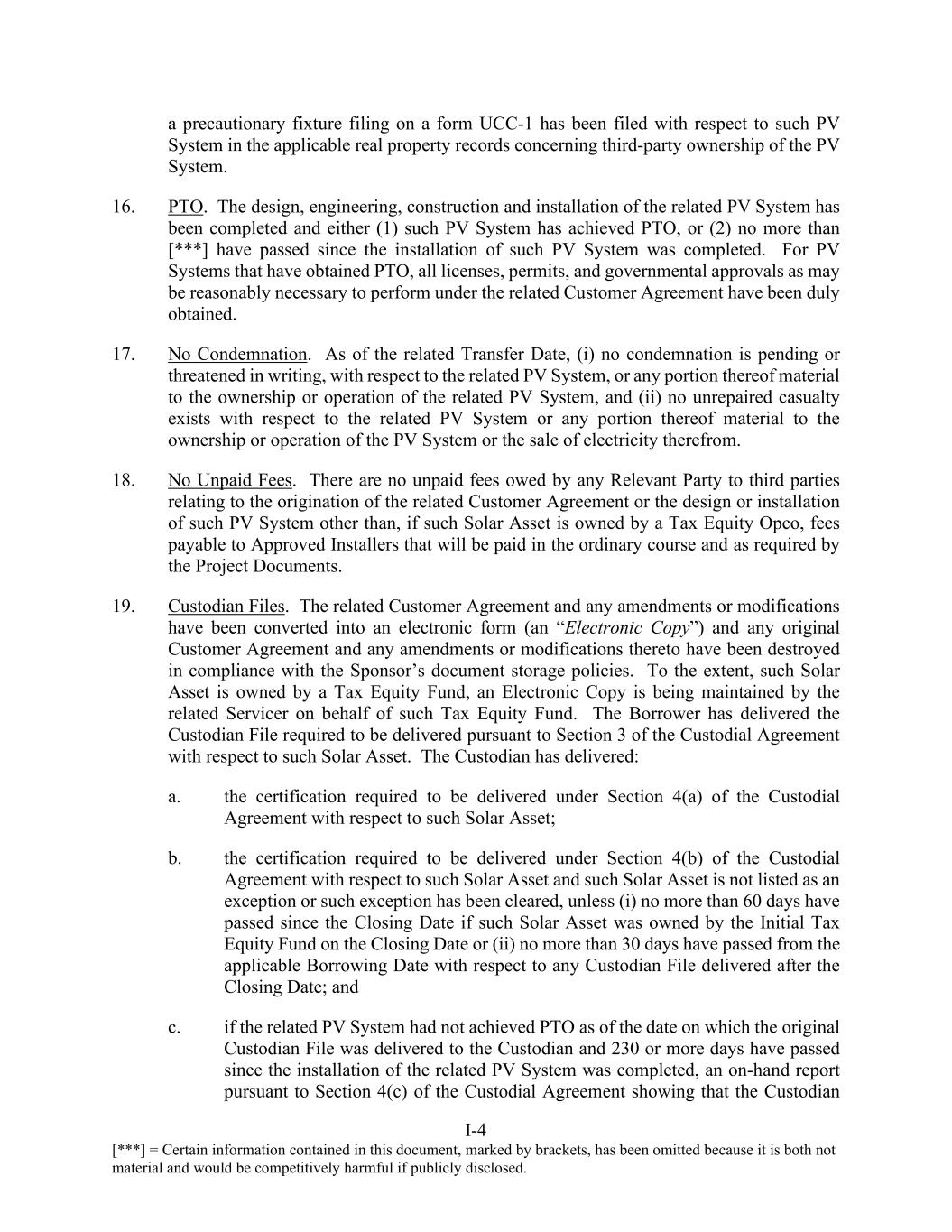I-4 [***] = Certain information contained in this document, marked by brackets, has been omitted because it is both not material and would be competitively harmful if publicly disclosed. a precautionary fixture filing on a form UCC-1 has been filed with respect to such PV System in the applicable real property records concerning third-party ownership of the PV System. 16. PTO. The design, engineering, construction and installation of the related PV System has been completed and either (1) such PV System has achieved PTO, or (2) no more than [***] have passed since the installation of such PV System was completed. For PV Systems that have obtained PTO, all licenses, permits, and governmental approvals as may be reasonably necessary to perform under the related Customer Agreement have been duly obtained. 17. No Condemnation. As of the related Transfer Date, (i) no condemnation is pending or threatened in writing, with respect to the related PV System, or any portion thereof material to the ownership or operation of the related PV System, and (ii) no unrepaired casualty exists with respect to the related PV System or any portion thereof material to the ownership or operation of the PV System or the sale of electricity therefrom. 18. No Unpaid Fees. There are no unpaid fees owed by any Relevant Party to third parties relating to the origination of the related Customer Agreement or the design or installation of such PV System other than, if such Solar Asset is owned by a Tax Equity Opco, fees payable to Approved Installers that will be paid in the ordinary course and as required by the Project Documents. 19. Custodian Files. The related Customer Agreement and any amendments or modifications have been converted into an electronic form (an “Electronic Copy”) and any original Customer Agreement and any amendments or modifications thereto have been destroyed in compliance with the Sponsor’s document storage policies. To the extent, such Solar Asset is owned by a Tax Equity Fund, an Electronic Copy is being maintained by the related Servicer on behalf of such Tax Equity Fund. The Borrower has delivered the Custodian File required to be delivered pursuant to Section 3 of the Custodial Agreement with respect to such Solar Asset. The Custodian has delivered: a. the certification required to be delivered under Section 4(a) of the Custodial Agreement with respect to such Solar Asset; b. the certification required to be delivered under Section 4(b) of the Custodial Agreement with respect to such Solar Asset and such Solar Asset is not listed as an exception or such exception has been cleared, unless (i) no more than 60 days have passed since the Closing Date if such Solar Asset was owned by the Initial Tax Equity Fund on the Closing Date or (ii) no more than 30 days have passed from the applicable Borrowing Date with respect to any Custodian File delivered after the Closing Date; and c. if the related PV System had not achieved PTO as of the date on which the original Custodian File was delivered to the Custodian and 230 or more days have passed since the installation of the related PV System was completed, an on-hand report pursuant to Section 4(c) of the Custodial Agreement showing that the Custodian