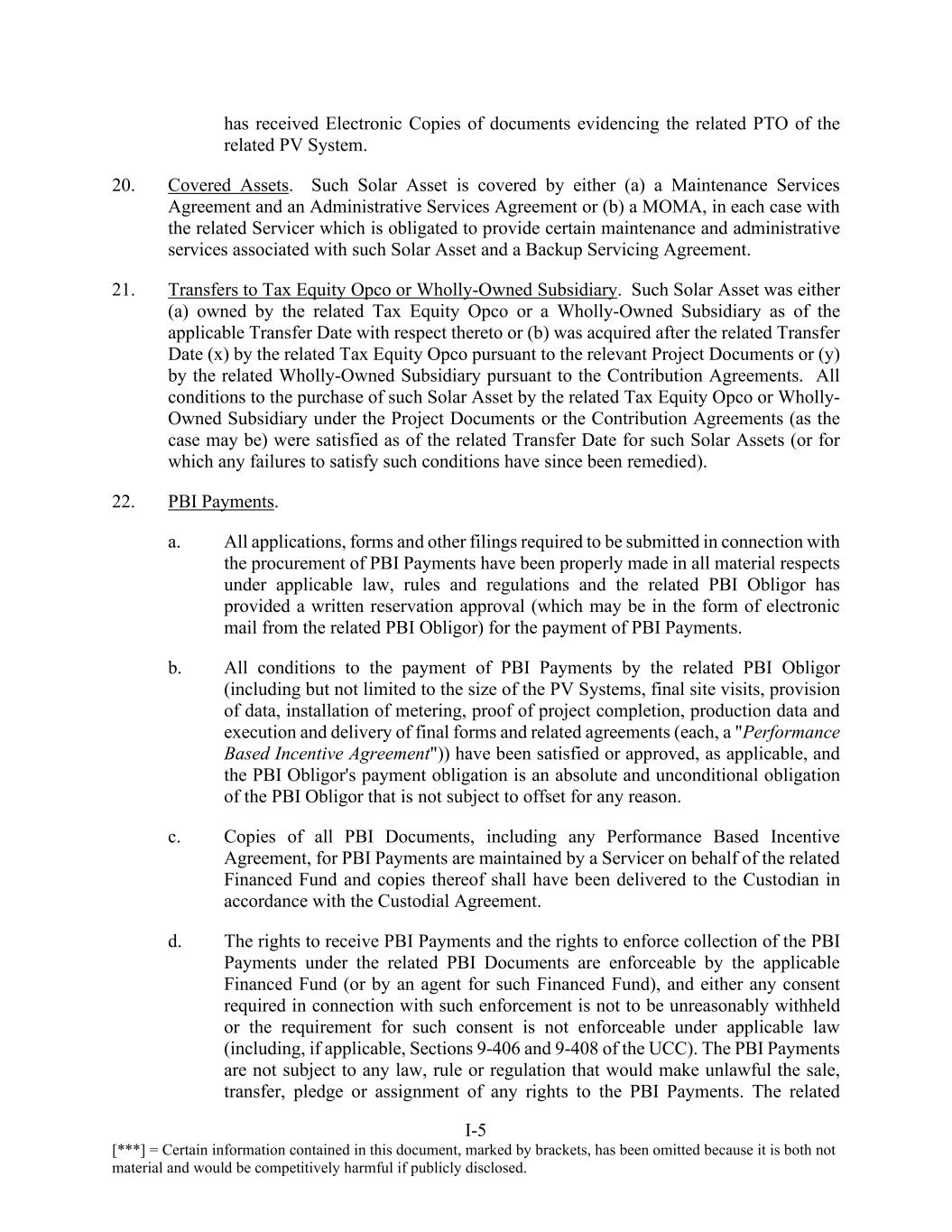 I-5 [***] = Certain information contained in this document, marked by brackets, has been omitted because it is both not material and would be competitively harmful if publicly disclosed. has received Electronic Copies of documents evidencing the related PTO of the related PV System. 20. Covered Assets. Such Solar Asset is covered by either (a) a Maintenance Services Agreement and an Administrative Services Agreement or (b) a MOMA, in each case with the related Servicer which is obligated to provide certain maintenance and administrative services associated with such Solar Asset and a Backup Servicing Agreement. 21. Transfers to Tax Equity Opco or Wholly-Owned Subsidiary. Such Solar Asset was either (a) owned by the related Tax Equity Opco or a Wholly-Owned Subsidiary as of the applicable Transfer Date with respect thereto or (b) was acquired after the related Transfer Date (x) by the related Tax Equity Opco pursuant to the relevant Project Documents or (y) by the related Wholly-Owned Subsidiary pursuant to the Contribution Agreements. All conditions to the purchase of such Solar Asset by the related Tax Equity Opco or Wholly- Owned Subsidiary under the Project Documents or the Contribution Agreements (as the case may be) were satisfied as of the related Transfer Date for such Solar Assets (or for which any failures to satisfy such conditions have since been remedied). 22. PBI Payments. a. All applications, forms and other filings required to be submitted in connection with the procurement of PBI Payments have been properly made in all material respects under applicable law, rules and regulations and the related PBI Obligor has provided a written reservation approval (which may be in the form of electronic mail from the related PBI Obligor) for the payment of PBI Payments. b. All conditions to the payment of PBI Payments by the related PBI Obligor (including but not limited to the size of the PV Systems, final site visits, provision of data, installation of metering, proof of project completion, production data and execution and delivery of final forms and related agreements (each, a "Performance Based Incentive Agreement")) have been satisfied or approved, as applicable, and the PBI Obligor's payment obligation is an absolute and unconditional obligation of the PBI Obligor that is not subject to offset for any reason. c. Copies of all PBI Documents, including any Performance Based Incentive Agreement, for PBI Payments are maintained by a Servicer on behalf of the related Financed Fund and copies thereof shall have been delivered to the Custodian in accordance with the Custodial Agreement. d. The rights to receive PBI Payments and the rights to enforce collection of the PBI Payments under the related PBI Documents are enforceable by the applicable Financed Fund (or by an agent for such Financed Fund), and either any consent required in connection with such enforcement is not to be unreasonably withheld or the requirement for such consent is not enforceable under applicable law (including, if applicable, Sections 9-406 and 9-408 of the UCC). The PBI Payments are not subject to any law, rule or regulation that would make unlawful the sale, transfer, pledge or assignment of any rights to the PBI Payments. The related
