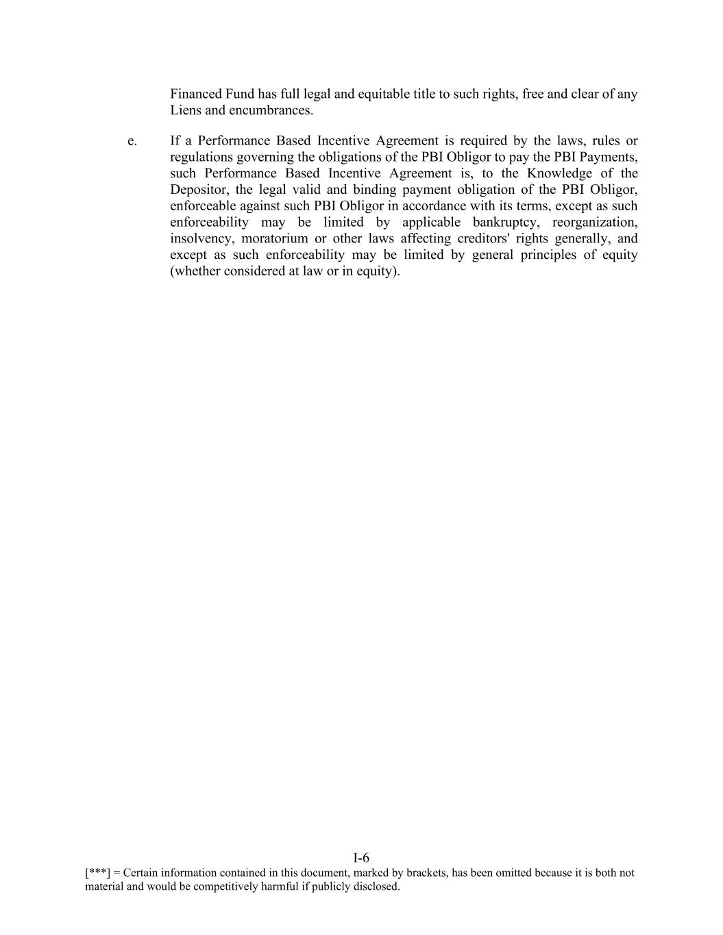 I-6 [***] = Certain information contained in this document, marked by brackets, has been omitted because it is both not material and would be competitively harmful if publicly disclosed. Financed Fund has full legal and equitable title to such rights, free and clear of any Liens and encumbrances. e. If a Performance Based Incentive Agreement is required by the laws, rules or regulations governing the obligations of the PBI Obligor to pay the PBI Payments, such Performance Based Incentive Agreement is, to the Knowledge of the Depositor, the legal valid and binding payment obligation of the PBI Obligor, enforceable against such PBI Obligor in accordance with its terms, except as such enforceability may be limited by applicable bankruptcy, reorganization, insolvency, moratorium or other laws affecting creditors' rights generally, and except as such enforceability may be limited by general principles of equity (whether considered at law or in equity).