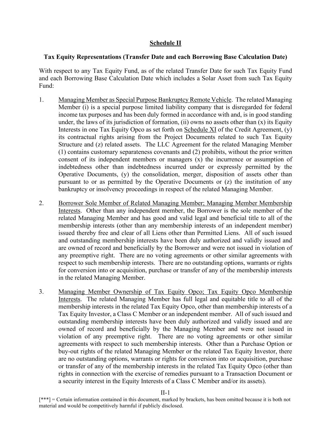 II-1 [***] = Certain information contained in this document, marked by brackets, has been omitted because it is both not material and would be competitively harmful if publicly disclosed. Schedule II Tax Equity Representations (Transfer Date and each Borrowing Base Calculation Date) With respect to any Tax Equity Fund, as of the related Transfer Date for such Tax Equity Fund and each Borrowing Base Calculation Date which includes a Solar Asset from such Tax Equity Fund: 1. Managing Member as Special Purpose Bankruptcy Remote Vehicle. The related Managing Member (i) is a special purpose limited liability company that is disregarded for federal income tax purposes and has been duly formed in accordance with and, is in good standing under, the laws of its jurisdiction of formation, (ii) owns no assets other than (x) its Equity Interests in one Tax Equity Opco as set forth on Schedule XI of the Credit Agreement, (y) its contractual rights arising from the Project Documents related to such Tax Equity Structure and (z) related assets. The LLC Agreement for the related Managing Member (1) contains customary separateness covenants and (2) prohibits, without the prior written consent of its independent members or managers (x) the incurrence or assumption of indebtedness other than indebtedness incurred under or expressly permitted by the Operative Documents, (y) the consolidation, merger, disposition of assets other than pursuant to or as permitted by the Operative Documents or (z) the institution of any bankruptcy or insolvency proceedings in respect of the related Managing Member. 2. Borrower Sole Member of Related Managing Member; Managing Member Membership Interests. Other than any independent member, the Borrower is the sole member of the related Managing Member and has good and valid legal and beneficial title to all of the membership interests (other than any membership interests of an independent member) issued thereby free and clear of all Liens other than Permitted Liens. All of such issued and outstanding membership interests have been duly authorized and validly issued and are owned of record and beneficially by the Borrower and were not issued in violation of any preemptive right. There are no voting agreements or other similar agreements with respect to such membership interests. There are no outstanding options, warrants or rights for conversion into or acquisition, purchase or transfer of any of the membership interests in the related Managing Member. 3. Managing Member Ownership of Tax Equity Opco; Tax Equity Opco Membership Interests. The related Managing Member has full legal and equitable title to all of the membership interests in the related Tax Equity Opco, other than membership interests of a Tax Equity Investor, a Class C Member or an independent member. All of such issued and outstanding membership interests have been duly authorized and validly issued and are owned of record and beneficially by the Managing Member and were not issued in violation of any preemptive right. There are no voting agreements or other similar agreements with respect to such membership interests. Other than a Purchase Option or buy-out rights of the related Managing Member or the related Tax Equity Investor, there are no outstanding options, warrants or rights for conversion into or acquisition, purchase or transfer of any of the membership interests in the related Tax Equity Opco (other than rights in connection with the exercise of remedies pursuant to a Transaction Document or a security interest in the Equity Interests of a Class C Member and/or its assets).