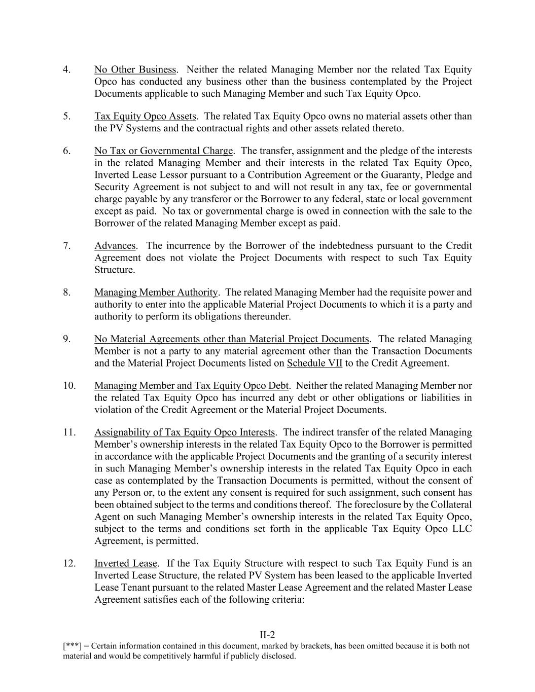 II-2 [***] = Certain information contained in this document, marked by brackets, has been omitted because it is both not material and would be competitively harmful if publicly disclosed. 4. No Other Business. Neither the related Managing Member nor the related Tax Equity Opco has conducted any business other than the business contemplated by the Project Documents applicable to such Managing Member and such Tax Equity Opco. 5. Tax Equity Opco Assets. The related Tax Equity Opco owns no material assets other than the PV Systems and the contractual rights and other assets related thereto. 6. No Tax or Governmental Charge. The transfer, assignment and the pledge of the interests in the related Managing Member and their interests in the related Tax Equity Opco, Inverted Lease Lessor pursuant to a Contribution Agreement or the Guaranty, Pledge and Security Agreement is not subject to and will not result in any tax, fee or governmental charge payable by any transferor or the Borrower to any federal, state or local government except as paid. No tax or governmental charge is owed in connection with the sale to the Borrower of the related Managing Member except as paid. 7. Advances. The incurrence by the Borrower of the indebtedness pursuant to the Credit Agreement does not violate the Project Documents with respect to such Tax Equity Structure. 8. Managing Member Authority. The related Managing Member had the requisite power and authority to enter into the applicable Material Project Documents to which it is a party and authority to perform its obligations thereunder. 9. No Material Agreements other than Material Project Documents. The related Managing Member is not a party to any material agreement other than the Transaction Documents and the Material Project Documents listed on Schedule VII to the Credit Agreement. 10. Managing Member and Tax Equity Opco Debt. Neither the related Managing Member nor the related Tax Equity Opco has incurred any debt or other obligations or liabilities in violation of the Credit Agreement or the Material Project Documents. 11. Assignability of Tax Equity Opco Interests. The indirect transfer of the related Managing Member’s ownership interests in the related Tax Equity Opco to the Borrower is permitted in accordance with the applicable Project Documents and the granting of a security interest in such Managing Member’s ownership interests in the related Tax Equity Opco in each case as contemplated by the Transaction Documents is permitted, without the consent of any Person or, to the extent any consent is required for such assignment, such consent has been obtained subject to the terms and conditions thereof. The foreclosure by the Collateral Agent on such Managing Member’s ownership interests in the related Tax Equity Opco, subject to the terms and conditions set forth in the applicable Tax Equity Opco LLC Agreement, is permitted. 12. Inverted Lease. If the Tax Equity Structure with respect to such Tax Equity Fund is an Inverted Lease Structure, the related PV System has been leased to the applicable Inverted Lease Tenant pursuant to the related Master Lease Agreement and the related Master Lease Agreement satisfies each of the following criteria: