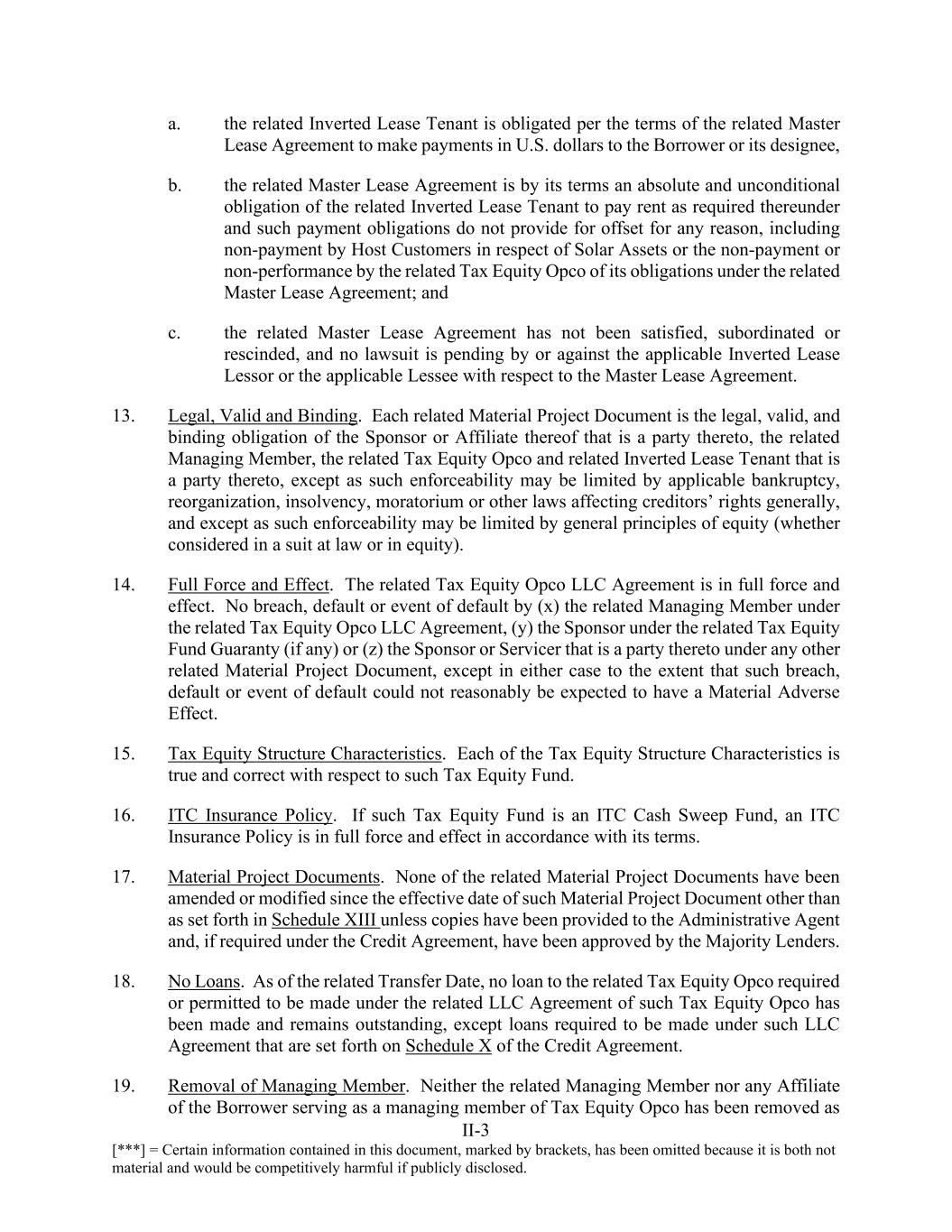 II-3 [***] = Certain information contained in this document, marked by brackets, has been omitted because it is both not material and would be competitively harmful if publicly disclosed. a. the related Inverted Lease Tenant is obligated per the terms of the related Master Lease Agreement to make payments in U.S. dollars to the Borrower or its designee, b. the related Master Lease Agreement is by its terms an absolute and unconditional obligation of the related Inverted Lease Tenant to pay rent as required thereunder and such payment obligations do not provide for offset for any reason, including non-payment by Host Customers in respect of Solar Assets or the non-payment or non-performance by the related Tax Equity Opco of its obligations under the related Master Lease Agreement; and c. the related Master Lease Agreement has not been satisfied, subordinated or rescinded, and no lawsuit is pending by or against the applicable Inverted Lease Lessor or the applicable Lessee with respect to the Master Lease Agreement. 13. Legal, Valid and Binding. Each related Material Project Document is the legal, valid, and binding obligation of the Sponsor or Affiliate thereof that is a party thereto, the related Managing Member, the related Tax Equity Opco and related Inverted Lease Tenant that is a party thereto, except as such enforceability may be limited by applicable bankruptcy, reorganization, insolvency, moratorium or other laws affecting creditors’ rights generally, and except as such enforceability may be limited by general principles of equity (whether considered in a suit at law or in equity). 14. Full Force and Effect. The related Tax Equity Opco LLC Agreement is in full force and effect. No breach, default or event of default by (x) the related Managing Member under the related Tax Equity Opco LLC Agreement, (y) the Sponsor under the related Tax Equity Fund Guaranty (if any) or (z) the Sponsor or Servicer that is a party thereto under any other related Material Project Document, except in either case to the extent that such breach, default or event of default could not reasonably be expected to have a Material Adverse Effect. 15. Tax Equity Structure Characteristics. Each of the Tax Equity Structure Characteristics is true and correct with respect to such Tax Equity Fund. 16. ITC Insurance Policy. If such Tax Equity Fund is an ITC Cash Sweep Fund, an ITC Insurance Policy is in full force and effect in accordance with its terms. 17. Material Project Documents. None of the related Material Project Documents have been amended or modified since the effective date of such Material Project Document other than as set forth in Schedule XIII unless copies have been provided to the Administrative Agent and, if required under the Credit Agreement, have been approved by the Majority Lenders. 18. No Loans. As of the related Transfer Date, no loan to the related Tax Equity Opco required or permitted to be made under the related LLC Agreement of such Tax Equity Opco has been made and remains outstanding, except loans required to be made under such LLC Agreement that are set forth on Schedule X of the Credit Agreement. 19. Removal of Managing Member. Neither the related Managing Member nor any Affiliate of the Borrower serving as a managing member of Tax Equity Opco has been removed as