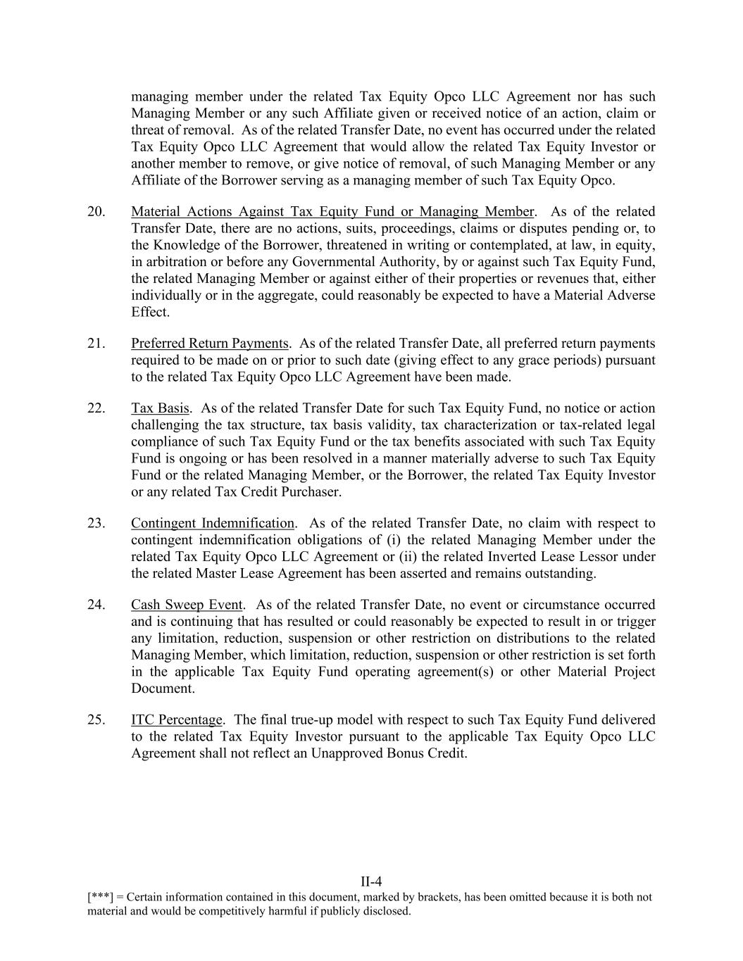 II-4 [***] = Certain information contained in this document, marked by brackets, has been omitted because it is both not material and would be competitively harmful if publicly disclosed. managing member under the related Tax Equity Opco LLC Agreement nor has such Managing Member or any such Affiliate given or received notice of an action, claim or threat of removal. As of the related Transfer Date, no event has occurred under the related Tax Equity Opco LLC Agreement that would allow the related Tax Equity Investor or another member to remove, or give notice of removal, of such Managing Member or any Affiliate of the Borrower serving as a managing member of such Tax Equity Opco. 20. Material Actions Against Tax Equity Fund or Managing Member. As of the related Transfer Date, there are no actions, suits, proceedings, claims or disputes pending or, to the Knowledge of the Borrower, threatened in writing or contemplated, at law, in equity, in arbitration or before any Governmental Authority, by or against such Tax Equity Fund, the related Managing Member or against either of their properties or revenues that, either individually or in the aggregate, could reasonably be expected to have a Material Adverse Effect. 21. Preferred Return Payments. As of the related Transfer Date, all preferred return payments required to be made on or prior to such date (giving effect to any grace periods) pursuant to the related Tax Equity Opco LLC Agreement have been made. 22. Tax Basis. As of the related Transfer Date for such Tax Equity Fund, no notice or action challenging the tax structure, tax basis validity, tax characterization or tax-related legal compliance of such Tax Equity Fund or the tax benefits associated with such Tax Equity Fund is ongoing or has been resolved in a manner materially adverse to such Tax Equity Fund or the related Managing Member, or the Borrower, the related Tax Equity Investor or any related Tax Credit Purchaser. 23. Contingent Indemnification. As of the related Transfer Date, no claim with respect to contingent indemnification obligations of (i) the related Managing Member under the related Tax Equity Opco LLC Agreement or (ii) the related Inverted Lease Lessor under the related Master Lease Agreement has been asserted and remains outstanding. 24. Cash Sweep Event. As of the related Transfer Date, no event or circumstance occurred and is continuing that has resulted or could reasonably be expected to result in or trigger any limitation, reduction, suspension or other restriction on distributions to the related Managing Member, which limitation, reduction, suspension or other restriction is set forth in the applicable Tax Equity Fund operating agreement(s) or other Material Project Document. 25. ITC Percentage. The final true-up model with respect to such Tax Equity Fund delivered to the related Tax Equity Investor pursuant to the applicable Tax Equity Opco LLC Agreement shall not reflect an Unapproved Bonus Credit.