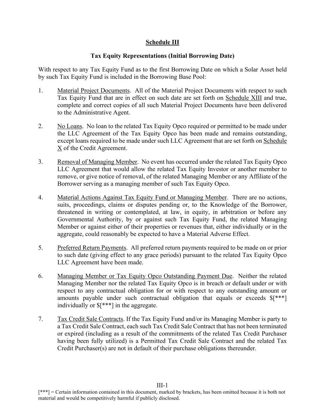 III-1 [***] = Certain information contained in this document, marked by brackets, has been omitted because it is both not material and would be competitively harmful if publicly disclosed. Schedule III Tax Equity Representations (Initial Borrowing Date) With respect to any Tax Equity Fund as to the first Borrowing Date on which a Solar Asset held by such Tax Equity Fund is included in the Borrowing Base Pool: 1. Material Project Documents. All of the Material Project Documents with respect to such Tax Equity Fund that are in effect on such date are set forth on Schedule XIII and true, complete and correct copies of all such Material Project Documents have been delivered to the Administrative Agent. 2. No Loans. No loan to the related Tax Equity Opco required or permitted to be made under the LLC Agreement of the Tax Equity Opco has been made and remains outstanding, except loans required to be made under such LLC Agreement that are set forth on Schedule X of the Credit Agreement. 3. Removal of Managing Member. No event has occurred under the related Tax Equity Opco LLC Agreement that would allow the related Tax Equity Investor or another member to remove, or give notice of removal, of the related Managing Member or any Affiliate of the Borrower serving as a managing member of such Tax Equity Opco. 4. Material Actions Against Tax Equity Fund or Managing Member. There are no actions, suits, proceedings, claims or disputes pending or, to the Knowledge of the Borrower, threatened in writing or contemplated, at law, in equity, in arbitration or before any Governmental Authority, by or against such Tax Equity Fund, the related Managing Member or against either of their properties or revenues that, either individually or in the aggregate, could reasonably be expected to have a Material Adverse Effect. 5. Preferred Return Payments. All preferred return payments required to be made on or prior to such date (giving effect to any grace periods) pursuant to the related Tax Equity Opco LLC Agreement have been made. 6. Managing Member or Tax Equity Opco Outstanding Payment Due. Neither the related Managing Member nor the related Tax Equity Opco is in breach or default under or with respect to any contractual obligation for or with respect to any outstanding amount or amounts payable under such contractual obligation that equals or exceeds $[***] individually or $[***] in the aggregate. 7. Tax Credit Sale Contracts. If the Tax Equity Fund and/or its Managing Member is party to a Tax Credit Sale Contract, each such Tax Credit Sale Contract that has not been terminated or expired (including as a result of the commitments of the related Tax Credit Purchaser having been fully utilized) is a Permitted Tax Credit Sale Contract and the related Tax Credit Purchaser(s) are not in default of their purchase obligations thereunder.