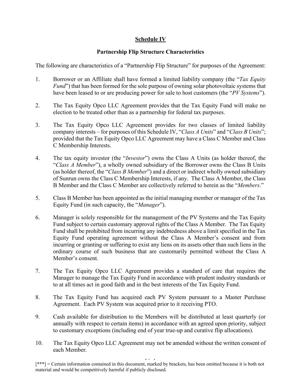 IV-1 [***] = Certain information contained in this document, marked by brackets, has been omitted because it is both not material and would be competitively harmful if publicly disclosed. Schedule IV Partnership Flip Structure Characteristics The following are characteristics of a “Partnership Flip Structure” for purposes of the Agreement: 1. Borrower or an Affiliate shall have formed a limited liability company (the “Tax Equity Fund”) that has been formed for the sole purpose of owning solar photovoltaic systems that have been leased to or are producing power for sale to host customers (the “PV Systems”). 2. The Tax Equity Opco LLC Agreement provides that the Tax Equity Fund will make no election to be treated other than as a partnership for federal tax purposes. 3. The Tax Equity Opco LLC Agreement provides for two classes of limited liability company interests – for purposes of this Schedule IV, “Class A Units” and “Class B Units”; provided that the Tax Equity Opco LLC Agreement may have a Class C Member and Class C Membership Interests. 4. The tax equity investor (the “Investor”) owns the Class A Units (as holder thereof, the “Class A Member”), a wholly owned subsidiary of the Borrower owns the Class B Units (as holder thereof, the “Class B Member”) and a direct or indirect wholly owned subsidiary of Sunrun owns the Class C Membership Interests, if any. The Class A Member, the Class B Member and the Class C Member are collectively referred to herein as the “Members.” 5. Class B Member has been appointed as the initial managing member or manager of the Tax Equity Fund (in such capacity, the “Manager”). 6. Manager is solely responsible for the management of the PV Systems and the Tax Equity Fund subject to certain customary approval rights of the Class A Member. The Tax Equity Fund shall be prohibited from incurring any indebtedness above a limit specified in the Tax Equity Fund operating agreement without the Class A Member’s consent and from incurring or granting or suffering to exist any liens on its assets other than such liens in the ordinary course of such business that are customarily permitted without the Class A Member’s consent. 7. The Tax Equity Opco LLC Agreement provides a standard of care that requires the Manager to manage the Tax Equity Fund in accordance with prudent industry standards or to at all times act in good faith and in the best interests of the Tax Equity Fund. 8. The Tax Equity Fund has acquired each PV System pursuant to a Master Purchase Agreement. Each PV System was acquired prior to it receiving PTO. 9. Cash available for distribution to the Members will be distributed at least quarterly (or annually with respect to certain items) in accordance with an agreed upon priority, subject to customary exceptions (including end of year true-up and curative flip allocations). 10. The Tax Equity Opco LLC Agreement may not be amended without the written consent of each Member.