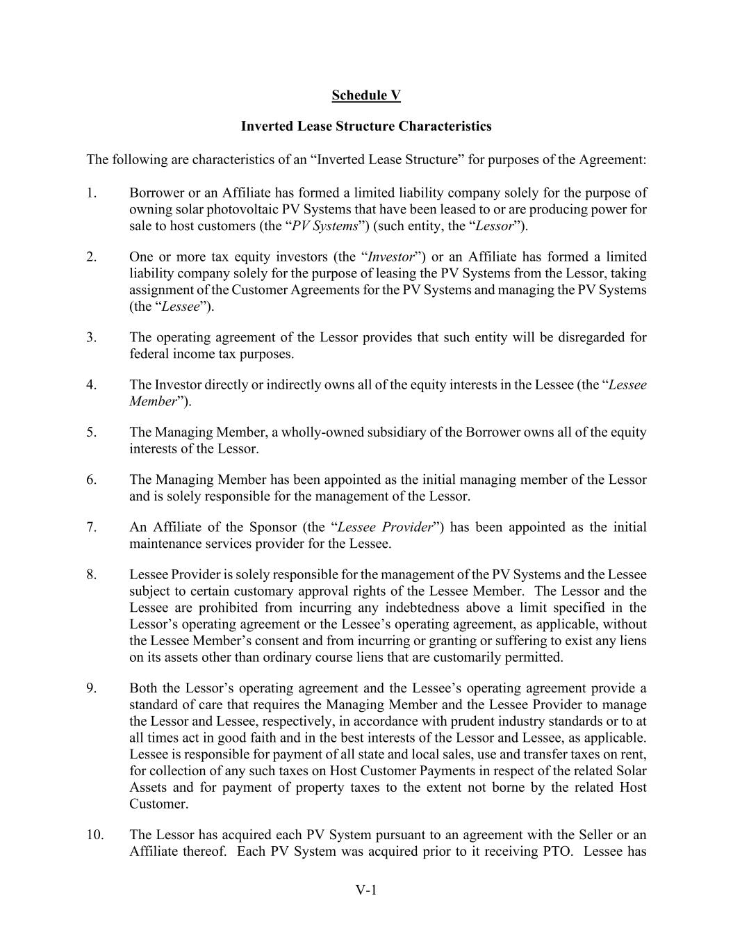 V-1 Schedule V Inverted Lease Structure Characteristics The following are characteristics of an “Inverted Lease Structure” for purposes of the Agreement: 1. Borrower or an Affiliate has formed a limited liability company solely for the purpose of owning solar photovoltaic PV Systems that have been leased to or are producing power for sale to host customers (the “PV Systems”) (such entity, the “Lessor”). 2. One or more tax equity investors (the “Investor”) or an Affiliate has formed a limited liability company solely for the purpose of leasing the PV Systems from the Lessor, taking assignment of the Customer Agreements for the PV Systems and managing the PV Systems (the “Lessee”). 3. The operating agreement of the Lessor provides that such entity will be disregarded for federal income tax purposes. 4. The Investor directly or indirectly owns all of the equity interests in the Lessee (the “Lessee Member”). 5. The Managing Member, a wholly-owned subsidiary of the Borrower owns all of the equity interests of the Lessor. 6. The Managing Member has been appointed as the initial managing member of the Lessor and is solely responsible for the management of the Lessor. 7. An Affiliate of the Sponsor (the “Lessee Provider”) has been appointed as the initial maintenance services provider for the Lessee. 8. Lessee Provider is solely responsible for the management of the PV Systems and the Lessee subject to certain customary approval rights of the Lessee Member. The Lessor and the Lessee are prohibited from incurring any indebtedness above a limit specified in the Lessor’s operating agreement or the Lessee’s operating agreement, as applicable, without the Lessee Member’s consent and from incurring or granting or suffering to exist any liens on its assets other than ordinary course liens that are customarily permitted. 9. Both the Lessor’s operating agreement and the Lessee’s operating agreement provide a standard of care that requires the Managing Member and the Lessee Provider to manage the Lessor and Lessee, respectively, in accordance with prudent industry standards or to at all times act in good faith and in the best interests of the Lessor and Lessee, as applicable. Lessee is responsible for payment of all state and local sales, use and transfer taxes on rent, for collection of any such taxes on Host Customer Payments in respect of the related Solar Assets and for payment of property taxes to the extent not borne by the related Host Customer. 10. The Lessor has acquired each PV System pursuant to an agreement with the Seller or an Affiliate thereof. Each PV System was acquired prior to it receiving PTO. Lessee has