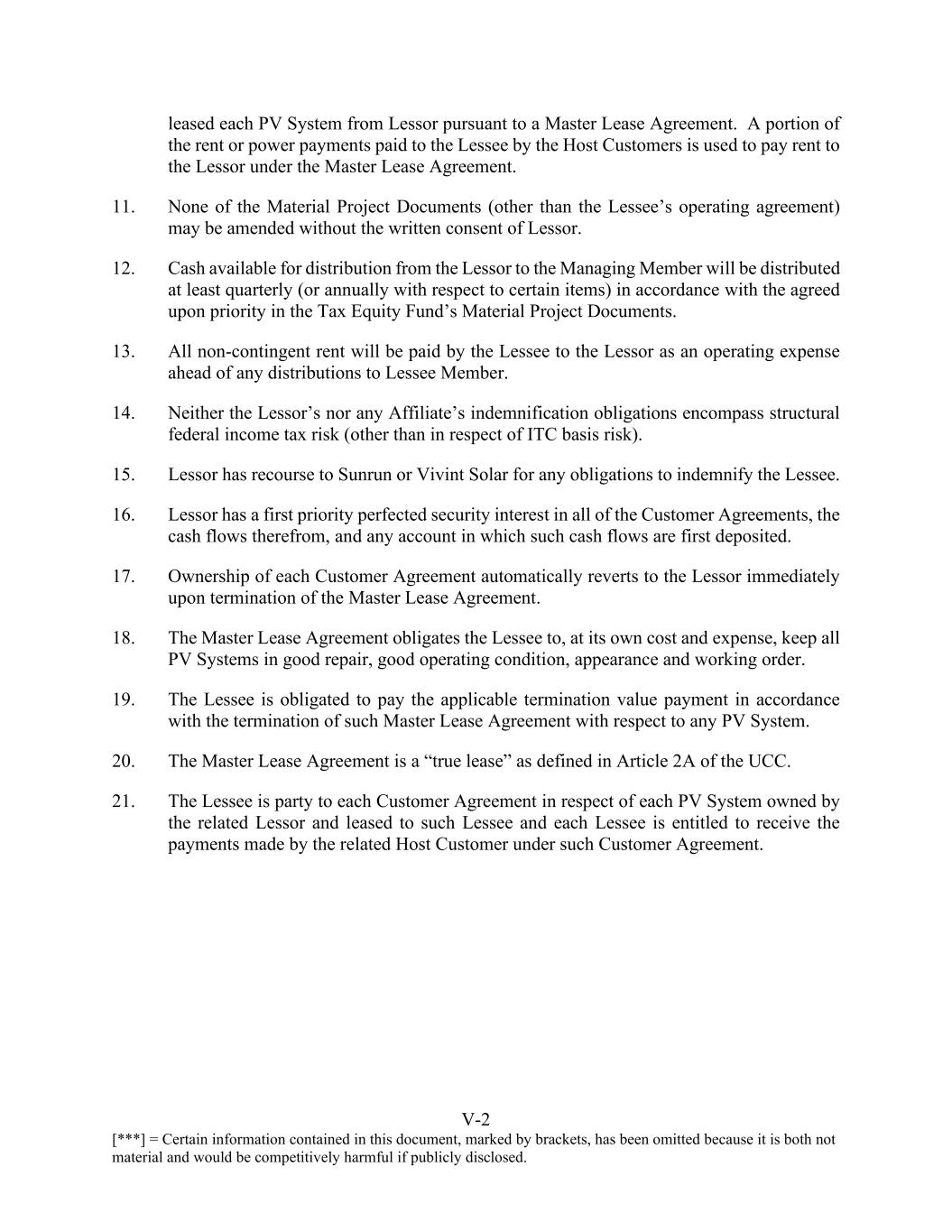 V-2 [***] = Certain information contained in this document, marked by brackets, has been omitted because it is both not material and would be competitively harmful if publicly disclosed. leased each PV System from Lessor pursuant to a Master Lease Agreement. A portion of the rent or power payments paid to the Lessee by the Host Customers is used to pay rent to the Lessor under the Master Lease Agreement. 11. None of the Material Project Documents (other than the Lessee’s operating agreement) may be amended without the written consent of Lessor. 12. Cash available for distribution from the Lessor to the Managing Member will be distributed at least quarterly (or annually with respect to certain items) in accordance with the agreed upon priority in the Tax Equity Fund’s Material Project Documents. 13. All non-contingent rent will be paid by the Lessee to the Lessor as an operating expense ahead of any distributions to Lessee Member. 14. Neither the Lessor’s nor any Affiliate’s indemnification obligations encompass structural federal income tax risk (other than in respect of ITC basis risk). 15. Lessor has recourse to Sunrun or Vivint Solar for any obligations to indemnify the Lessee. 16. Lessor has a first priority perfected security interest in all of the Customer Agreements, the cash flows therefrom, and any account in which such cash flows are first deposited. 17. Ownership of each Customer Agreement automatically reverts to the Lessor immediately upon termination of the Master Lease Agreement. 18. The Master Lease Agreement obligates the Lessee to, at its own cost and expense, keep all PV Systems in good repair, good operating condition, appearance and working order. 19. The Lessee is obligated to pay the applicable termination value payment in accordance with the termination of such Master Lease Agreement with respect to any PV System. 20. The Master Lease Agreement is a “true lease” as defined in Article 2A of the UCC. 21. The Lessee is party to each Customer Agreement in respect of each PV System owned by the related Lessor and leased to such Lessee and each Lessee is entitled to receive the payments made by the related Host Customer under such Customer Agreement.