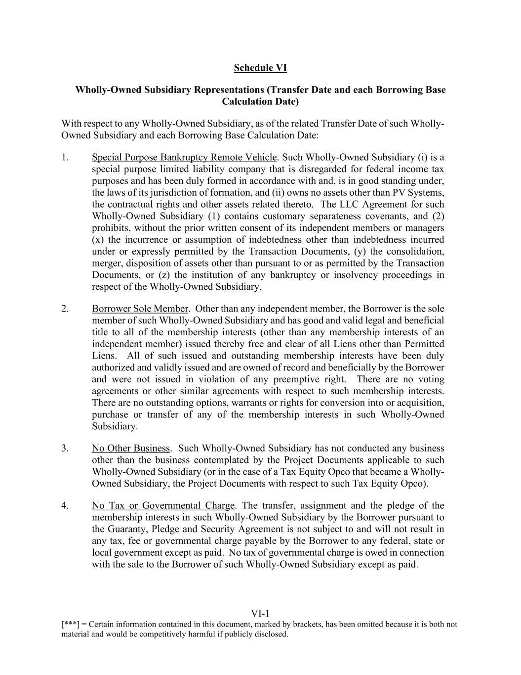 VI-1 [***] = Certain information contained in this document, marked by brackets, has been omitted because it is both not material and would be competitively harmful if publicly disclosed. Schedule VI Wholly-Owned Subsidiary Representations (Transfer Date and each Borrowing Base Calculation Date) With respect to any Wholly-Owned Subsidiary, as of the related Transfer Date of such Wholly- Owned Subsidiary and each Borrowing Base Calculation Date: 1. Special Purpose Bankruptcy Remote Vehicle. Such Wholly-Owned Subsidiary (i) is a special purpose limited liability company that is disregarded for federal income tax purposes and has been duly formed in accordance with and, is in good standing under, the laws of its jurisdiction of formation, and (ii) owns no assets other than PV Systems, the contractual rights and other assets related thereto. The LLC Agreement for such Wholly-Owned Subsidiary (1) contains customary separateness covenants, and (2) prohibits, without the prior written consent of its independent members or managers (x) the incurrence or assumption of indebtedness other than indebtedness incurred under or expressly permitted by the Transaction Documents, (y) the consolidation, merger, disposition of assets other than pursuant to or as permitted by the Transaction Documents, or (z) the institution of any bankruptcy or insolvency proceedings in respect of the Wholly-Owned Subsidiary. 2. Borrower Sole Member. Other than any independent member, the Borrower is the sole member of such Wholly-Owned Subsidiary and has good and valid legal and beneficial title to all of the membership interests (other than any membership interests of an independent member) issued thereby free and clear of all Liens other than Permitted Liens. All of such issued and outstanding membership interests have been duly authorized and validly issued and are owned of record and beneficially by the Borrower and were not issued in violation of any preemptive right. There are no voting agreements or other similar agreements with respect to such membership interests. There are no outstanding options, warrants or rights for conversion into or acquisition, purchase or transfer of any of the membership interests in such Wholly-Owned Subsidiary. 3. No Other Business. Such Wholly-Owned Subsidiary has not conducted any business other than the business contemplated by the Project Documents applicable to such Wholly-Owned Subsidiary (or in the case of a Tax Equity Opco that became a Wholly- Owned Subsidiary, the Project Documents with respect to such Tax Equity Opco). 4. No Tax or Governmental Charge. The transfer, assignment and the pledge of the membership interests in such Wholly-Owned Subsidiary by the Borrower pursuant to the Guaranty, Pledge and Security Agreement is not subject to and will not result in any tax, fee or governmental charge payable by the Borrower to any federal, state or local government except as paid. No tax of governmental charge is owed in connection with the sale to the Borrower of such Wholly-Owned Subsidiary except as paid.