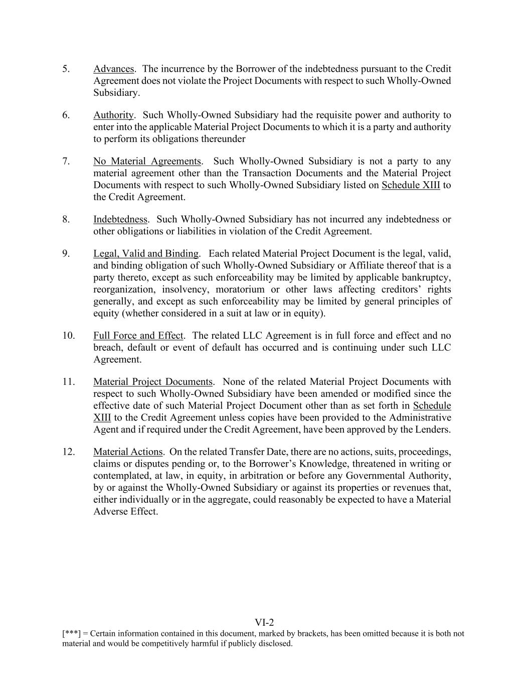 VI-2 [***] = Certain information contained in this document, marked by brackets, has been omitted because it is both not material and would be competitively harmful if publicly disclosed. 5. Advances. The incurrence by the Borrower of the indebtedness pursuant to the Credit Agreement does not violate the Project Documents with respect to such Wholly-Owned Subsidiary. 6. Authority. Such Wholly-Owned Subsidiary had the requisite power and authority to enter into the applicable Material Project Documents to which it is a party and authority to perform its obligations thereunder 7. No Material Agreements. Such Wholly-Owned Subsidiary is not a party to any material agreement other than the Transaction Documents and the Material Project Documents with respect to such Wholly-Owned Subsidiary listed on Schedule XIII to the Credit Agreement. 8. Indebtedness. Such Wholly-Owned Subsidiary has not incurred any indebtedness or other obligations or liabilities in violation of the Credit Agreement. 9. Legal, Valid and Binding. Each related Material Project Document is the legal, valid, and binding obligation of such Wholly-Owned Subsidiary or Affiliate thereof that is a party thereto, except as such enforceability may be limited by applicable bankruptcy, reorganization, insolvency, moratorium or other laws affecting creditors’ rights generally, and except as such enforceability may be limited by general principles of equity (whether considered in a suit at law or in equity). 10. Full Force and Effect. The related LLC Agreement is in full force and effect and no breach, default or event of default has occurred and is continuing under such LLC Agreement. 11. Material Project Documents. None of the related Material Project Documents with respect to such Wholly-Owned Subsidiary have been amended or modified since the effective date of such Material Project Document other than as set forth in Schedule XIII to the Credit Agreement unless copies have been provided to the Administrative Agent and if required under the Credit Agreement, have been approved by the Lenders. 12. Material Actions. On the related Transfer Date, there are no actions, suits, proceedings, claims or disputes pending or, to the Borrower’s Knowledge, threatened in writing or contemplated, at law, in equity, in arbitration or before any Governmental Authority, by or against the Wholly-Owned Subsidiary or against its properties or revenues that, either individually or in the aggregate, could reasonably be expected to have a Material Adverse Effect.