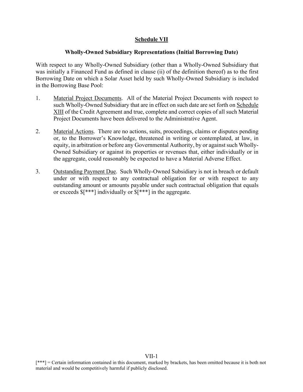 VII-1 [***] = Certain information contained in this document, marked by brackets, has been omitted because it is both not material and would be competitively harmful if publicly disclosed. Schedule VII Wholly-Owned Subsidiary Representations (Initial Borrowing Date) With respect to any Wholly-Owned Subsidiary (other than a Wholly-Owned Subsidiary that was initially a Financed Fund as defined in clause (ii) of the definition thereof) as to the first Borrowing Date on which a Solar Asset held by such Wholly-Owned Subsidiary is included in the Borrowing Base Pool: 1. Material Project Documents. All of the Material Project Documents with respect to such Wholly-Owned Subsidiary that are in effect on such date are set forth on Schedule XIII of the Credit Agreement and true, complete and correct copies of all such Material Project Documents have been delivered to the Administrative Agent. 2. Material Actions. There are no actions, suits, proceedings, claims or disputes pending or, to the Borrower’s Knowledge, threatened in writing or contemplated, at law, in equity, in arbitration or before any Governmental Authority, by or against such Wholly- Owned Subsidiary or against its properties or revenues that, either individually or in the aggregate, could reasonably be expected to have a Material Adverse Effect. 3. Outstanding Payment Due. Such Wholly-Owned Subsidiary is not in breach or default under or with respect to any contractual obligation for or with respect to any outstanding amount or amounts payable under such contractual obligation that equals or exceeds $[***] individually or $[***] in the aggregate.