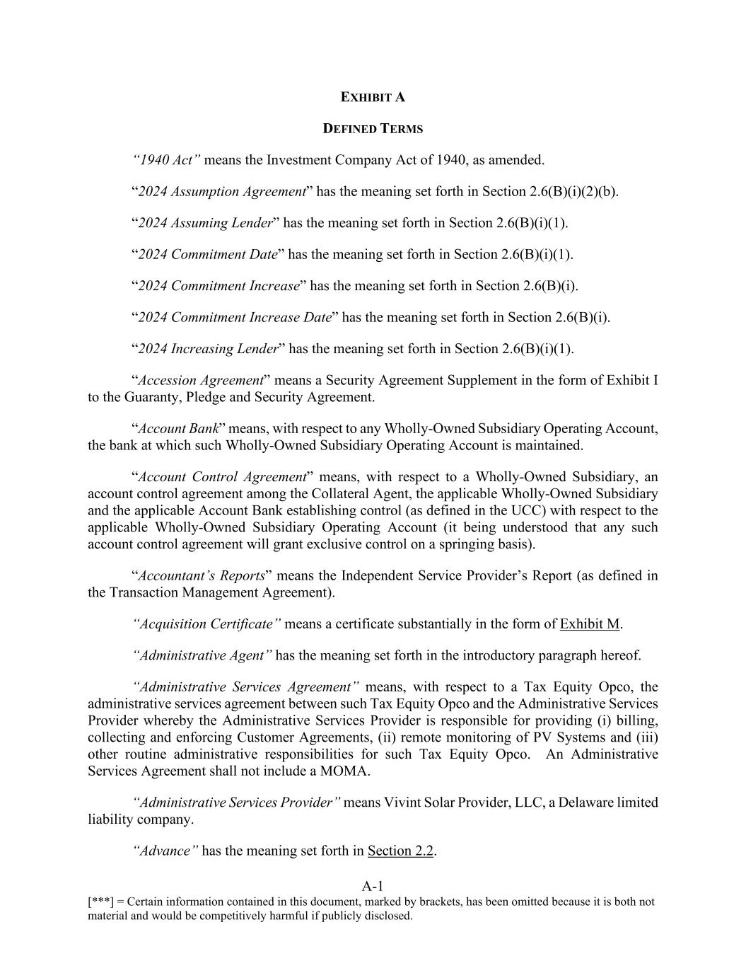 A-1 [***] = Certain information contained in this document, marked by brackets, has been omitted because it is both not material and would be competitively harmful if publicly disclosed. EXHIBIT A DEFINED TERMS “1940 Act” means the Investment Company Act of 1940, as amended. “2024 Assumption Agreement” has the meaning set forth in Section 2.6(B)(i)(2)(b). “2024 Assuming Lender” has the meaning set forth in Section 2.6(B)(i)(1). “2024 Commitment Date” has the meaning set forth in Section 2.6(B)(i)(1). “2024 Commitment Increase” has the meaning set forth in Section 2.6(B)(i). “2024 Commitment Increase Date” has the meaning set forth in Section 2.6(B)(i). “2024 Increasing Lender” has the meaning set forth in Section 2.6(B)(i)(1). “Accession Agreement” means a Security Agreement Supplement in the form of Exhibit I to the Guaranty, Pledge and Security Agreement. “Account Bank” means, with respect to any Wholly-Owned Subsidiary Operating Account, the bank at which such Wholly-Owned Subsidiary Operating Account is maintained. “Account Control Agreement” means, with respect to a Wholly-Owned Subsidiary, an account control agreement among the Collateral Agent, the applicable Wholly-Owned Subsidiary and the applicable Account Bank establishing control (as defined in the UCC) with respect to the applicable Wholly-Owned Subsidiary Operating Account (it being understood that any such account control agreement will grant exclusive control on a springing basis). “Accountant’s Reports” means the Independent Service Provider’s Report (as defined in the Transaction Management Agreement). “Acquisition Certificate” means a certificate substantially in the form of Exhibit M. “Administrative Agent” has the meaning set forth in the introductory paragraph hereof. “Administrative Services Agreement” means, with respect to a Tax Equity Opco, the administrative services agreement between such Tax Equity Opco and the Administrative Services Provider whereby the Administrative Services Provider is responsible for providing (i) billing, collecting and enforcing Customer Agreements, (ii) remote monitoring of PV Systems and (iii) other routine administrative responsibilities for such Tax Equity Opco. An Administrative Services Agreement shall not include a MOMA. “Administrative Services Provider” means Vivint Solar Provider, LLC, a Delaware limited liability company. “Advance” has the meaning set forth in Section 2.2.