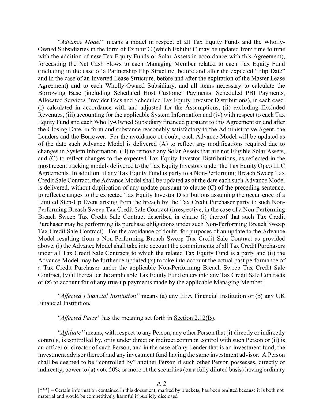 A-2 [***] = Certain information contained in this document, marked by brackets, has been omitted because it is both not material and would be competitively harmful if publicly disclosed. “Advance Model” means a model in respect of all Tax Equity Funds and the Wholly- Owned Subsidiaries in the form of Exhibit C (which Exhibit C may be updated from time to time with the addition of new Tax Equity Funds or Solar Assets in accordance with this Agreement), forecasting the Net Cash Flows to each Managing Member related to each Tax Equity Fund (including in the case of a Partnership Flip Structure, before and after the expected “Flip Date” and in the case of an Inverted Lease Structure, before and after the expiration of the Master Lease Agreement) and to each Wholly-Owned Subsidiary, and all items necessary to calculate the Borrowing Base (including Scheduled Host Customer Payments, Scheduled PBI Payments, Allocated Services Provider Fees and Scheduled Tax Equity Investor Distributions), in each case: (i) calculated in accordance with and adjusted for the Assumptions, (ii) excluding Excluded Revenues, (iii) accounting for the applicable System Information and (iv) with respect to each Tax Equity Fund and each Wholly-Owned Subsidiary financed pursuant to this Agreement on and after the Closing Date, in form and substance reasonably satisfactory to the Administrative Agent, the Lenders and the Borrower. For the avoidance of doubt, each Advance Model will be updated as of the date such Advance Model is delivered (A) to reflect any modifications required due to changes in System Information, (B) to remove any Solar Assets that are not Eligible Solar Assets, and (C) to reflect changes to the expected Tax Equity Investor Distributions, as reflected in the most recent tracking models delivered to the Tax Equity Investors under the Tax Equity Opco LLC Agreements. In addition, if any Tax Equity Fund is party to a Non-Performing Breach Sweep Tax Credit Sale Contract, the Advance Model shall be updated as of the date each such Advance Model is delivered, without duplication of any update pursuant to clause (C) of the preceding sentence, to reflect changes to the expected Tax Equity Investor Distributions assuming the occurrence of a Limited Step-Up Event arising from the breach by the Tax Credit Purchaser party to such Non- Performing Breach Sweep Tax Credit Sale Contract (irrespective, in the case of a Non-Performing Breach Sweep Tax Credit Sale Contract described in clause (i) thereof that such Tax Credit Purchaser may be performing its purchase obligations under such Non-Performing Breach Sweep Tax Credit Sale Contract). For the avoidance of doubt, for purposes of an update to the Advance Model resulting from a Non-Performing Breach Sweep Tax Credit Sale Contract as provided above, (i) the Advance Model shall take into account the commitments of all Tax Credit Purchasers under all Tax Credit Sale Contracts to which the related Tax Equity Fund is a party and (ii) the Advance Model may be further re-updated (x) to take into account the actual past performance of a Tax Credit Purchaser under the applicable Non-Performing Breach Sweep Tax Credit Sale Contract, (y) if thereafter the applicable Tax Equity Fund enters into any Tax Credit Sale Contracts or (z) to account for of any true-up payments made by the applicable Managing Member. “Affected Financial Institution” means (a) any EEA Financial Institution or (b) any UK Financial Institution. “Affected Party” has the meaning set forth in Section 2.12(B). “Affiliate” means, with respect to any Person, any other Person that (i) directly or indirectly controls, is controlled by, or is under direct or indirect common control with such Person or (ii) is an officer or director of such Person, and in the case of any Lender that is an investment fund, the investment advisor thereof and any investment fund having the same investment advisor. A Person shall be deemed to be “controlled by” another Person if such other Person possesses, directly or indirectly, power to (a) vote 50% or more of the securities (on a fully diluted basis) having ordinary