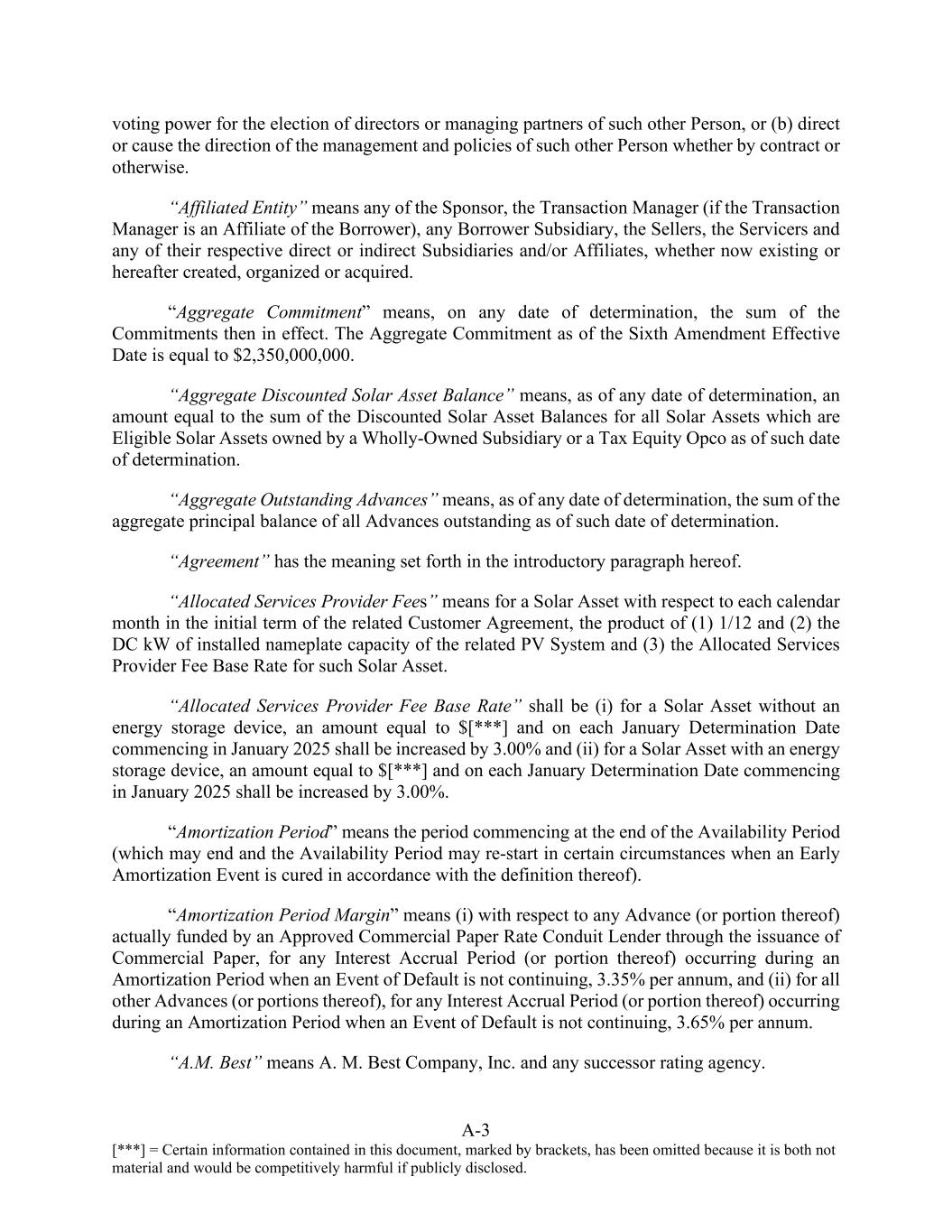 A-3 [***] = Certain information contained in this document, marked by brackets, has been omitted because it is both not material and would be competitively harmful if publicly disclosed. voting power for the election of directors or managing partners of such other Person, or (b) direct or cause the direction of the management and policies of such other Person whether by contract or otherwise. “Affiliated Entity” means any of the Sponsor, the Transaction Manager (if the Transaction Manager is an Affiliate of the Borrower), any Borrower Subsidiary, the Sellers, the Servicers and any of their respective direct or indirect Subsidiaries and/or Affiliates, whether now existing or hereafter created, organized or acquired. “Aggregate Commitment” means, on any date of determination, the sum of the Commitments then in effect. The Aggregate Commitment as of the Sixth Amendment Effective Date is equal to $2,350,000,000. “Aggregate Discounted Solar Asset Balance” means, as of any date of determination, an amount equal to the sum of the Discounted Solar Asset Balances for all Solar Assets which are Eligible Solar Assets owned by a Wholly-Owned Subsidiary or a Tax Equity Opco as of such date of determination. “Aggregate Outstanding Advances” means, as of any date of determination, the sum of the aggregate principal balance of all Advances outstanding as of such date of determination. “Agreement” has the meaning set forth in the introductory paragraph hereof. “Allocated Services Provider Fees” means for a Solar Asset with respect to each calendar month in the initial term of the related Customer Agreement, the product of (1) 1/12 and (2) the DC kW of installed nameplate capacity of the related PV System and (3) the Allocated Services Provider Fee Base Rate for such Solar Asset. “Allocated Services Provider Fee Base Rate” shall be (i) for a Solar Asset without an energy storage device, an amount equal to $[***] and on each January Determination Date commencing in January 2025 shall be increased by 3.00% and (ii) for a Solar Asset with an energy storage device, an amount equal to $[***] and on each January Determination Date commencing in January 2025 shall be increased by 3.00%. “Amortization Period” means the period commencing at the end of the Availability Period (which may end and the Availability Period may re-start in certain circumstances when an Early Amortization Event is cured in accordance with the definition thereof). “Amortization Period Margin” means (i) with respect to any Advance (or portion thereof) actually funded by an Approved Commercial Paper Rate Conduit Lender through the issuance of Commercial Paper, for any Interest Accrual Period (or portion thereof) occurring during an Amortization Period when an Event of Default is not continuing, 3.35% per annum, and (ii) for all other Advances (or portions thereof), for any Interest Accrual Period (or portion thereof) occurring during an Amortization Period when an Event of Default is not continuing, 3.65% per annum. “A.M. Best” means A. M. Best Company, Inc. and any successor rating agency.