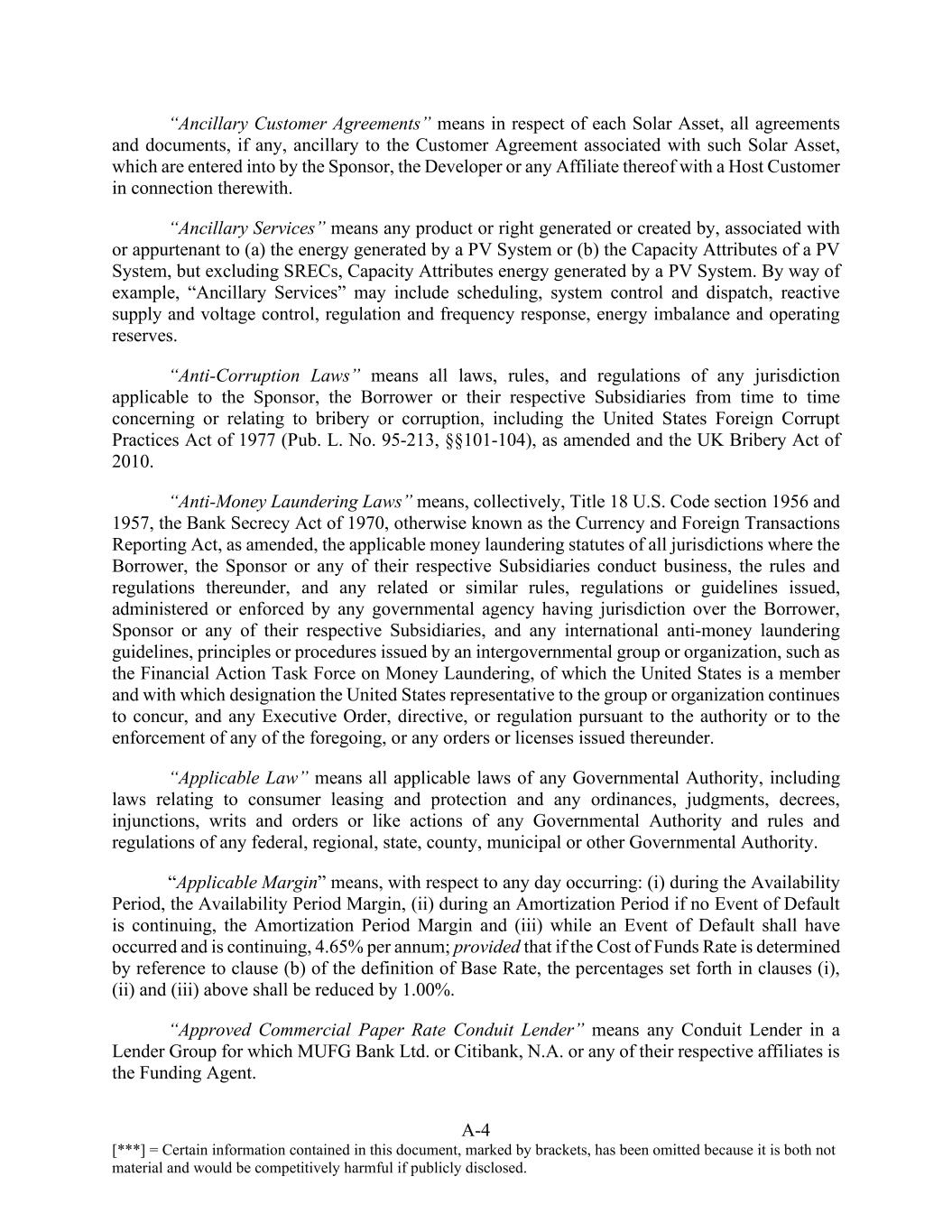 A-4 [***] = Certain information contained in this document, marked by brackets, has been omitted because it is both not material and would be competitively harmful if publicly disclosed. “Ancillary Customer Agreements” means in respect of each Solar Asset, all agreements and documents, if any, ancillary to the Customer Agreement associated with such Solar Asset, which are entered into by the Sponsor, the Developer or any Affiliate thereof with a Host Customer in connection therewith. “Ancillary Services” means any product or right generated or created by, associated with or appurtenant to (a) the energy generated by a PV System or (b) the Capacity Attributes of a PV System, but excluding SRECs, Capacity Attributes energy generated by a PV System. By way of example, “Ancillary Services” may include scheduling, system control and dispatch, reactive supply and voltage control, regulation and frequency response, energy imbalance and operating reserves. “Anti-Corruption Laws” means all laws, rules, and regulations of any jurisdiction applicable to the Sponsor, the Borrower or their respective Subsidiaries from time to time concerning or relating to bribery or corruption, including the United States Foreign Corrupt Practices Act of 1977 (Pub. L. No. 95-213, §§101-104), as amended and the UK Bribery Act of 2010. “Anti-Money Laundering Laws” means, collectively, Title 18 U.S. Code section 1956 and 1957, the Bank Secrecy Act of 1970, otherwise known as the Currency and Foreign Transactions Reporting Act, as amended, the applicable money laundering statutes of all jurisdictions where the Borrower, the Sponsor or any of their respective Subsidiaries conduct business, the rules and regulations thereunder, and any related or similar rules, regulations or guidelines issued, administered or enforced by any governmental agency having jurisdiction over the Borrower, Sponsor or any of their respective Subsidiaries, and any international anti-money laundering guidelines, principles or procedures issued by an intergovernmental group or organization, such as the Financial Action Task Force on Money Laundering, of which the United States is a member and with which designation the United States representative to the group or organization continues to concur, and any Executive Order, directive, or regulation pursuant to the authority or to the enforcement of any of the foregoing, or any orders or licenses issued thereunder. “Applicable Law” means all applicable laws of any Governmental Authority, including laws relating to consumer leasing and protection and any ordinances, judgments, decrees, injunctions, writs and orders or like actions of any Governmental Authority and rules and regulations of any federal, regional, state, county, municipal or other Governmental Authority. “Applicable Margin” means, with respect to any day occurring: (i) during the Availability Period, the Availability Period Margin, (ii) during an Amortization Period if no Event of Default is continuing, the Amortization Period Margin and (iii) while an Event of Default shall have occurred and is continuing, 4.65% per annum; provided that if the Cost of Funds Rate is determined by reference to clause (b) of the definition of Base Rate, the percentages set forth in clauses (i), (ii) and (iii) above shall be reduced by 1.00%. “Approved Commercial Paper Rate Conduit Lender” means any Conduit Lender in a Lender Group for which MUFG Bank Ltd. or Citibank, N.A. or any of their respective affiliates is the Funding Agent.