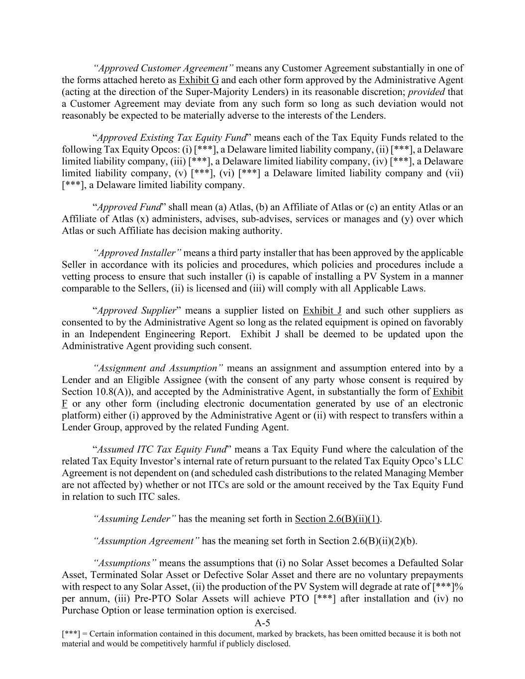 A-5 [***] = Certain information contained in this document, marked by brackets, has been omitted because it is both not material and would be competitively harmful if publicly disclosed. “Approved Customer Agreement” means any Customer Agreement substantially in one of the forms attached hereto as Exhibit G and each other form approved by the Administrative Agent (acting at the direction of the Super-Majority Lenders) in its reasonable discretion; provided that a Customer Agreement may deviate from any such form so long as such deviation would not reasonably be expected to be materially adverse to the interests of the Lenders. “Approved Existing Tax Equity Fund” means each of the Tax Equity Funds related to the following Tax Equity Opcos: (i) [***], a Delaware limited liability company, (ii) [***], a Delaware limited liability company, (iii) [***], a Delaware limited liability company, (iv) [***], a Delaware limited liability company, (v) [***], (vi) [***] a Delaware limited liability company and (vii) [***], a Delaware limited liability company. “Approved Fund” shall mean (a) Atlas, (b) an Affiliate of Atlas or (c) an entity Atlas or an Affiliate of Atlas (x) administers, advises, sub-advises, services or manages and (y) over which Atlas or such Affiliate has decision making authority. “Approved Installer” means a third party installer that has been approved by the applicable Seller in accordance with its policies and procedures, which policies and procedures include a vetting process to ensure that such installer (i) is capable of installing a PV System in a manner comparable to the Sellers, (ii) is licensed and (iii) will comply with all Applicable Laws. “Approved Supplier” means a supplier listed on Exhibit J and such other suppliers as consented to by the Administrative Agent so long as the related equipment is opined on favorably in an Independent Engineering Report. Exhibit J shall be deemed to be updated upon the Administrative Agent providing such consent. “Assignment and Assumption” means an assignment and assumption entered into by a Lender and an Eligible Assignee (with the consent of any party whose consent is required by Section 10.8(A)), and accepted by the Administrative Agent, in substantially the form of Exhibit F or any other form (including electronic documentation generated by use of an electronic platform) either (i) approved by the Administrative Agent or (ii) with respect to transfers within a Lender Group, approved by the related Funding Agent. “Assumed ITC Tax Equity Fund” means a Tax Equity Fund where the calculation of the related Tax Equity Investor’s internal rate of return pursuant to the related Tax Equity Opco’s LLC Agreement is not dependent on (and scheduled cash distributions to the related Managing Member are not affected by) whether or not ITCs are sold or the amount received by the Tax Equity Fund in relation to such ITC sales. “Assuming Lender” has the meaning set forth in Section 2.6(B)(ii)(1). “Assumption Agreement” has the meaning set forth in Section 2.6(B)(ii)(2)(b). “Assumptions” means the assumptions that (i) no Solar Asset becomes a Defaulted Solar Asset, Terminated Solar Asset or Defective Solar Asset and there are no voluntary prepayments with respect to any Solar Asset, (ii) the production of the PV System will degrade at rate of [***]% per annum, (iii) Pre-PTO Solar Assets will achieve PTO [***] after installation and (iv) no Purchase Option or lease termination option is exercised.