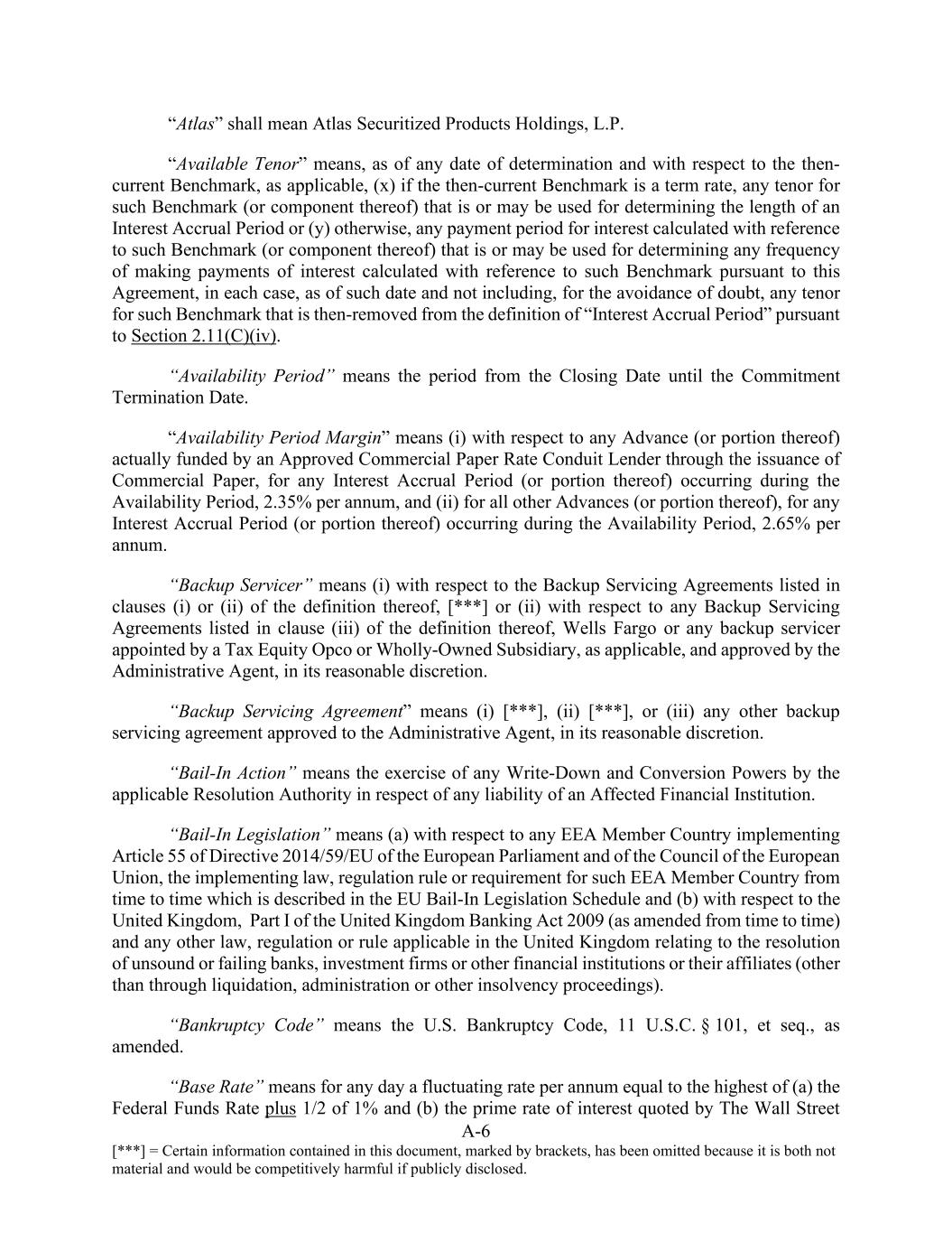 A-6 [***] = Certain information contained in this document, marked by brackets, has been omitted because it is both not material and would be competitively harmful if publicly disclosed. “Atlas” shall mean Atlas Securitized Products Holdings, L.P. “Available Tenor” means, as of any date of determination and with respect to the then- current Benchmark, as applicable, (x) if the then-current Benchmark is a term rate, any tenor for such Benchmark (or component thereof) that is or may be used for determining the length of an Interest Accrual Period or (y) otherwise, any payment period for interest calculated with reference to such Benchmark (or component thereof) that is or may be used for determining any frequency of making payments of interest calculated with reference to such Benchmark pursuant to this Agreement, in each case, as of such date and not including, for the avoidance of doubt, any tenor for such Benchmark that is then-removed from the definition of “Interest Accrual Period” pursuant to Section 2.11(C)(iv). “Availability Period” means the period from the Closing Date until the Commitment Termination Date. “Availability Period Margin” means (i) with respect to any Advance (or portion thereof) actually funded by an Approved Commercial Paper Rate Conduit Lender through the issuance of Commercial Paper, for any Interest Accrual Period (or portion thereof) occurring during the Availability Period, 2.35% per annum, and (ii) for all other Advances (or portion thereof), for any Interest Accrual Period (or portion thereof) occurring during the Availability Period, 2.65% per annum. “Backup Servicer” means (i) with respect to the Backup Servicing Agreements listed in clauses (i) or (ii) of the definition thereof, [***] or (ii) with respect to any Backup Servicing Agreements listed in clause (iii) of the definition thereof, Wells Fargo or any backup servicer appointed by a Tax Equity Opco or Wholly-Owned Subsidiary, as applicable, and approved by the Administrative Agent, in its reasonable discretion. “Backup Servicing Agreement” means (i) [***], (ii) [***], or (iii) any other backup servicing agreement approved to the Administrative Agent, in its reasonable discretion. “Bail-In Action” means the exercise of any Write-Down and Conversion Powers by the applicable Resolution Authority in respect of any liability of an Affected Financial Institution. “Bail-In Legislation” means (a) with respect to any EEA Member Country implementing Article 55 of Directive 2014/59/EU of the European Parliament and of the Council of the European Union, the implementing law, regulation rule or requirement for such EEA Member Country from time to time which is described in the EU Bail-In Legislation Schedule and (b) with respect to the United Kingdom, Part I of the United Kingdom Banking Act 2009 (as amended from time to time) and any other law, regulation or rule applicable in the United Kingdom relating to the resolution of unsound or failing banks, investment firms or other financial institutions or their affiliates (other than through liquidation, administration or other insolvency proceedings). “Bankruptcy Code” means the U.S. Bankruptcy Code, 11 U.S.C. § 101, et seq., as amended. “Base Rate” means for any day a fluctuating rate per annum equal to the highest of (a) the Federal Funds Rate plus 1/2 of 1% and (b) the prime rate of interest quoted by The Wall Street