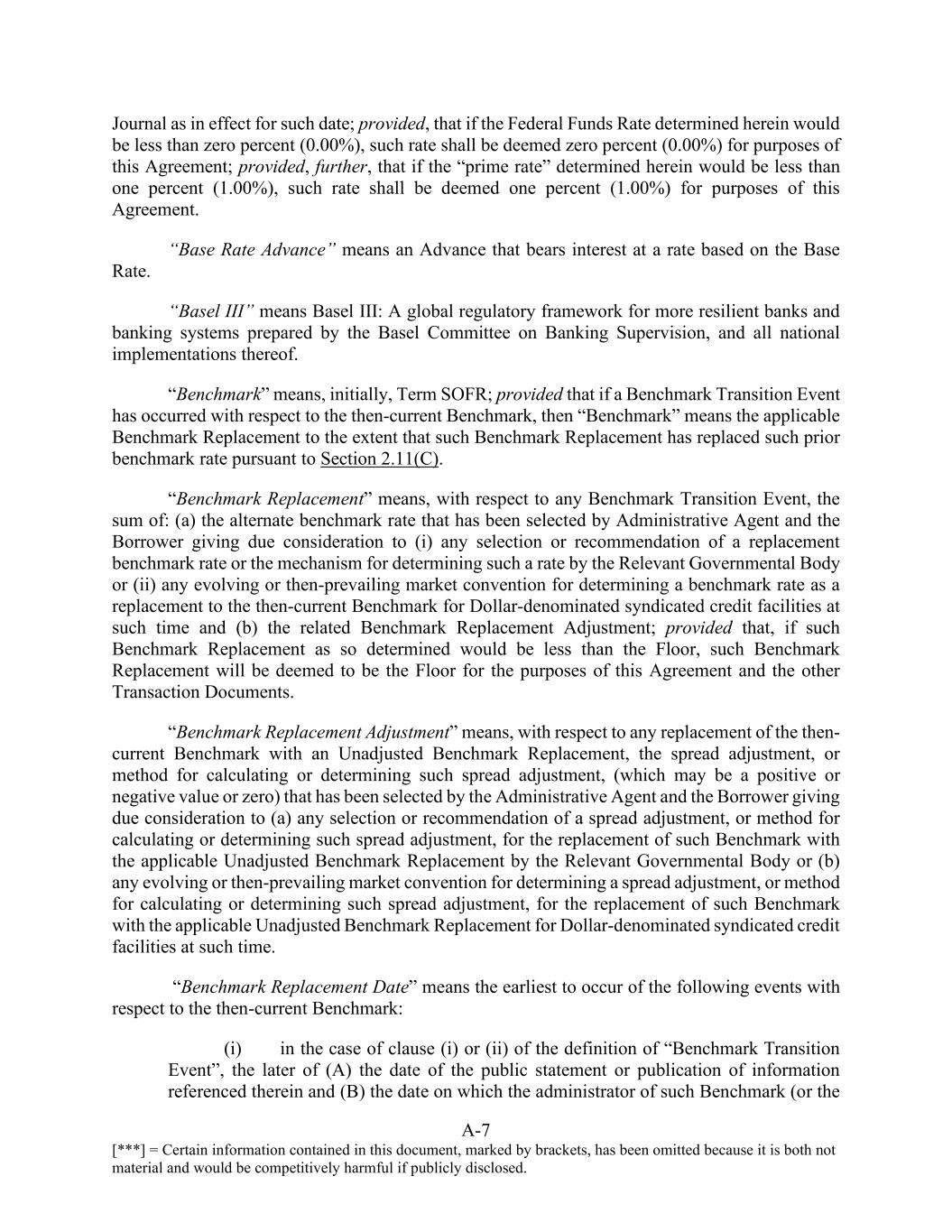 A-7 [***] = Certain information contained in this document, marked by brackets, has been omitted because it is both not material and would be competitively harmful if publicly disclosed. Journal as in effect for such date; provided, that if the Federal Funds Rate determined herein would be less than zero percent (0.00%), such rate shall be deemed zero percent (0.00%) for purposes of this Agreement; provided, further, that if the “prime rate” determined herein would be less than one percent (1.00%), such rate shall be deemed one percent (1.00%) for purposes of this Agreement. “Base Rate Advance” means an Advance that bears interest at a rate based on the Base Rate. “Basel III” means Basel III: A global regulatory framework for more resilient banks and banking systems prepared by the Basel Committee on Banking Supervision, and all national implementations thereof. “Benchmark” means, initially, Term SOFR; provided that if a Benchmark Transition Event has occurred with respect to the then-current Benchmark, then “Benchmark” means the applicable Benchmark Replacement to the extent that such Benchmark Replacement has replaced such prior benchmark rate pursuant to Section 2.11(C). “Benchmark Replacement” means, with respect to any Benchmark Transition Event, the sum of: (a) the alternate benchmark rate that has been selected by Administrative Agent and the Borrower giving due consideration to (i) any selection or recommendation of a replacement benchmark rate or the mechanism for determining such a rate by the Relevant Governmental Body or (ii) any evolving or then-prevailing market convention for determining a benchmark rate as a replacement to the then-current Benchmark for Dollar-denominated syndicated credit facilities at such time and (b) the related Benchmark Replacement Adjustment; provided that, if such Benchmark Replacement as so determined would be less than the Floor, such Benchmark Replacement will be deemed to be the Floor for the purposes of this Agreement and the other Transaction Documents. “Benchmark Replacement Adjustment” means, with respect to any replacement of the then- current Benchmark with an Unadjusted Benchmark Replacement, the spread adjustment, or method for calculating or determining such spread adjustment, (which may be a positive or negative value or zero) that has been selected by the Administrative Agent and the Borrower giving due consideration to (a) any selection or recommendation of a spread adjustment, or method for calculating or determining such spread adjustment, for the replacement of such Benchmark with the applicable Unadjusted Benchmark Replacement by the Relevant Governmental Body or (b) any evolving or then-prevailing market convention for determining a spread adjustment, or method for calculating or determining such spread adjustment, for the replacement of such Benchmark with the applicable Unadjusted Benchmark Replacement for Dollar-denominated syndicated credit facilities at such time. “Benchmark Replacement Date” means the earliest to occur of the following events with respect to the then-current Benchmark: (i) in the case of clause (i) or (ii) of the definition of “Benchmark Transition Event”, the later of (A) the date of the public statement or publication of information referenced therein and (B) the date on which the administrator of such Benchmark (or the
