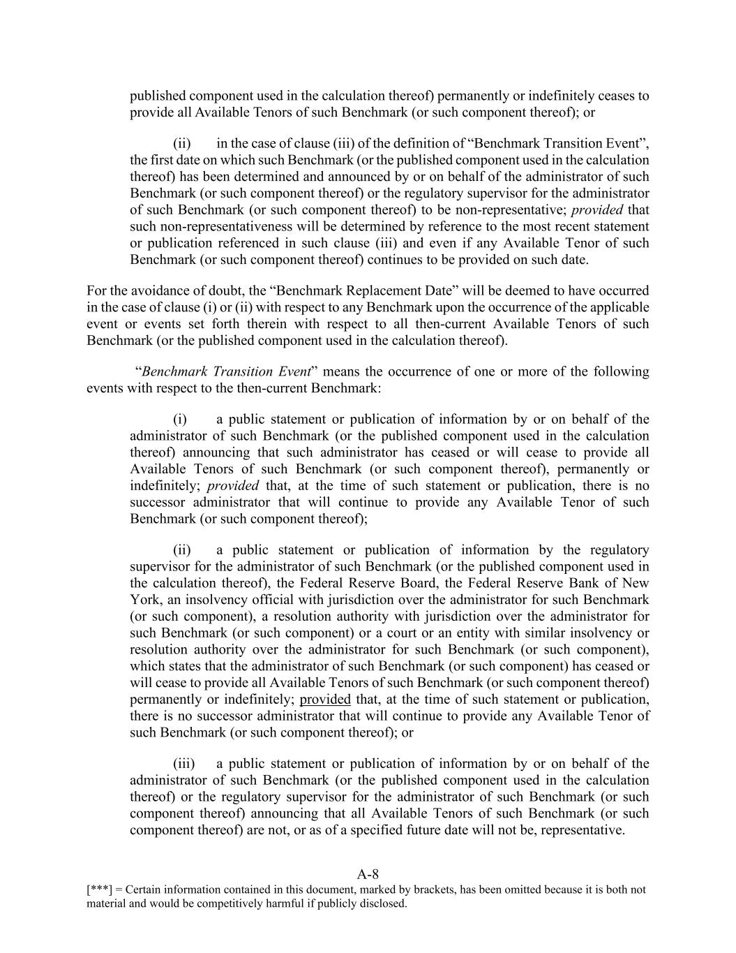 A-8 [***] = Certain information contained in this document, marked by brackets, has been omitted because it is both not material and would be competitively harmful if publicly disclosed. published component used in the calculation thereof) permanently or indefinitely ceases to provide all Available Tenors of such Benchmark (or such component thereof); or (ii) in the case of clause (iii) of the definition of “Benchmark Transition Event”, the first date on which such Benchmark (or the published component used in the calculation thereof) has been determined and announced by or on behalf of the administrator of such Benchmark (or such component thereof) or the regulatory supervisor for the administrator of such Benchmark (or such component thereof) to be non-representative; provided that such non-representativeness will be determined by reference to the most recent statement or publication referenced in such clause (iii) and even if any Available Tenor of such Benchmark (or such component thereof) continues to be provided on such date. For the avoidance of doubt, the “Benchmark Replacement Date” will be deemed to have occurred in the case of clause (i) or (ii) with respect to any Benchmark upon the occurrence of the applicable event or events set forth therein with respect to all then-current Available Tenors of such Benchmark (or the published component used in the calculation thereof). “Benchmark Transition Event” means the occurrence of one or more of the following events with respect to the then-current Benchmark: (i) a public statement or publication of information by or on behalf of the administrator of such Benchmark (or the published component used in the calculation thereof) announcing that such administrator has ceased or will cease to provide all Available Tenors of such Benchmark (or such component thereof), permanently or indefinitely; provided that, at the time of such statement or publication, there is no successor administrator that will continue to provide any Available Tenor of such Benchmark (or such component thereof); (ii) a public statement or publication of information by the regulatory supervisor for the administrator of such Benchmark (or the published component used in the calculation thereof), the Federal Reserve Board, the Federal Reserve Bank of New York, an insolvency official with jurisdiction over the administrator for such Benchmark (or such component), a resolution authority with jurisdiction over the administrator for such Benchmark (or such component) or a court or an entity with similar insolvency or resolution authority over the administrator for such Benchmark (or such component), which states that the administrator of such Benchmark (or such component) has ceased or will cease to provide all Available Tenors of such Benchmark (or such component thereof) permanently or indefinitely; provided that, at the time of such statement or publication, there is no successor administrator that will continue to provide any Available Tenor of such Benchmark (or such component thereof); or (iii) a public statement or publication of information by or on behalf of the administrator of such Benchmark (or the published component used in the calculation thereof) or the regulatory supervisor for the administrator of such Benchmark (or such component thereof) announcing that all Available Tenors of such Benchmark (or such component thereof) are not, or as of a specified future date will not be, representative.