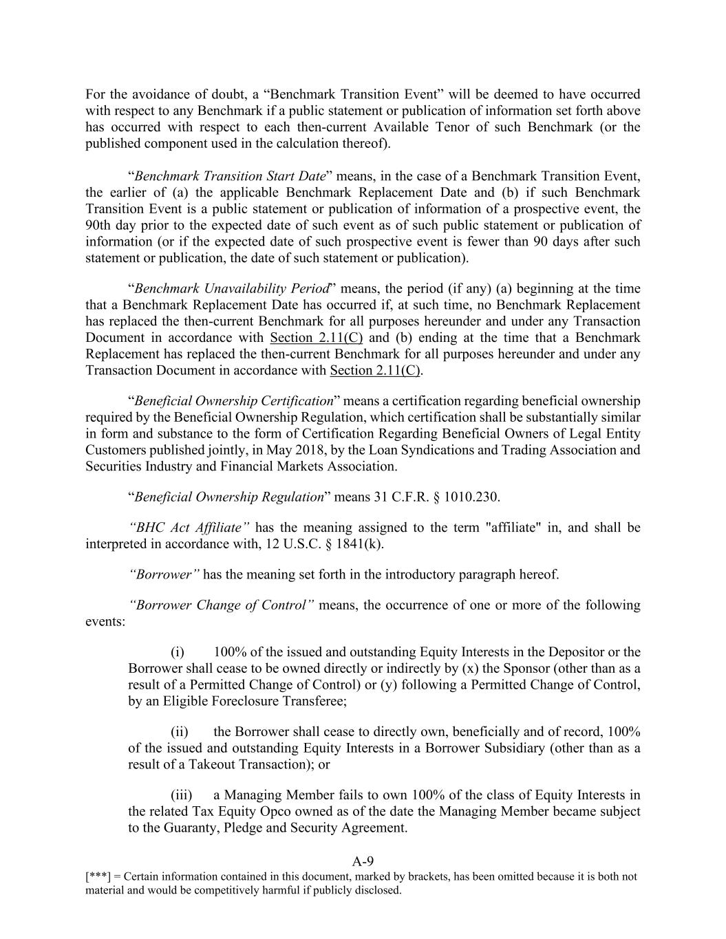 A-9 [***] = Certain information contained in this document, marked by brackets, has been omitted because it is both not material and would be competitively harmful if publicly disclosed. For the avoidance of doubt, a “Benchmark Transition Event” will be deemed to have occurred with respect to any Benchmark if a public statement or publication of information set forth above has occurred with respect to each then-current Available Tenor of such Benchmark (or the published component used in the calculation thereof). “Benchmark Transition Start Date” means, in the case of a Benchmark Transition Event, the earlier of (a) the applicable Benchmark Replacement Date and (b) if such Benchmark Transition Event is a public statement or publication of information of a prospective event, the 90th day prior to the expected date of such event as of such public statement or publication of information (or if the expected date of such prospective event is fewer than 90 days after such statement or publication, the date of such statement or publication). “Benchmark Unavailability Period” means, the period (if any) (a) beginning at the time that a Benchmark Replacement Date has occurred if, at such time, no Benchmark Replacement has replaced the then-current Benchmark for all purposes hereunder and under any Transaction Document in accordance with Section 2.11(C) and (b) ending at the time that a Benchmark Replacement has replaced the then-current Benchmark for all purposes hereunder and under any Transaction Document in accordance with Section 2.11(C). “Beneficial Ownership Certification” means a certification regarding beneficial ownership required by the Beneficial Ownership Regulation, which certification shall be substantially similar in form and substance to the form of Certification Regarding Beneficial Owners of Legal Entity Customers published jointly, in May 2018, by the Loan Syndications and Trading Association and Securities Industry and Financial Markets Association. “Beneficial Ownership Regulation” means 31 C.F.R. § 1010.230. “BHC Act Affiliate” has the meaning assigned to the term "affiliate" in, and shall be interpreted in accordance with, 12 U.S.C. § 1841(k). “Borrower” has the meaning set forth in the introductory paragraph hereof. “Borrower Change of Control” means, the occurrence of one or more of the following events: (i) 100% of the issued and outstanding Equity Interests in the Depositor or the Borrower shall cease to be owned directly or indirectly by (x) the Sponsor (other than as a result of a Permitted Change of Control) or (y) following a Permitted Change of Control, by an Eligible Foreclosure Transferee; (ii) the Borrower shall cease to directly own, beneficially and of record, 100% of the issued and outstanding Equity Interests in a Borrower Subsidiary (other than as a result of a Takeout Transaction); or (iii) a Managing Member fails to own 100% of the class of Equity Interests in the related Tax Equity Opco owned as of the date the Managing Member became subject to the Guaranty, Pledge and Security Agreement.