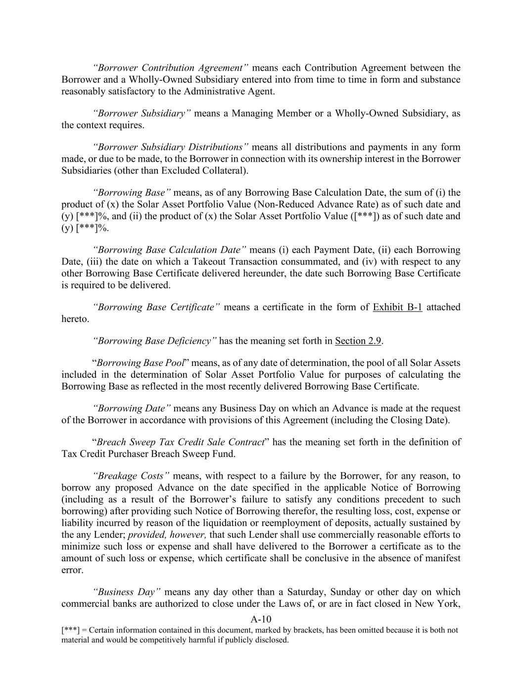 A-10 [***] = Certain information contained in this document, marked by brackets, has been omitted because it is both not material and would be competitively harmful if publicly disclosed. “Borrower Contribution Agreement” means each Contribution Agreement between the Borrower and a Wholly-Owned Subsidiary entered into from time to time in form and substance reasonably satisfactory to the Administrative Agent. “Borrower Subsidiary” means a Managing Member or a Wholly-Owned Subsidiary, as the context requires. “Borrower Subsidiary Distributions” means all distributions and payments in any form made, or due to be made, to the Borrower in connection with its ownership interest in the Borrower Subsidiaries (other than Excluded Collateral). “Borrowing Base” means, as of any Borrowing Base Calculation Date, the sum of (i) the product of (x) the Solar Asset Portfolio Value (Non-Reduced Advance Rate) as of such date and (y) [***]%, and (ii) the product of (x) the Solar Asset Portfolio Value ([***]) as of such date and (y) [***]%. “Borrowing Base Calculation Date” means (i) each Payment Date, (ii) each Borrowing Date, (iii) the date on which a Takeout Transaction consummated, and (iv) with respect to any other Borrowing Base Certificate delivered hereunder, the date such Borrowing Base Certificate is required to be delivered. “Borrowing Base Certificate” means a certificate in the form of Exhibit B-1 attached hereto. “Borrowing Base Deficiency” has the meaning set forth in Section 2.9. “Borrowing Base Pool” means, as of any date of determination, the pool of all Solar Assets included in the determination of Solar Asset Portfolio Value for purposes of calculating the Borrowing Base as reflected in the most recently delivered Borrowing Base Certificate. “Borrowing Date” means any Business Day on which an Advance is made at the request of the Borrower in accordance with provisions of this Agreement (including the Closing Date). “Breach Sweep Tax Credit Sale Contract” has the meaning set forth in the definition of Tax Credit Purchaser Breach Sweep Fund. “Breakage Costs” means, with respect to a failure by the Borrower, for any reason, to borrow any proposed Advance on the date specified in the applicable Notice of Borrowing (including as a result of the Borrower’s failure to satisfy any conditions precedent to such borrowing) after providing such Notice of Borrowing therefor, the resulting loss, cost, expense or liability incurred by reason of the liquidation or reemployment of deposits, actually sustained by the any Lender; provided, however, that such Lender shall use commercially reasonable efforts to minimize such loss or expense and shall have delivered to the Borrower a certificate as to the amount of such loss or expense, which certificate shall be conclusive in the absence of manifest error. “Business Day” means any day other than a Saturday, Sunday or other day on which commercial banks are authorized to close under the Laws of, or are in fact closed in New York,