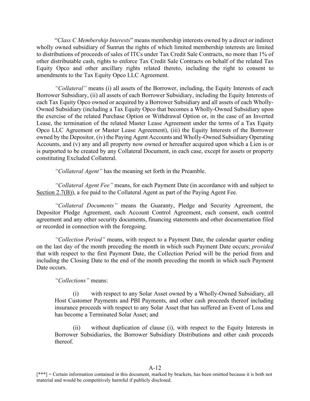A-12 [***] = Certain information contained in this document, marked by brackets, has been omitted because it is both not material and would be competitively harmful if publicly disclosed. “Class C Membership Interests” means membership interests owned by a direct or indirect wholly owned subsidiary of Sunrun the rights of which limited membership interests are limited to distributions of proceeds of sales of ITCs under Tax Credit Sale Contracts, no more than 1% of other distributable cash, rights to enforce Tax Credit Sale Contracts on behalf of the related Tax Equity Opco and other ancillary rights related thereto, including the right to consent to amendments to the Tax Equity Opco LLC Agreement. “Collateral” means (i) all assets of the Borrower, including, the Equity Interests of each Borrower Subsidiary, (ii) all assets of each Borrower Subsidiary, including the Equity Interests of each Tax Equity Opco owned or acquired by a Borrower Subsidiary and all assets of each Wholly- Owned Subsidiary (including a Tax Equity Opco that becomes a Wholly-Owned Subsidiary upon the exercise of the related Purchase Option or Withdrawal Option or, in the case of an Inverted Lease, the termination of the related Master Lease Agreement under the terms of a Tax Equity Opco LLC Agreement or Master Lease Agreement), (iii) the Equity Interests of the Borrower owned by the Depositor, (iv) the Paying Agent Accounts and Wholly-Owned Subsidiary Operating Accounts, and (v) any and all property now owned or hereafter acquired upon which a Lien is or is purported to be created by any Collateral Document, in each case, except for assets or property constituting Excluded Collateral. “Collateral Agent” has the meaning set forth in the Preamble. “Collateral Agent Fee” means, for each Payment Date (in accordance with and subject to Section 2.7(B)), a fee paid to the Collateral Agent as part of the Paying Agent Fee. “Collateral Documents” means the Guaranty, Pledge and Security Agreement, the Depositor Pledge Agreement, each Account Control Agreement, each consent, each control agreement and any other security documents, financing statements and other documentation filed or recorded in connection with the foregoing. “Collection Period” means, with respect to a Payment Date, the calendar quarter ending on the last day of the month preceding the month in which such Payment Date occurs; provided that with respect to the first Payment Date, the Collection Period will be the period from and including the Closing Date to the end of the month preceding the month in which such Payment Date occurs. “Collections” means: (i) with respect to any Solar Asset owned by a Wholly-Owned Subsidiary, all Host Customer Payments and PBI Payments, and other cash proceeds thereof including insurance proceeds with respect to any Solar Asset that has suffered an Event of Loss and has become a Terminated Solar Asset; and (ii) without duplication of clause (i), with respect to the Equity Interests in Borrower Subsidiaries, the Borrower Subsidiary Distributions and other cash proceeds thereof.