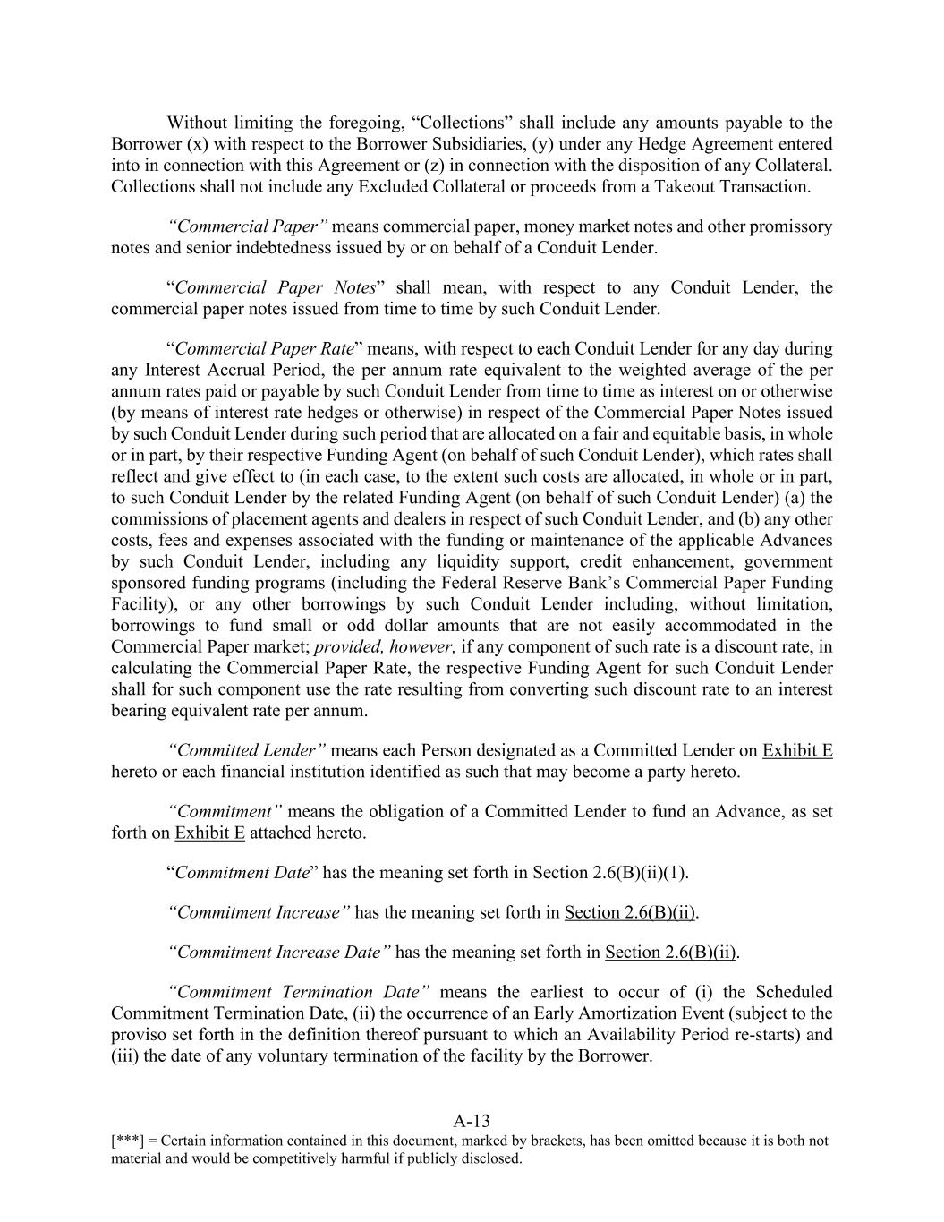 A-13 [***] = Certain information contained in this document, marked by brackets, has been omitted because it is both not material and would be competitively harmful if publicly disclosed. Without limiting the foregoing, “Collections” shall include any amounts payable to the Borrower (x) with respect to the Borrower Subsidiaries, (y) under any Hedge Agreement entered into in connection with this Agreement or (z) in connection with the disposition of any Collateral. Collections shall not include any Excluded Collateral or proceeds from a Takeout Transaction. “Commercial Paper” means commercial paper, money market notes and other promissory notes and senior indebtedness issued by or on behalf of a Conduit Lender. “Commercial Paper Notes” shall mean, with respect to any Conduit Lender, the commercial paper notes issued from time to time by such Conduit Lender. “Commercial Paper Rate” means, with respect to each Conduit Lender for any day during any Interest Accrual Period, the per annum rate equivalent to the weighted average of the per annum rates paid or payable by such Conduit Lender from time to time as interest on or otherwise (by means of interest rate hedges or otherwise) in respect of the Commercial Paper Notes issued by such Conduit Lender during such period that are allocated on a fair and equitable basis, in whole or in part, by their respective Funding Agent (on behalf of such Conduit Lender), which rates shall reflect and give effect to (in each case, to the extent such costs are allocated, in whole or in part, to such Conduit Lender by the related Funding Agent (on behalf of such Conduit Lender) (a) the commissions of placement agents and dealers in respect of such Conduit Lender, and (b) any other costs, fees and expenses associated with the funding or maintenance of the applicable Advances by such Conduit Lender, including any liquidity support, credit enhancement, government sponsored funding programs (including the Federal Reserve Bank’s Commercial Paper Funding Facility), or any other borrowings by such Conduit Lender including, without limitation, borrowings to fund small or odd dollar amounts that are not easily accommodated in the Commercial Paper market; provided, however, if any component of such rate is a discount rate, in calculating the Commercial Paper Rate, the respective Funding Agent for such Conduit Lender shall for such component use the rate resulting from converting such discount rate to an interest bearing equivalent rate per annum. “Committed Lender” means each Person designated as a Committed Lender on Exhibit E hereto or each financial institution identified as such that may become a party hereto. “Commitment” means the obligation of a Committed Lender to fund an Advance, as set forth on Exhibit E attached hereto. “Commitment Date” has the meaning set forth in Section 2.6(B)(ii)(1). “Commitment Increase” has the meaning set forth in Section 2.6(B)(ii). “Commitment Increase Date” has the meaning set forth in Section 2.6(B)(ii). “Commitment Termination Date” means the earliest to occur of (i) the Scheduled Commitment Termination Date, (ii) the occurrence of an Early Amortization Event (subject to the proviso set forth in the definition thereof pursuant to which an Availability Period re-starts) and (iii) the date of any voluntary termination of the facility by the Borrower.