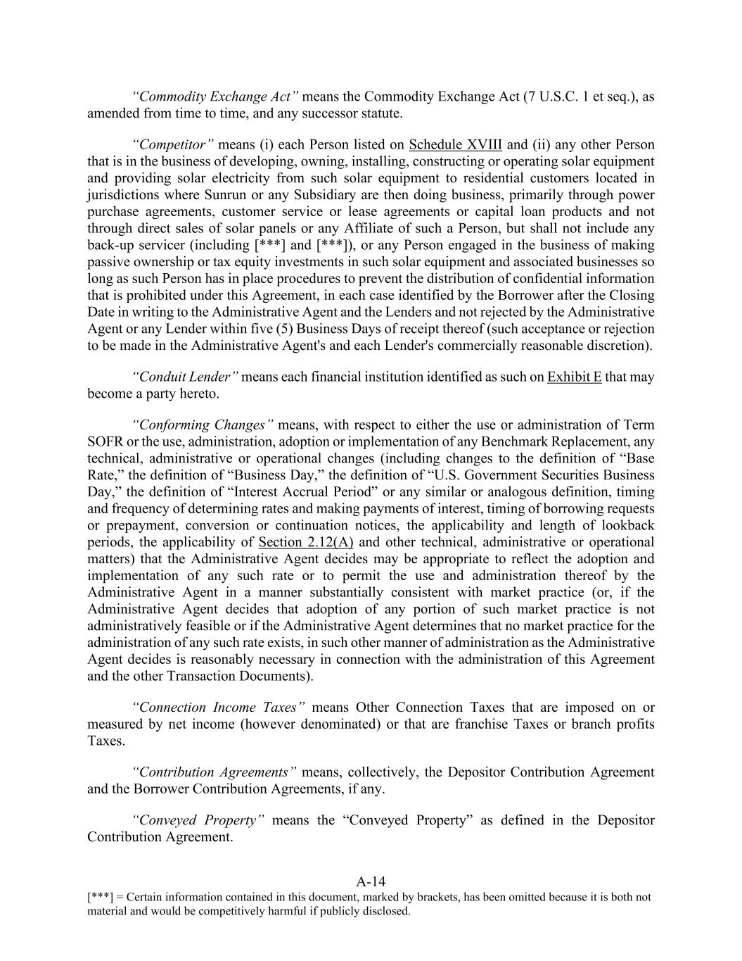A-14 [***] = Certain information contained in this document, marked by brackets, has been omitted because it is both not material and would be competitively harmful if publicly disclosed. “Commodity Exchange Act” means the Commodity Exchange Act (7 U.S.C. 1 et seq.), as amended from time to time, and any successor statute. “Competitor” means (i) each Person listed on Schedule XVIII and (ii) any other Person that is in the business of developing, owning, installing, constructing or operating solar equipment and providing solar electricity from such solar equipment to residential customers located in jurisdictions where Sunrun or any Subsidiary are then doing business, primarily through power purchase agreements, customer service or lease agreements or capital loan products and not through direct sales of solar panels or any Affiliate of such a Person, but shall not include any back-up servicer (including [***] and [***]), or any Person engaged in the business of making passive ownership or tax equity investments in such solar equipment and associated businesses so long as such Person has in place procedures to prevent the distribution of confidential information that is prohibited under this Agreement, in each case identified by the Borrower after the Closing Date in writing to the Administrative Agent and the Lenders and not rejected by the Administrative Agent or any Lender within five (5) Business Days of receipt thereof (such acceptance or rejection to be made in the Administrative Agent's and each Lender's commercially reasonable discretion). “Conduit Lender” means each financial institution identified as such on Exhibit E that may become a party hereto. “Conforming Changes” means, with respect to either the use or administration of Term SOFR or the use, administration, adoption or implementation of any Benchmark Replacement, any technical, administrative or operational changes (including changes to the definition of “Base Rate,” the definition of “Business Day,” the definition of “U.S. Government Securities Business Day,” the definition of “Interest Accrual Period” or any similar or analogous definition, timing and frequency of determining rates and making payments of interest, timing of borrowing requests or prepayment, conversion or continuation notices, the applicability and length of lookback periods, the applicability of Section 2.12(A) and other technical, administrative or operational matters) that the Administrative Agent decides may be appropriate to reflect the adoption and implementation of any such rate or to permit the use and administration thereof by the Administrative Agent in a manner substantially consistent with market practice (or, if the Administrative Agent decides that adoption of any portion of such market practice is not administratively feasible or if the Administrative Agent determines that no market practice for the administration of any such rate exists, in such other manner of administration as the Administrative Agent decides is reasonably necessary in connection with the administration of this Agreement and the other Transaction Documents). “Connection Income Taxes” means Other Connection Taxes that are imposed on or measured by net income (however denominated) or that are franchise Taxes or branch profits Taxes. “Contribution Agreements” means, collectively, the Depositor Contribution Agreement and the Borrower Contribution Agreements, if any. “Conveyed Property” means the “Conveyed Property” as defined in the Depositor Contribution Agreement.