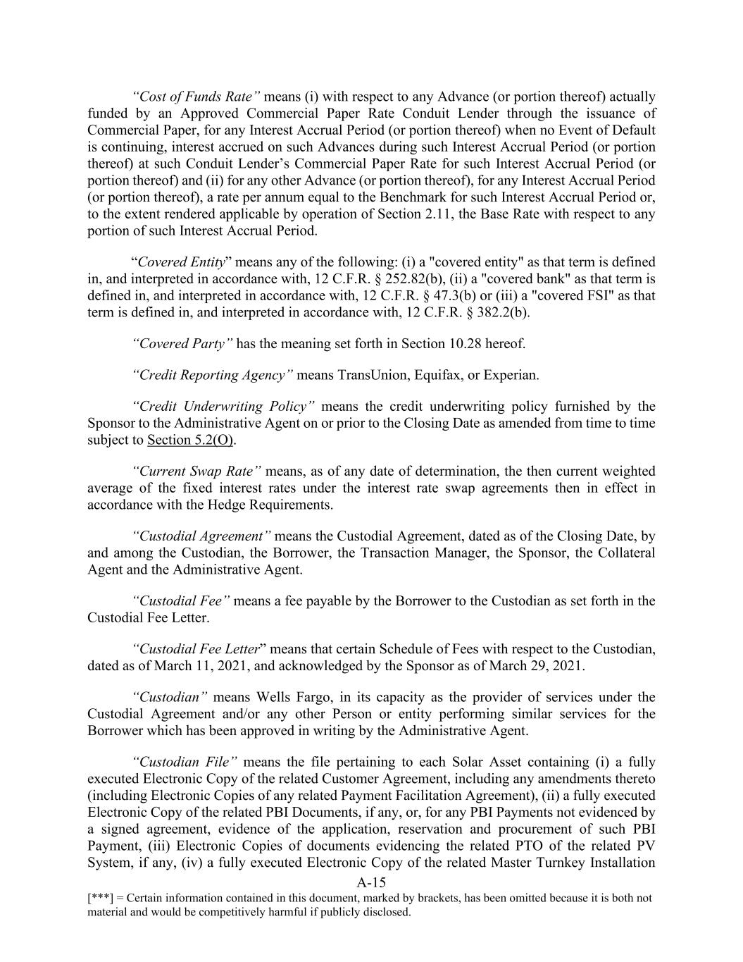 A-15 [***] = Certain information contained in this document, marked by brackets, has been omitted because it is both not material and would be competitively harmful if publicly disclosed. “Cost of Funds Rate” means (i) with respect to any Advance (or portion thereof) actually funded by an Approved Commercial Paper Rate Conduit Lender through the issuance of Commercial Paper, for any Interest Accrual Period (or portion thereof) when no Event of Default is continuing, interest accrued on such Advances during such Interest Accrual Period (or portion thereof) at such Conduit Lender’s Commercial Paper Rate for such Interest Accrual Period (or portion thereof) and (ii) for any other Advance (or portion thereof), for any Interest Accrual Period (or portion thereof), a rate per annum equal to the Benchmark for such Interest Accrual Period or, to the extent rendered applicable by operation of Section 2.11, the Base Rate with respect to any portion of such Interest Accrual Period. “Covered Entity” means any of the following: (i) a "covered entity" as that term is defined in, and interpreted in accordance with, 12 C.F.R. § 252.82(b), (ii) a "covered bank" as that term is defined in, and interpreted in accordance with, 12 C.F.R. § 47.3(b) or (iii) a "covered FSI" as that term is defined in, and interpreted in accordance with, 12 C.F.R. § 382.2(b). “Covered Party” has the meaning set forth in Section 10.28 hereof. “Credit Reporting Agency” means TransUnion, Equifax, or Experian. “Credit Underwriting Policy” means the credit underwriting policy furnished by the Sponsor to the Administrative Agent on or prior to the Closing Date as amended from time to time subject to Section 5.2(O). “Current Swap Rate” means, as of any date of determination, the then current weighted average of the fixed interest rates under the interest rate swap agreements then in effect in accordance with the Hedge Requirements. “Custodial Agreement” means the Custodial Agreement, dated as of the Closing Date, by and among the Custodian, the Borrower, the Transaction Manager, the Sponsor, the Collateral Agent and the Administrative Agent. “Custodial Fee” means a fee payable by the Borrower to the Custodian as set forth in the Custodial Fee Letter. “Custodial Fee Letter” means that certain Schedule of Fees with respect to the Custodian, dated as of March 11, 2021, and acknowledged by the Sponsor as of March 29, 2021. “Custodian” means Wells Fargo, in its capacity as the provider of services under the Custodial Agreement and/or any other Person or entity performing similar services for the Borrower which has been approved in writing by the Administrative Agent. “Custodian File” means the file pertaining to each Solar Asset containing (i) a fully executed Electronic Copy of the related Customer Agreement, including any amendments thereto (including Electronic Copies of any related Payment Facilitation Agreement), (ii) a fully executed Electronic Copy of the related PBI Documents, if any, or, for any PBI Payments not evidenced by a signed agreement, evidence of the application, reservation and procurement of such PBI Payment, (iii) Electronic Copies of documents evidencing the related PTO of the related PV System, if any, (iv) a fully executed Electronic Copy of the related Master Turnkey Installation
