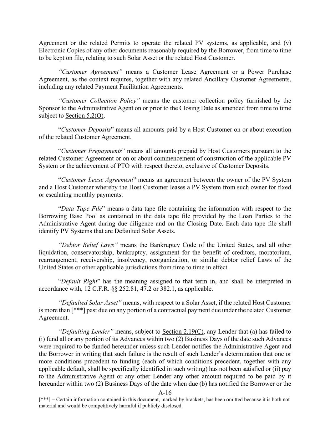 A-16 [***] = Certain information contained in this document, marked by brackets, has been omitted because it is both not material and would be competitively harmful if publicly disclosed. Agreement or the related Permits to operate the related PV systems, as applicable, and (v) Electronic Copies of any other documents reasonably required by the Borrower, from time to time to be kept on file, relating to such Solar Asset or the related Host Customer. “Customer Agreement” means a Customer Lease Agreement or a Power Purchase Agreement, as the context requires, together with any related Ancillary Customer Agreements, including any related Payment Facilitation Agreements. “Customer Collection Policy” means the customer collection policy furnished by the Sponsor to the Administrative Agent on or prior to the Closing Date as amended from time to time subject to Section 5.2(O). “Customer Deposits” means all amounts paid by a Host Customer on or about execution of the related Customer Agreement. “Customer Prepayments” means all amounts prepaid by Host Customers pursuant to the related Customer Agreement or on or about commencement of construction of the applicable PV System or the achievement of PTO with respect thereto, exclusive of Customer Deposits. “Customer Lease Agreement” means an agreement between the owner of the PV System and a Host Customer whereby the Host Customer leases a PV System from such owner for fixed or escalating monthly payments. “Data Tape File” means a data tape file containing the information with respect to the Borrowing Base Pool as contained in the data tape file provided by the Loan Parties to the Administrative Agent during due diligence and on the Closing Date. Each data tape file shall identify PV Systems that are Defaulted Solar Assets. “Debtor Relief Laws” means the Bankruptcy Code of the United States, and all other liquidation, conservatorship, bankruptcy, assignment for the benefit of creditors, moratorium, rearrangement, receivership, insolvency, reorganization, or similar debtor relief Laws of the United States or other applicable jurisdictions from time to time in effect. “Default Right” has the meaning assigned to that term in, and shall be interpreted in accordance with, 12 C.F.R. §§ 252.81, 47.2 or 382.1, as applicable. “Defaulted Solar Asset” means, with respect to a Solar Asset, if the related Host Customer is more than [***] past due on any portion of a contractual payment due under the related Customer Agreement. “Defaulting Lender” means, subject to Section 2.19(C), any Lender that (a) has failed to (i) fund all or any portion of its Advances within two (2) Business Days of the date such Advances were required to be funded hereunder unless such Lender notifies the Administrative Agent and the Borrower in writing that such failure is the result of such Lender’s determination that one or more conditions precedent to funding (each of which conditions precedent, together with any applicable default, shall be specifically identified in such writing) has not been satisfied or (ii) pay to the Administrative Agent or any other Lender any other amount required to be paid by it hereunder within two (2) Business Days of the date when due (b) has notified the Borrower or the