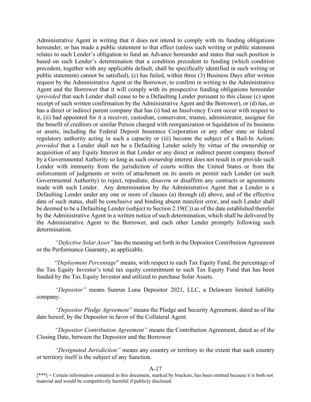 A-17 [***] = Certain information contained in this document, marked by brackets, has been omitted because it is both not material and would be competitively harmful if publicly disclosed. Administrative Agent in writing that it does not intend to comply with its funding obligations hereunder, or has made a public statement to that effect (unless such writing or public statement relates to such Lender’s obligation to fund an Advance hereunder and states that such position is based on such Lender’s determination that a condition precedent to funding (which condition precedent, together with any applicable default, shall be specifically identified in such writing or public statement) cannot be satisfied), (c) has failed, within three (3) Business Days after written request by the Administrative Agent or the Borrower, to confirm in writing to the Administrative Agent and the Borrower that it will comply with its prospective funding obligations hereunder (provided that such Lender shall cease to be a Defaulting Lender pursuant to this clause (c) upon receipt of such written confirmation by the Administrative Agent and the Borrower), or (d) has, or has a direct or indirect parent company that has (i) had an Insolvency Event occur with respect to it, (ii) had appointed for it a receiver, custodian, conservator, trustee, administrator, assignee for the benefit of creditors or similar Person charged with reorganization or liquidation of its business or assets, including the Federal Deposit Insurance Corporation or any other state or federal regulatory authority acting in such a capacity or (iii) become the subject of a Bail-In Action; provided that a Lender shall not be a Defaulting Lender solely by virtue of the ownership or acquisition of any Equity Interest in that Lender or any direct or indirect parent company thereof by a Governmental Authority so long as such ownership interest does not result in or provide such Lender with immunity from the jurisdiction of courts within the United States or from the enforcement of judgments or writs of attachment on its assets or permit such Lender (or such Governmental Authority) to reject, repudiate, disavow or disaffirm any contracts or agreements made with such Lender. Any determination by the Administrative Agent that a Lender is a Defaulting Lender under any one or more of clauses (a) through (d) above, and of the effective date of such status, shall be conclusive and binding absent manifest error, and such Lender shall be deemed to be a Defaulting Lender (subject to Section 2.19(C)) as of the date established therefor by the Administrative Agent in a written notice of such determination, which shall be delivered by the Administrative Agent to the Borrower, and each other Lender promptly following such determination. “Defective Solar Asset” has the meaning set forth in the Depositor Contribution Agreement or the Performance Guaranty, as applicable. “Deployment Percentage” means, with respect to each Tax Equity Fund, the percentage of the Tax Equity Investor’s total tax equity commitment to such Tax Equity Fund that has been funded by the Tax Equity Investor and utilized to purchase Solar Assets. “Depositor” means Sunrun Luna Depositor 2021, LLC, a Delaware limited liability company. “Depositor Pledge Agreement” means the Pledge and Security Agreement, dated as of the date hereof, by the Depositor in favor of the Collateral Agent. “Depositor Contribution Agreement” means the Contribution Agreement, dated as of the Closing Date, between the Depositor and the Borrower. “Designated Jurisdiction” means any country or territory to the extent that such country or territory itself is the subject of any Sanction.