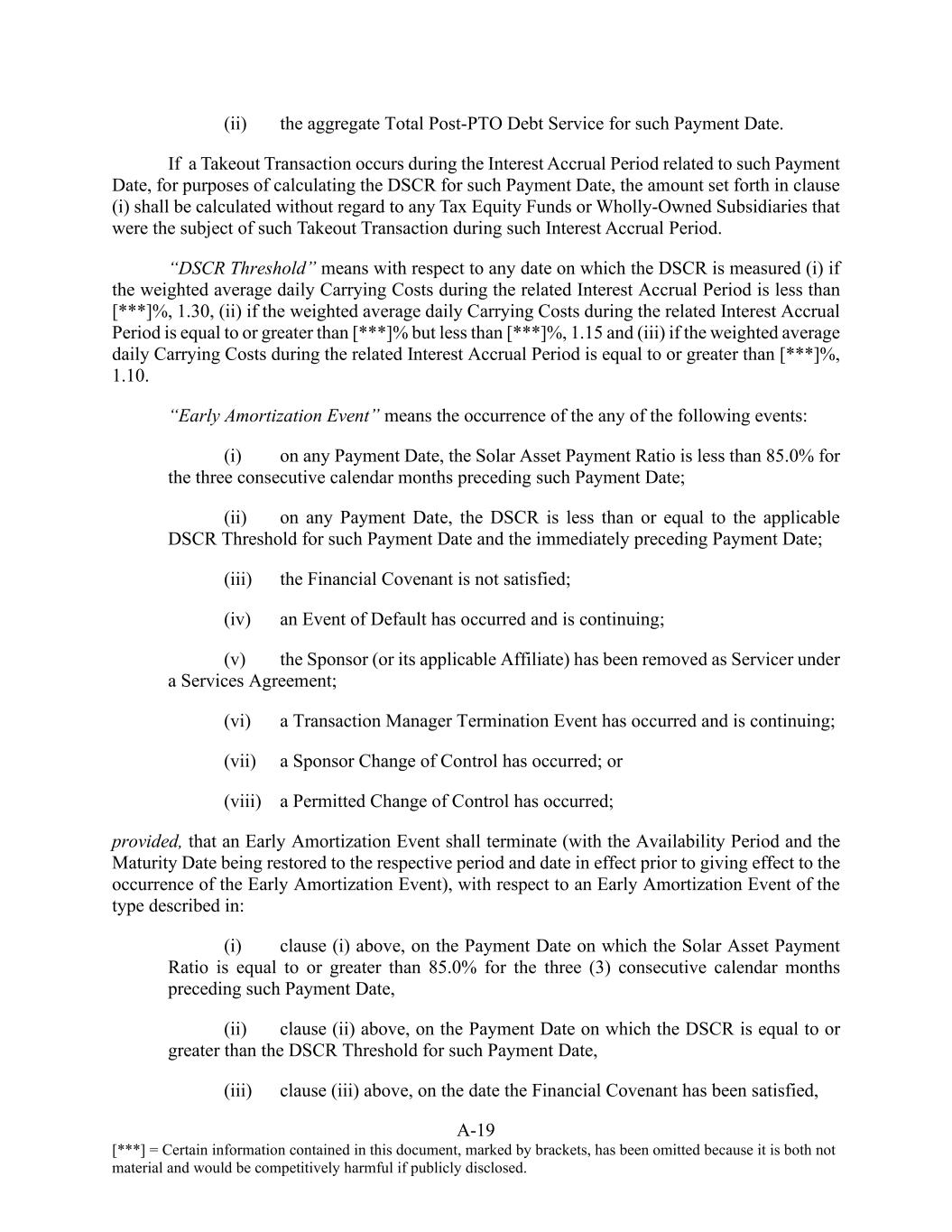 A-19 [***] = Certain information contained in this document, marked by brackets, has been omitted because it is both not material and would be competitively harmful if publicly disclosed. (ii) the aggregate Total Post-PTO Debt Service for such Payment Date. If a Takeout Transaction occurs during the Interest Accrual Period related to such Payment Date, for purposes of calculating the DSCR for such Payment Date, the amount set forth in clause (i) shall be calculated without regard to any Tax Equity Funds or Wholly-Owned Subsidiaries that were the subject of such Takeout Transaction during such Interest Accrual Period. “DSCR Threshold” means with respect to any date on which the DSCR is measured (i) if the weighted average daily Carrying Costs during the related Interest Accrual Period is less than [***]%, 1.30, (ii) if the weighted average daily Carrying Costs during the related Interest Accrual Period is equal to or greater than [***]% but less than [***]%, 1.15 and (iii) if the weighted average daily Carrying Costs during the related Interest Accrual Period is equal to or greater than [***]%, 1.10. “Early Amortization Event” means the occurrence of the any of the following events: (i) on any Payment Date, the Solar Asset Payment Ratio is less than 85.0% for the three consecutive calendar months preceding such Payment Date; (ii) on any Payment Date, the DSCR is less than or equal to the applicable DSCR Threshold for such Payment Date and the immediately preceding Payment Date; (iii) the Financial Covenant is not satisfied; (iv) an Event of Default has occurred and is continuing; (v) the Sponsor (or its applicable Affiliate) has been removed as Servicer under a Services Agreement; (vi) a Transaction Manager Termination Event has occurred and is continuing; (vii) a Sponsor Change of Control has occurred; or (viii) a Permitted Change of Control has occurred; provided, that an Early Amortization Event shall terminate (with the Availability Period and the Maturity Date being restored to the respective period and date in effect prior to giving effect to the occurrence of the Early Amortization Event), with respect to an Early Amortization Event of the type described in: (i) clause (i) above, on the Payment Date on which the Solar Asset Payment Ratio is equal to or greater than 85.0% for the three (3) consecutive calendar months preceding such Payment Date, (ii) clause (ii) above, on the Payment Date on which the DSCR is equal to or greater than the DSCR Threshold for such Payment Date, (iii) clause (iii) above, on the date the Financial Covenant has been satisfied,