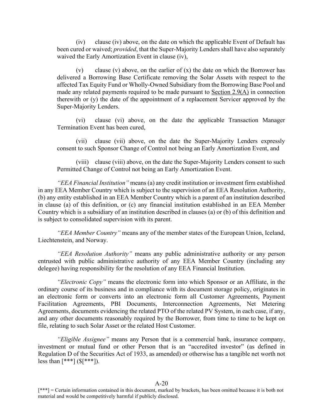 A-20 [***] = Certain information contained in this document, marked by brackets, has been omitted because it is both not material and would be competitively harmful if publicly disclosed. (iv) clause (iv) above, on the date on which the applicable Event of Default has been cured or waived; provided, that the Super-Majority Lenders shall have also separately waived the Early Amortization Event in clause (iv), (v) clause (v) above, on the earlier of (x) the date on which the Borrower has delivered a Borrowing Base Certificate removing the Solar Assets with respect to the affected Tax Equity Fund or Wholly-Owned Subsidiary from the Borrowing Base Pool and made any related payments required to be made pursuant to Section 2.9(A) in connection therewith or (y) the date of the appointment of a replacement Servicer approved by the Super-Majority Lenders. (vi) clause (vi) above, on the date the applicable Transaction Manager Termination Event has been cured, (vii) clause (vii) above, on the date the Super-Majority Lenders expressly consent to such Sponsor Change of Control not being an Early Amortization Event, and (viii) clause (viii) above, on the date the Super-Majority Lenders consent to such Permitted Change of Control not being an Early Amortization Event. “EEA Financial Institution” means (a) any credit institution or investment firm established in any EEA Member Country which is subject to the supervision of an EEA Resolution Authority, (b) any entity established in an EEA Member Country which is a parent of an institution described in clause (a) of this definition, or (c) any financial institution established in an EEA Member Country which is a subsidiary of an institution described in clauses (a) or (b) of this definition and is subject to consolidated supervision with its parent. “EEA Member Country” means any of the member states of the European Union, Iceland, Liechtenstein, and Norway. “EEA Resolution Authority” means any public administrative authority or any person entrusted with public administrative authority of any EEA Member Country (including any delegee) having responsibility for the resolution of any EEA Financial Institution. “Electronic Copy” means the electronic form into which Sponsor or an Affiliate, in the ordinary course of its business and in compliance with its document storage policy, originates in an electronic form or converts into an electronic form all Customer Agreements, Payment Facilitation Agreements, PBI Documents, Interconnection Agreements, Net Metering Agreements, documents evidencing the related PTO of the related PV System, in each case, if any, and any other documents reasonably required by the Borrower, from time to time to be kept on file, relating to such Solar Asset or the related Host Customer. “Eligible Assignee” means any Person that is a commercial bank, insurance company, investment or mutual fund or other Person that is an “accredited investor” (as defined in Regulation D of the Securities Act of 1933, as amended) or otherwise has a tangible net worth not less than [***] ($[***]).