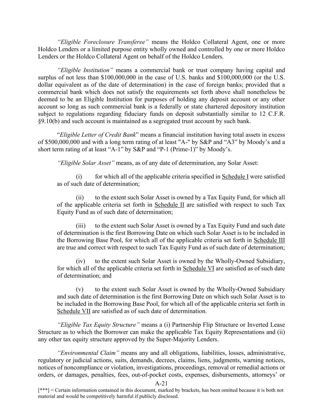 A-21 [***] = Certain information contained in this document, marked by brackets, has been omitted because it is both not material and would be competitively harmful if publicly disclosed. “Eligible Foreclosure Transferee” means the Holdco Collateral Agent, one or more Holdco Lenders or a limited purpose entity wholly owned and controlled by one or more Holdco Lenders or the Holdco Collateral Agent on behalf of the Holdco Lenders. “Eligible Institution” means a commercial bank or trust company having capital and surplus of not less than $100,000,000 in the case of U.S. banks and $100,000,000 (or the U.S. dollar equivalent as of the date of determination) in the case of foreign banks; provided that a commercial bank which does not satisfy the requirements set forth above shall nonetheless be deemed to be an Eligible Institution for purposes of holding any deposit account or any other account so long as such commercial bank is a federally or state chartered depository institution subject to regulations regarding fiduciary funds on deposit substantially similar to 12 C.F.R. §9.10(b) and such account is maintained as a segregated trust account by such bank. “Eligible Letter of Credit Bank” means a financial institution having total assets in excess of $500,000,000 and with a long term rating of at least "A-" by S&P and “A3” by Moody’s and a short term rating of at least “A-1” by S&P and “P-1 (Prime-1)” by Moody’s. “Eligible Solar Asset” means, as of any date of determination, any Solar Asset: (i) for which all of the applicable criteria specified in Schedule I were satisfied as of such date of determination; (ii) to the extent such Solar Asset is owned by a Tax Equity Fund, for which all of the applicable criteria set forth in Schedule II are satisfied with respect to such Tax Equity Fund as of such date of determination; (iii) to the extent such Solar Asset is owned by a Tax Equity Fund and such date of determination is the first Borrowing Date on which such Solar Asset is to be included in the Borrowing Base Pool, for which all of the applicable criteria set forth in Schedule III are true and correct with respect to such Tax Equity Fund as of such date of determination; (iv) to the extent such Solar Asset is owned by the Wholly-Owned Subsidiary, for which all of the applicable criteria set forth in Schedule VI are satisfied as of such date of determination; and (v) to the extent such Solar Asset is owned by the Wholly-Owned Subsidiary and such date of determination is the first Borrowing Date on which such Solar Asset is to be included in the Borrowing Base Pool, for which all of the applicable criteria set forth in Schedule VII are satisfied as of such date of determination. “Eligible Tax Equity Structure” means a (i) Partnership Flip Structure or Inverted Lease Structure as to which the Borrower can make the applicable Tax Equity Representations and (ii) any other tax equity structure approved by the Super-Majority Lenders. “Environmental Claim” means any and all obligations, liabilities, losses, administrative, regulatory or judicial actions, suits, demands, decrees, claims, liens, judgments, warning notices, notices of noncompliance or violation, investigations, proceedings, removal or remedial actions or orders, or damages, penalties, fees, out-of-pocket costs, expenses, disbursements, attorneys’ or