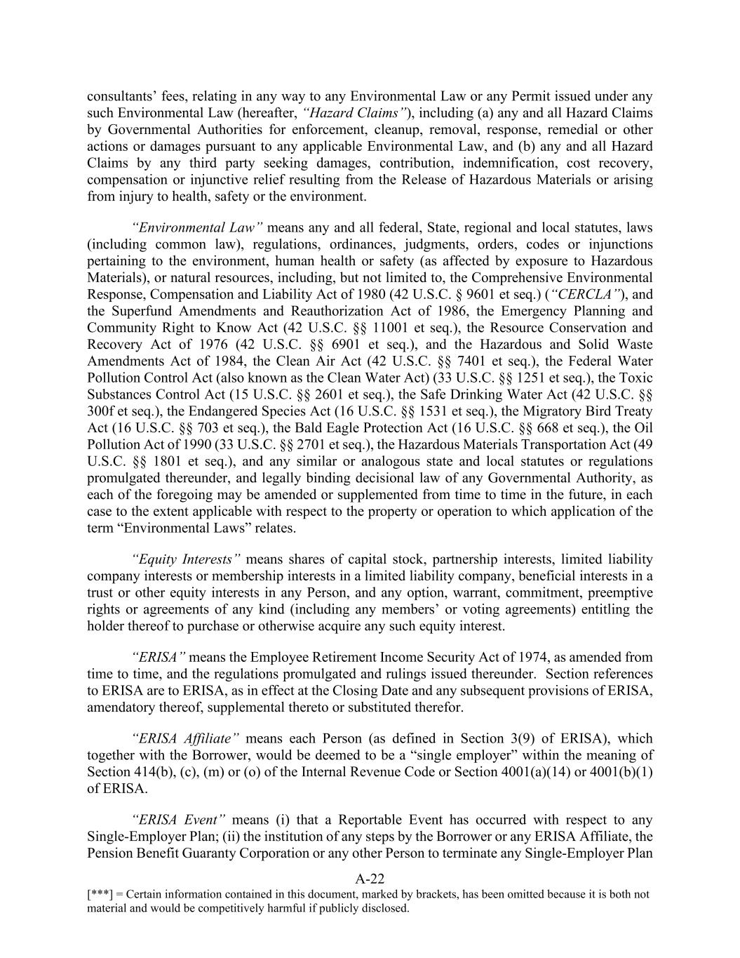 A-22 [***] = Certain information contained in this document, marked by brackets, has been omitted because it is both not material and would be competitively harmful if publicly disclosed. consultants’ fees, relating in any way to any Environmental Law or any Permit issued under any such Environmental Law (hereafter, “Hazard Claims”), including (a) any and all Hazard Claims by Governmental Authorities for enforcement, cleanup, removal, response, remedial or other actions or damages pursuant to any applicable Environmental Law, and (b) any and all Hazard Claims by any third party seeking damages, contribution, indemnification, cost recovery, compensation or injunctive relief resulting from the Release of Hazardous Materials or arising from injury to health, safety or the environment. “Environmental Law” means any and all federal, State, regional and local statutes, laws (including common law), regulations, ordinances, judgments, orders, codes or injunctions pertaining to the environment, human health or safety (as affected by exposure to Hazardous Materials), or natural resources, including, but not limited to, the Comprehensive Environmental Response, Compensation and Liability Act of 1980 (42 U.S.C. § 9601 et seq.) (“CERCLA”), and the Superfund Amendments and Reauthorization Act of 1986, the Emergency Planning and Community Right to Know Act (42 U.S.C. §§ 11001 et seq.), the Resource Conservation and Recovery Act of 1976 (42 U.S.C. §§ 6901 et seq.), and the Hazardous and Solid Waste Amendments Act of 1984, the Clean Air Act (42 U.S.C. §§ 7401 et seq.), the Federal Water Pollution Control Act (also known as the Clean Water Act) (33 U.S.C. §§ 1251 et seq.), the Toxic Substances Control Act (15 U.S.C. §§ 2601 et seq.), the Safe Drinking Water Act (42 U.S.C. §§ 300f et seq.), the Endangered Species Act (16 U.S.C. §§ 1531 et seq.), the Migratory Bird Treaty Act (16 U.S.C. §§ 703 et seq.), the Bald Eagle Protection Act (16 U.S.C. §§ 668 et seq.), the Oil Pollution Act of 1990 (33 U.S.C. §§ 2701 et seq.), the Hazardous Materials Transportation Act (49 U.S.C. §§ 1801 et seq.), and any similar or analogous state and local statutes or regulations promulgated thereunder, and legally binding decisional law of any Governmental Authority, as each of the foregoing may be amended or supplemented from time to time in the future, in each case to the extent applicable with respect to the property or operation to which application of the term “Environmental Laws” relates. “Equity Interests” means shares of capital stock, partnership interests, limited liability company interests or membership interests in a limited liability company, beneficial interests in a trust or other equity interests in any Person, and any option, warrant, commitment, preemptive rights or agreements of any kind (including any members’ or voting agreements) entitling the holder thereof to purchase or otherwise acquire any such equity interest. “ERISA” means the Employee Retirement Income Security Act of 1974, as amended from time to time, and the regulations promulgated and rulings issued thereunder. Section references to ERISA are to ERISA, as in effect at the Closing Date and any subsequent provisions of ERISA, amendatory thereof, supplemental thereto or substituted therefor. “ERISA Affiliate” means each Person (as defined in Section 3(9) of ERISA), which together with the Borrower, would be deemed to be a “single employer” within the meaning of Section 414(b), (c), (m) or (o) of the Internal Revenue Code or Section 4001(a)(14) or 4001(b)(1) of ERISA. “ERISA Event” means (i) that a Reportable Event has occurred with respect to any Single-Employer Plan; (ii) the institution of any steps by the Borrower or any ERISA Affiliate, the Pension Benefit Guaranty Corporation or any other Person to terminate any Single-Employer Plan