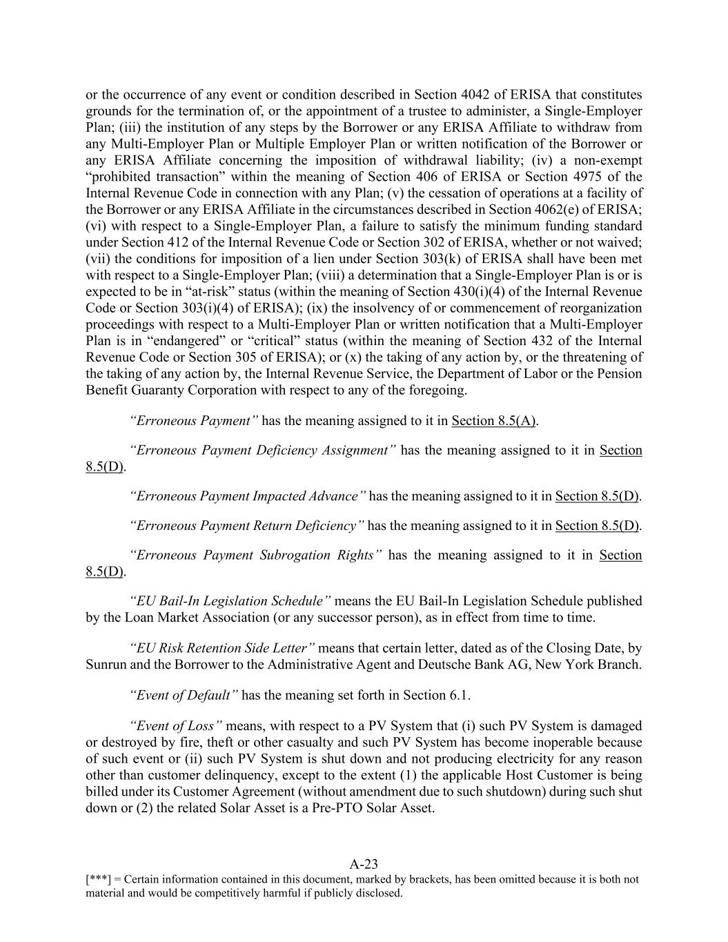 A-23 [***] = Certain information contained in this document, marked by brackets, has been omitted because it is both not material and would be competitively harmful if publicly disclosed. or the occurrence of any event or condition described in Section 4042 of ERISA that constitutes grounds for the termination of, or the appointment of a trustee to administer, a Single-Employer Plan; (iii) the institution of any steps by the Borrower or any ERISA Affiliate to withdraw from any Multi-Employer Plan or Multiple Employer Plan or written notification of the Borrower or any ERISA Affiliate concerning the imposition of withdrawal liability; (iv) a non-exempt “prohibited transaction” within the meaning of Section 406 of ERISA or Section 4975 of the Internal Revenue Code in connection with any Plan; (v) the cessation of operations at a facility of the Borrower or any ERISA Affiliate in the circumstances described in Section 4062(e) of ERISA; (vi) with respect to a Single-Employer Plan, a failure to satisfy the minimum funding standard under Section 412 of the Internal Revenue Code or Section 302 of ERISA, whether or not waived; (vii) the conditions for imposition of a lien under Section 303(k) of ERISA shall have been met with respect to a Single-Employer Plan; (viii) a determination that a Single-Employer Plan is or is expected to be in “at-risk” status (within the meaning of Section 430(i)(4) of the Internal Revenue Code or Section 303(i)(4) of ERISA); (ix) the insolvency of or commencement of reorganization proceedings with respect to a Multi-Employer Plan or written notification that a Multi-Employer Plan is in “endangered” or “critical” status (within the meaning of Section 432 of the Internal Revenue Code or Section 305 of ERISA); or (x) the taking of any action by, or the threatening of the taking of any action by, the Internal Revenue Service, the Department of Labor or the Pension Benefit Guaranty Corporation with respect to any of the foregoing. “Erroneous Payment” has the meaning assigned to it in Section 8.5(A). “Erroneous Payment Deficiency Assignment” has the meaning assigned to it in Section 8.5(D). “Erroneous Payment Impacted Advance” has the meaning assigned to it in Section 8.5(D). “Erroneous Payment Return Deficiency” has the meaning assigned to it in Section 8.5(D). “Erroneous Payment Subrogation Rights” has the meaning assigned to it in Section 8.5(D). “EU Bail-In Legislation Schedule” means the EU Bail-In Legislation Schedule published by the Loan Market Association (or any successor person), as in effect from time to time. “EU Risk Retention Side Letter” means that certain letter, dated as of the Closing Date, by Sunrun and the Borrower to the Administrative Agent and Deutsche Bank AG, New York Branch. “Event of Default” has the meaning set forth in Section 6.1. “Event of Loss” means, with respect to a PV System that (i) such PV System is damaged or destroyed by fire, theft or other casualty and such PV System has become inoperable because of such event or (ii) such PV System is shut down and not producing electricity for any reason other than customer delinquency, except to the extent (1) the applicable Host Customer is being billed under its Customer Agreement (without amendment due to such shutdown) during such shut down or (2) the related Solar Asset is a Pre-PTO Solar Asset.