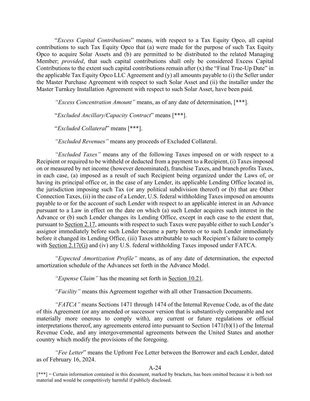 A-24 [***] = Certain information contained in this document, marked by brackets, has been omitted because it is both not material and would be competitively harmful if publicly disclosed. “Excess Capital Contributions” means, with respect to a Tax Equity Opco, all capital contributions to such Tax Equity Opco that (a) were made for the purpose of such Tax Equity Opco to acquire Solar Assets and (b) are permitted to be distributed to the related Managing Member; provided, that such capital contributions shall only be considered Excess Capital Contributions to the extent such capital contributions remain after (x) the “Final True-Up Date” in the applicable Tax Equity Opco LLC Agreement and (y) all amounts payable to (i) the Seller under the Master Purchase Agreement with respect to such Solar Asset and (ii) the installer under the Master Turnkey Installation Agreement with respect to such Solar Asset, have been paid. “Excess Concentration Amount” means, as of any date of determination, [***]. “Excluded Ancillary/Capacity Contract” means [***]. “Excluded Collateral” means [***]. “Excluded Revenues” means any proceeds of Excluded Collateral. “Excluded Taxes” means any of the following Taxes imposed on or with respect to a Recipient or required to be withheld or deducted from a payment to a Recipient, (i) Taxes imposed on or measured by net income (however denominated), franchise Taxes, and branch profits Taxes, in each case, (a) imposed as a result of such Recipient being organized under the Laws of, or having its principal office or, in the case of any Lender, its applicable Lending Office located in, the jurisdiction imposing such Tax (or any political subdivision thereof) or (b) that are Other Connection Taxes, (ii) in the case of a Lender, U.S. federal withholding Taxes imposed on amounts payable to or for the account of such Lender with respect to an applicable interest in an Advance pursuant to a Law in effect on the date on which (a) such Lender acquires such interest in the Advance or (b) such Lender changes its Lending Office, except in each case to the extent that, pursuant to Section 2.17, amounts with respect to such Taxes were payable either to such Lender’s assignor immediately before such Lender became a party hereto or to such Lender immediately before it changed its Lending Office, (iii) Taxes attributable to such Recipient’s failure to comply with Section 2.17(G) and (iv) any U.S. federal withholding Taxes imposed under FATCA. “Expected Amortization Profile” means, as of any date of determination, the expected amortization schedule of the Advances set forth in the Advance Model. “Expense Claim” has the meaning set forth in Section 10.21. “Facility” means this Agreement together with all other Transaction Documents. “FATCA” means Sections 1471 through 1474 of the Internal Revenue Code, as of the date of this Agreement (or any amended or successor version that is substantively comparable and not materially more onerous to comply with), any current or future regulations or official interpretations thereof, any agreements entered into pursuant to Section 1471(b)(1) of the Internal Revenue Code, and any intergovernmental agreements between the United States and another country which modify the provisions of the foregoing. “Fee Letter” means the Upfront Fee Letter between the Borrower and each Lender, dated as of February 16, 2024.