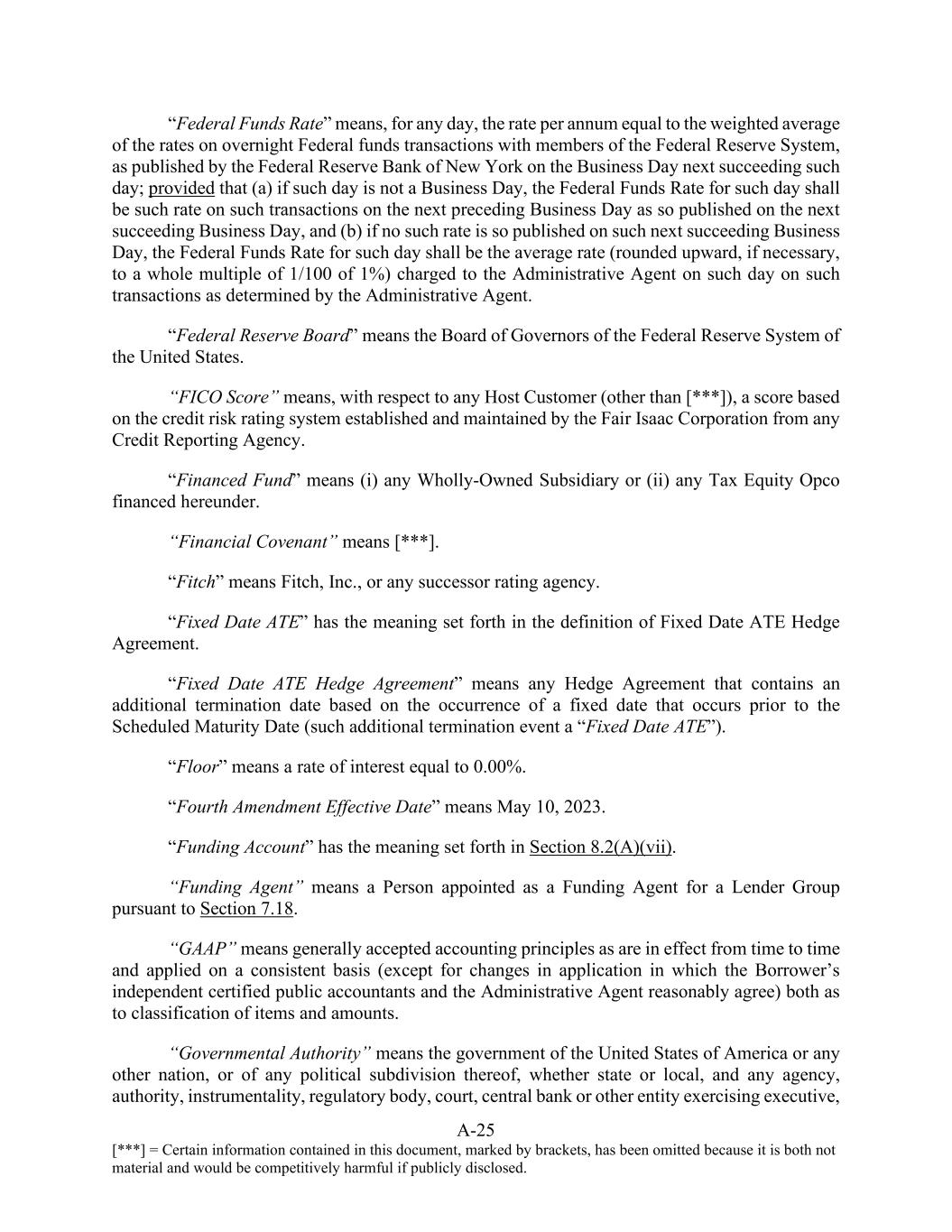 A-25 [***] = Certain information contained in this document, marked by brackets, has been omitted because it is both not material and would be competitively harmful if publicly disclosed. “Federal Funds Rate” means, for any day, the rate per annum equal to the weighted average of the rates on overnight Federal funds transactions with members of the Federal Reserve System, as published by the Federal Reserve Bank of New York on the Business Day next succeeding such day; provided that (a) if such day is not a Business Day, the Federal Funds Rate for such day shall be such rate on such transactions on the next preceding Business Day as so published on the next succeeding Business Day, and (b) if no such rate is so published on such next succeeding Business Day, the Federal Funds Rate for such day shall be the average rate (rounded upward, if necessary, to a whole multiple of 1/100 of 1%) charged to the Administrative Agent on such day on such transactions as determined by the Administrative Agent. “Federal Reserve Board” means the Board of Governors of the Federal Reserve System of the United States. “FICO Score” means, with respect to any Host Customer (other than [***]), a score based on the credit risk rating system established and maintained by the Fair Isaac Corporation from any Credit Reporting Agency. “Financed Fund” means (i) any Wholly-Owned Subsidiary or (ii) any Tax Equity Opco financed hereunder. “Financial Covenant” means [***]. “Fitch” means Fitch, Inc., or any successor rating agency. “Fixed Date ATE” has the meaning set forth in the definition of Fixed Date ATE Hedge Agreement. “Fixed Date ATE Hedge Agreement” means any Hedge Agreement that contains an additional termination date based on the occurrence of a fixed date that occurs prior to the Scheduled Maturity Date (such additional termination event a “Fixed Date ATE”). “Floor” means a rate of interest equal to 0.00%. “Fourth Amendment Effective Date” means May 10, 2023. “Funding Account” has the meaning set forth in Section 8.2(A)(vii). “Funding Agent” means a Person appointed as a Funding Agent for a Lender Group pursuant to Section 7.18. “GAAP” means generally accepted accounting principles as are in effect from time to time and applied on a consistent basis (except for changes in application in which the Borrower’s independent certified public accountants and the Administrative Agent reasonably agree) both as to classification of items and amounts. “Governmental Authority” means the government of the United States of America or any other nation, or of any political subdivision thereof, whether state or local, and any agency, authority, instrumentality, regulatory body, court, central bank or other entity exercising executive,