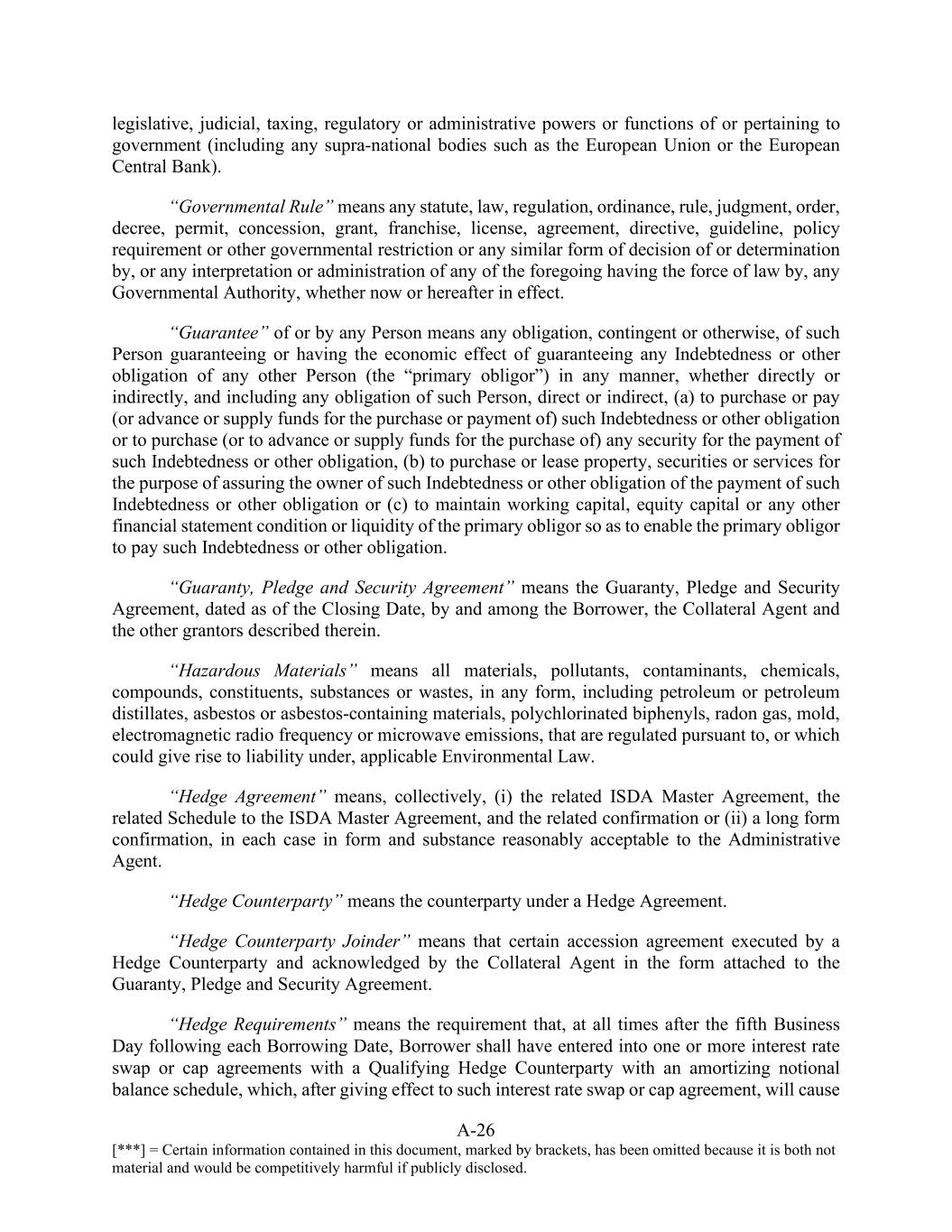 A-26 [***] = Certain information contained in this document, marked by brackets, has been omitted because it is both not material and would be competitively harmful if publicly disclosed. legislative, judicial, taxing, regulatory or administrative powers or functions of or pertaining to government (including any supra-national bodies such as the European Union or the European Central Bank). “Governmental Rule” means any statute, law, regulation, ordinance, rule, judgment, order, decree, permit, concession, grant, franchise, license, agreement, directive, guideline, policy requirement or other governmental restriction or any similar form of decision of or determination by, or any interpretation or administration of any of the foregoing having the force of law by, any Governmental Authority, whether now or hereafter in effect. “Guarantee” of or by any Person means any obligation, contingent or otherwise, of such Person guaranteeing or having the economic effect of guaranteeing any Indebtedness or other obligation of any other Person (the “primary obligor”) in any manner, whether directly or indirectly, and including any obligation of such Person, direct or indirect, (a) to purchase or pay (or advance or supply funds for the purchase or payment of) such Indebtedness or other obligation or to purchase (or to advance or supply funds for the purchase of) any security for the payment of such Indebtedness or other obligation, (b) to purchase or lease property, securities or services for the purpose of assuring the owner of such Indebtedness or other obligation of the payment of such Indebtedness or other obligation or (c) to maintain working capital, equity capital or any other financial statement condition or liquidity of the primary obligor so as to enable the primary obligor to pay such Indebtedness or other obligation. “Guaranty, Pledge and Security Agreement” means the Guaranty, Pledge and Security Agreement, dated as of the Closing Date, by and among the Borrower, the Collateral Agent and the other grantors described therein. “Hazardous Materials” means all materials, pollutants, contaminants, chemicals, compounds, constituents, substances or wastes, in any form, including petroleum or petroleum distillates, asbestos or asbestos-containing materials, polychlorinated biphenyls, radon gas, mold, electromagnetic radio frequency or microwave emissions, that are regulated pursuant to, or which could give rise to liability under, applicable Environmental Law. “Hedge Agreement” means, collectively, (i) the related ISDA Master Agreement, the related Schedule to the ISDA Master Agreement, and the related confirmation or (ii) a long form confirmation, in each case in form and substance reasonably acceptable to the Administrative Agent. “Hedge Counterparty” means the counterparty under a Hedge Agreement. “Hedge Counterparty Joinder” means that certain accession agreement executed by a Hedge Counterparty and acknowledged by the Collateral Agent in the form attached to the Guaranty, Pledge and Security Agreement. “Hedge Requirements” means the requirement that, at all times after the fifth Business Day following each Borrowing Date, Borrower shall have entered into one or more interest rate swap or cap agreements with a Qualifying Hedge Counterparty with an amortizing notional balance schedule, which, after giving effect to such interest rate swap or cap agreement, will cause