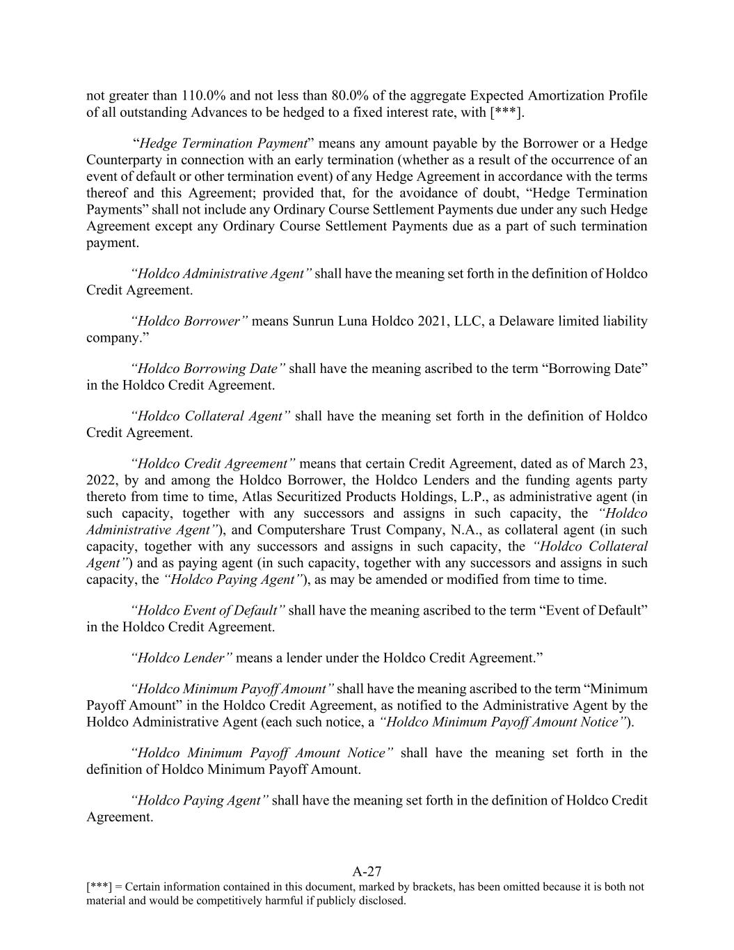 A-27 [***] = Certain information contained in this document, marked by brackets, has been omitted because it is both not material and would be competitively harmful if publicly disclosed. not greater than 110.0% and not less than 80.0% of the aggregate Expected Amortization Profile of all outstanding Advances to be hedged to a fixed interest rate, with [***]. “Hedge Termination Payment” means any amount payable by the Borrower or a Hedge Counterparty in connection with an early termination (whether as a result of the occurrence of an event of default or other termination event) of any Hedge Agreement in accordance with the terms thereof and this Agreement; provided that, for the avoidance of doubt, “Hedge Termination Payments” shall not include any Ordinary Course Settlement Payments due under any such Hedge Agreement except any Ordinary Course Settlement Payments due as a part of such termination payment. “Holdco Administrative Agent” shall have the meaning set forth in the definition of Holdco Credit Agreement. “Holdco Borrower” means Sunrun Luna Holdco 2021, LLC, a Delaware limited liability company.” “Holdco Borrowing Date” shall have the meaning ascribed to the term “Borrowing Date” in the Holdco Credit Agreement. “Holdco Collateral Agent” shall have the meaning set forth in the definition of Holdco Credit Agreement. “Holdco Credit Agreement” means that certain Credit Agreement, dated as of March 23, 2022, by and among the Holdco Borrower, the Holdco Lenders and the funding agents party thereto from time to time, Atlas Securitized Products Holdings, L.P., as administrative agent (in such capacity, together with any successors and assigns in such capacity, the “Holdco Administrative Agent”), and Computershare Trust Company, N.A., as collateral agent (in such capacity, together with any successors and assigns in such capacity, the “Holdco Collateral Agent”) and as paying agent (in such capacity, together with any successors and assigns in such capacity, the “Holdco Paying Agent”), as may be amended or modified from time to time. “Holdco Event of Default” shall have the meaning ascribed to the term “Event of Default” in the Holdco Credit Agreement. “Holdco Lender” means a lender under the Holdco Credit Agreement.” “Holdco Minimum Payoff Amount” shall have the meaning ascribed to the term “Minimum Payoff Amount” in the Holdco Credit Agreement, as notified to the Administrative Agent by the Holdco Administrative Agent (each such notice, a “Holdco Minimum Payoff Amount Notice”). “Holdco Minimum Payoff Amount Notice” shall have the meaning set forth in the definition of Holdco Minimum Payoff Amount. “Holdco Paying Agent” shall have the meaning set forth in the definition of Holdco Credit Agreement.