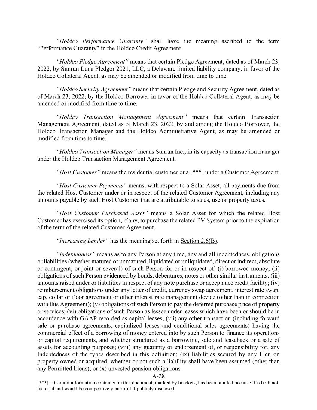 A-28 [***] = Certain information contained in this document, marked by brackets, has been omitted because it is both not material and would be competitively harmful if publicly disclosed. “Holdco Performance Guaranty” shall have the meaning ascribed to the term “Performance Guaranty” in the Holdco Credit Agreement. “Holdco Pledge Agreement” means that certain Pledge Agreement, dated as of March 23, 2022, by Sunrun Luna Pledgor 2021, LLC, a Delaware limited liability company, in favor of the Holdco Collateral Agent, as may be amended or modified from time to time. “Holdco Security Agreement” means that certain Pledge and Security Agreement, dated as of March 23, 2022, by the Holdco Borrower in favor of the Holdco Collateral Agent, as may be amended or modified from time to time. “Holdco Transaction Management Agreement” means that certain Transaction Management Agreement, dated as of March 23, 2022, by and among the Holdco Borrower, the Holdco Transaction Manager and the Holdco Administrative Agent, as may be amended or modified from time to time. “Holdco Transaction Manager” means Sunrun Inc., in its capacity as transaction manager under the Holdco Transaction Management Agreement. “Host Customer” means the residential customer or a [***] under a Customer Agreement. “Host Customer Payments” means, with respect to a Solar Asset, all payments due from the related Host Customer under or in respect of the related Customer Agreement, including any amounts payable by such Host Customer that are attributable to sales, use or property taxes. “Host Customer Purchased Asset” means a Solar Asset for which the related Host Customer has exercised its option, if any, to purchase the related PV System prior to the expiration of the term of the related Customer Agreement. “Increasing Lender” has the meaning set forth in Section 2.6(B). “Indebtedness” means as to any Person at any time, any and all indebtedness, obligations or liabilities (whether matured or unmatured, liquidated or unliquidated, direct or indirect, absolute or contingent, or joint or several) of such Person for or in respect of: (i) borrowed money; (ii) obligations of such Person evidenced by bonds, debentures, notes or other similar instruments; (iii) amounts raised under or liabilities in respect of any note purchase or acceptance credit facility; (iv) reimbursement obligations under any letter of credit, currency swap agreement, interest rate swap, cap, collar or floor agreement or other interest rate management device (other than in connection with this Agreement); (v) obligations of such Person to pay the deferred purchase price of property or services; (vi) obligations of such Person as lessee under leases which have been or should be in accordance with GAAP recorded as capital leases; (vii) any other transaction (including forward sale or purchase agreements, capitalized leases and conditional sales agreements) having the commercial effect of a borrowing of money entered into by such Person to finance its operations or capital requirements, and whether structured as a borrowing, sale and leaseback or a sale of assets for accounting purposes; (viii) any guaranty or endorsement of, or responsibility for, any Indebtedness of the types described in this definition; (ix) liabilities secured by any Lien on property owned or acquired, whether or not such a liability shall have been assumed (other than any Permitted Liens); or (x) unvested pension obligations.