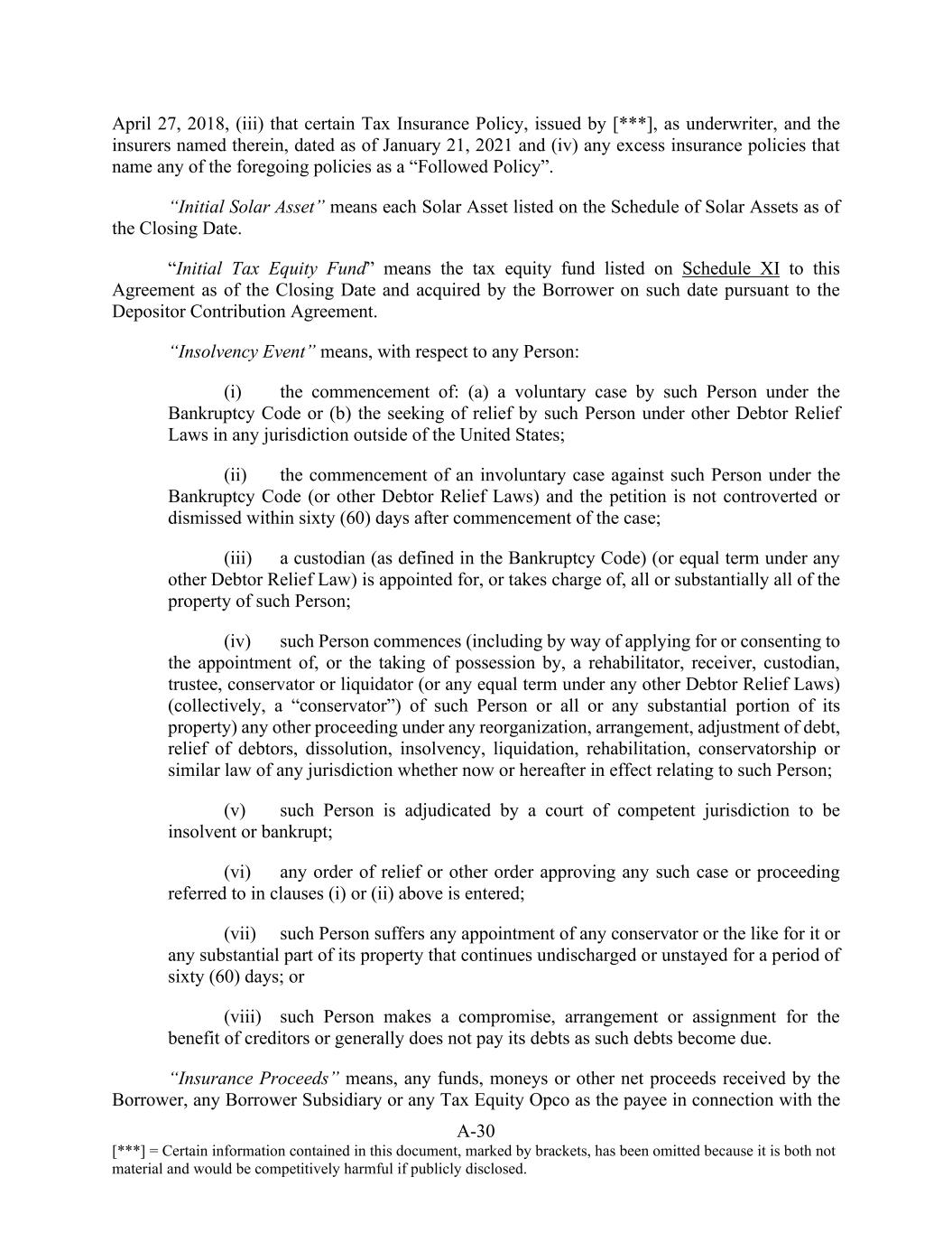 A-30 [***] = Certain information contained in this document, marked by brackets, has been omitted because it is both not material and would be competitively harmful if publicly disclosed. April 27, 2018, (iii) that certain Tax Insurance Policy, issued by [***], as underwriter, and the insurers named therein, dated as of January 21, 2021 and (iv) any excess insurance policies that name any of the foregoing policies as a “Followed Policy”. “Initial Solar Asset” means each Solar Asset listed on the Schedule of Solar Assets as of the Closing Date. “Initial Tax Equity Fund” means the tax equity fund listed on Schedule XI to this Agreement as of the Closing Date and acquired by the Borrower on such date pursuant to the Depositor Contribution Agreement. “Insolvency Event” means, with respect to any Person: (i) the commencement of: (a) a voluntary case by such Person under the Bankruptcy Code or (b) the seeking of relief by such Person under other Debtor Relief Laws in any jurisdiction outside of the United States; (ii) the commencement of an involuntary case against such Person under the Bankruptcy Code (or other Debtor Relief Laws) and the petition is not controverted or dismissed within sixty (60) days after commencement of the case; (iii) a custodian (as defined in the Bankruptcy Code) (or equal term under any other Debtor Relief Law) is appointed for, or takes charge of, all or substantially all of the property of such Person; (iv) such Person commences (including by way of applying for or consenting to the appointment of, or the taking of possession by, a rehabilitator, receiver, custodian, trustee, conservator or liquidator (or any equal term under any other Debtor Relief Laws) (collectively, a “conservator”) of such Person or all or any substantial portion of its property) any other proceeding under any reorganization, arrangement, adjustment of debt, relief of debtors, dissolution, insolvency, liquidation, rehabilitation, conservatorship or similar law of any jurisdiction whether now or hereafter in effect relating to such Person; (v) such Person is adjudicated by a court of competent jurisdiction to be insolvent or bankrupt; (vi) any order of relief or other order approving any such case or proceeding referred to in clauses (i) or (ii) above is entered; (vii) such Person suffers any appointment of any conservator or the like for it or any substantial part of its property that continues undischarged or unstayed for a period of sixty (60) days; or (viii) such Person makes a compromise, arrangement or assignment for the benefit of creditors or generally does not pay its debts as such debts become due. “Insurance Proceeds” means, any funds, moneys or other net proceeds received by the Borrower, any Borrower Subsidiary or any Tax Equity Opco as the payee in connection with the