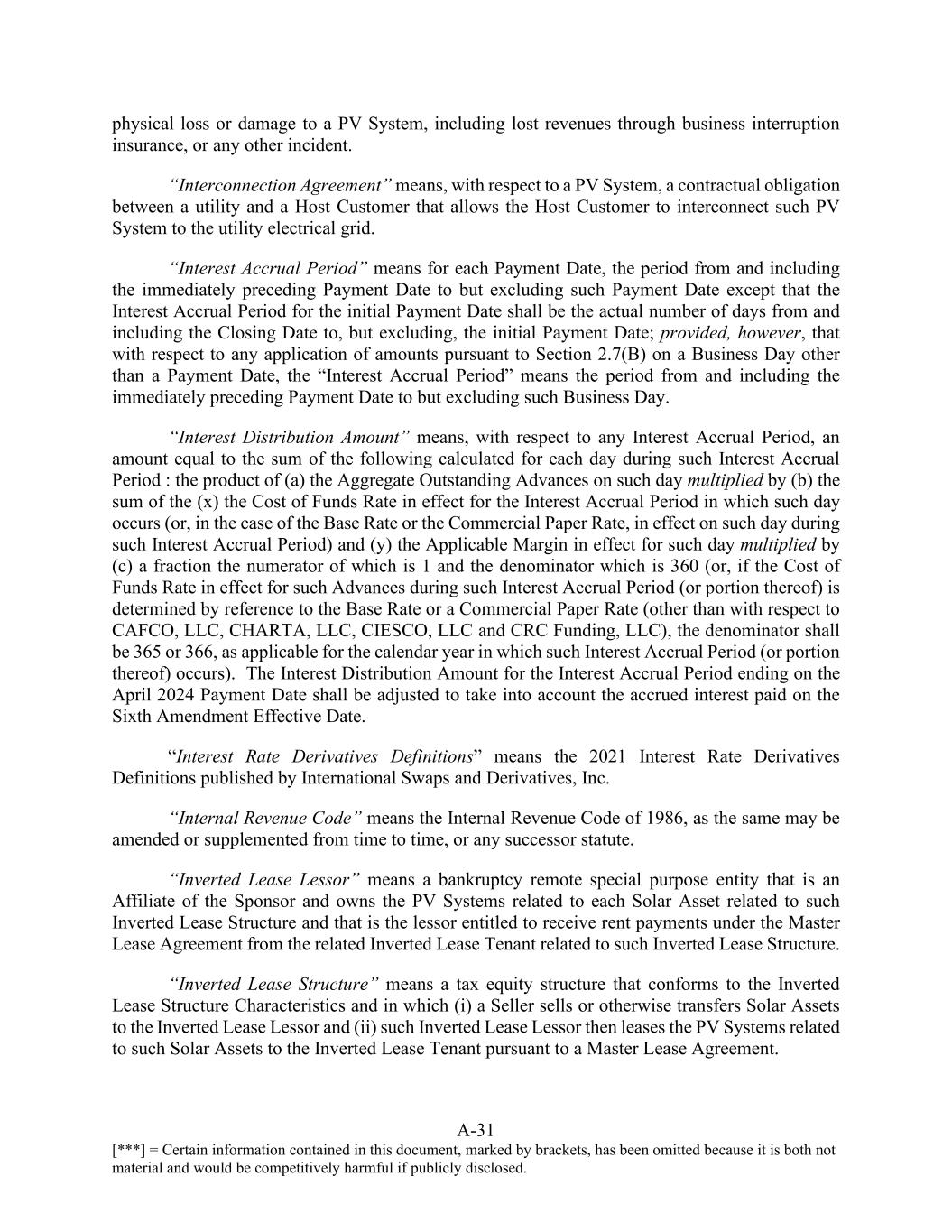 A-31 [***] = Certain information contained in this document, marked by brackets, has been omitted because it is both not material and would be competitively harmful if publicly disclosed. physical loss or damage to a PV System, including lost revenues through business interruption insurance, or any other incident. “Interconnection Agreement” means, with respect to a PV System, a contractual obligation between a utility and a Host Customer that allows the Host Customer to interconnect such PV System to the utility electrical grid. “Interest Accrual Period” means for each Payment Date, the period from and including the immediately preceding Payment Date to but excluding such Payment Date except that the Interest Accrual Period for the initial Payment Date shall be the actual number of days from and including the Closing Date to, but excluding, the initial Payment Date; provided, however, that with respect to any application of amounts pursuant to Section 2.7(B) on a Business Day other than a Payment Date, the “Interest Accrual Period” means the period from and including the immediately preceding Payment Date to but excluding such Business Day. “Interest Distribution Amount” means, with respect to any Interest Accrual Period, an amount equal to the sum of the following calculated for each day during such Interest Accrual Period : the product of (a) the Aggregate Outstanding Advances on such day multiplied by (b) the sum of the (x) the Cost of Funds Rate in effect for the Interest Accrual Period in which such day occurs (or, in the case of the Base Rate or the Commercial Paper Rate, in effect on such day during such Interest Accrual Period) and (y) the Applicable Margin in effect for such day multiplied by (c) a fraction the numerator of which is 1 and the denominator which is 360 (or, if the Cost of Funds Rate in effect for such Advances during such Interest Accrual Period (or portion thereof) is determined by reference to the Base Rate or a Commercial Paper Rate (other than with respect to CAFCO, LLC, CHARTA, LLC, CIESCO, LLC and CRC Funding, LLC), the denominator shall be 365 or 366, as applicable for the calendar year in which such Interest Accrual Period (or portion thereof) occurs). The Interest Distribution Amount for the Interest Accrual Period ending on the April 2024 Payment Date shall be adjusted to take into account the accrued interest paid on the Sixth Amendment Effective Date. “Interest Rate Derivatives Definitions” means the 2021 Interest Rate Derivatives Definitions published by International Swaps and Derivatives, Inc. “Internal Revenue Code” means the Internal Revenue Code of 1986, as the same may be amended or supplemented from time to time, or any successor statute. “Inverted Lease Lessor” means a bankruptcy remote special purpose entity that is an Affiliate of the Sponsor and owns the PV Systems related to each Solar Asset related to such Inverted Lease Structure and that is the lessor entitled to receive rent payments under the Master Lease Agreement from the related Inverted Lease Tenant related to such Inverted Lease Structure. “Inverted Lease Structure” means a tax equity structure that conforms to the Inverted Lease Structure Characteristics and in which (i) a Seller sells or otherwise transfers Solar Assets to the Inverted Lease Lessor and (ii) such Inverted Lease Lessor then leases the PV Systems related to such Solar Assets to the Inverted Lease Tenant pursuant to a Master Lease Agreement.