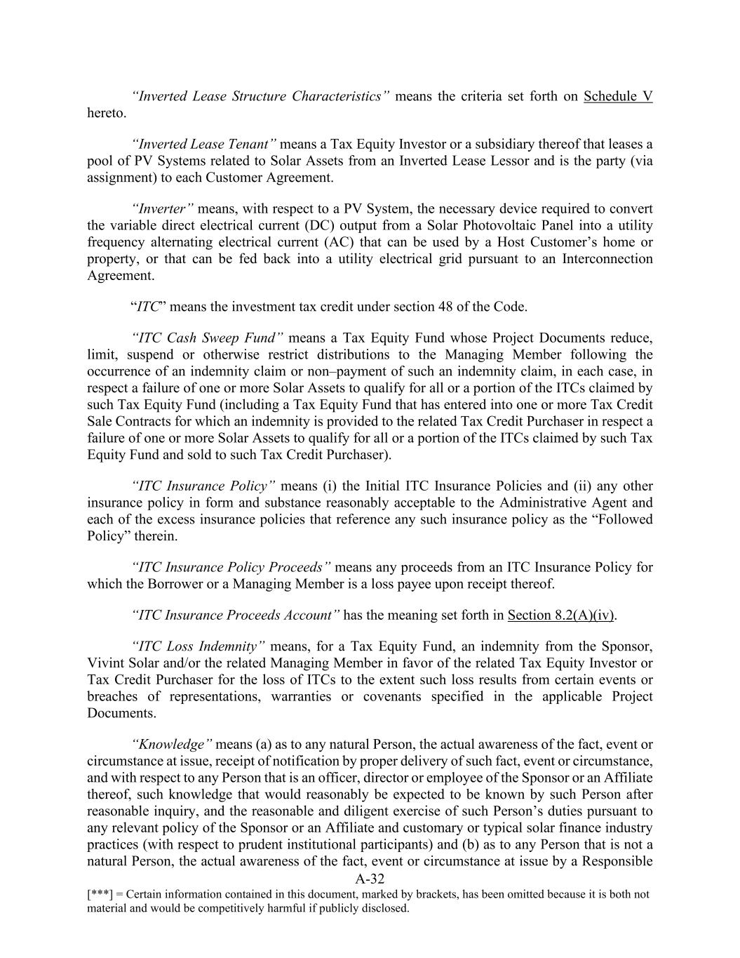 A-32 [***] = Certain information contained in this document, marked by brackets, has been omitted because it is both not material and would be competitively harmful if publicly disclosed. “Inverted Lease Structure Characteristics” means the criteria set forth on Schedule V hereto. “Inverted Lease Tenant” means a Tax Equity Investor or a subsidiary thereof that leases a pool of PV Systems related to Solar Assets from an Inverted Lease Lessor and is the party (via assignment) to each Customer Agreement. “Inverter” means, with respect to a PV System, the necessary device required to convert the variable direct electrical current (DC) output from a Solar Photovoltaic Panel into a utility frequency alternating electrical current (AC) that can be used by a Host Customer’s home or property, or that can be fed back into a utility electrical grid pursuant to an Interconnection Agreement. “ITC” means the investment tax credit under section 48 of the Code. “ITC Cash Sweep Fund” means a Tax Equity Fund whose Project Documents reduce, limit, suspend or otherwise restrict distributions to the Managing Member following the occurrence of an indemnity claim or non–payment of such an indemnity claim, in each case, in respect a failure of one or more Solar Assets to qualify for all or a portion of the ITCs claimed by such Tax Equity Fund (including a Tax Equity Fund that has entered into one or more Tax Credit Sale Contracts for which an indemnity is provided to the related Tax Credit Purchaser in respect a failure of one or more Solar Assets to qualify for all or a portion of the ITCs claimed by such Tax Equity Fund and sold to such Tax Credit Purchaser). “ITC Insurance Policy” means (i) the Initial ITC Insurance Policies and (ii) any other insurance policy in form and substance reasonably acceptable to the Administrative Agent and each of the excess insurance policies that reference any such insurance policy as the “Followed Policy” therein. “ITC Insurance Policy Proceeds” means any proceeds from an ITC Insurance Policy for which the Borrower or a Managing Member is a loss payee upon receipt thereof. “ITC Insurance Proceeds Account” has the meaning set forth in Section 8.2(A)(iv). “ITC Loss Indemnity” means, for a Tax Equity Fund, an indemnity from the Sponsor, Vivint Solar and/or the related Managing Member in favor of the related Tax Equity Investor or Tax Credit Purchaser for the loss of ITCs to the extent such loss results from certain events or breaches of representations, warranties or covenants specified in the applicable Project Documents. “Knowledge” means (a) as to any natural Person, the actual awareness of the fact, event or circumstance at issue, receipt of notification by proper delivery of such fact, event or circumstance, and with respect to any Person that is an officer, director or employee of the Sponsor or an Affiliate thereof, such knowledge that would reasonably be expected to be known by such Person after reasonable inquiry, and the reasonable and diligent exercise of such Person’s duties pursuant to any relevant policy of the Sponsor or an Affiliate and customary or typical solar finance industry practices (with respect to prudent institutional participants) and (b) as to any Person that is not a natural Person, the actual awareness of the fact, event or circumstance at issue by a Responsible