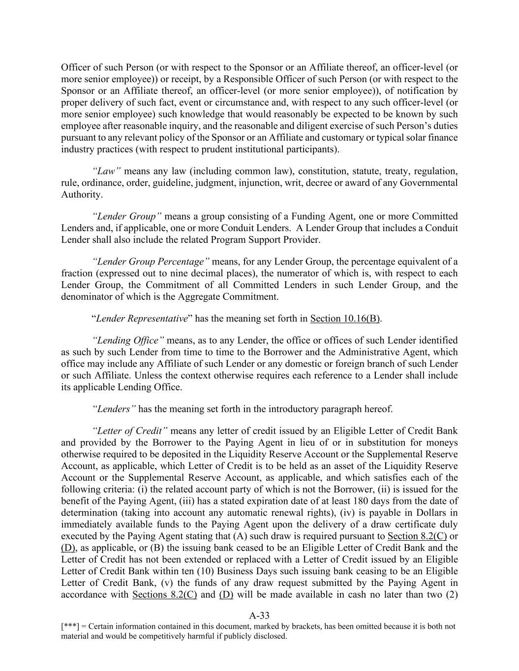 A-33 [***] = Certain information contained in this document, marked by brackets, has been omitted because it is both not material and would be competitively harmful if publicly disclosed. Officer of such Person (or with respect to the Sponsor or an Affiliate thereof, an officer-level (or more senior employee)) or receipt, by a Responsible Officer of such Person (or with respect to the Sponsor or an Affiliate thereof, an officer-level (or more senior employee)), of notification by proper delivery of such fact, event or circumstance and, with respect to any such officer-level (or more senior employee) such knowledge that would reasonably be expected to be known by such employee after reasonable inquiry, and the reasonable and diligent exercise of such Person’s duties pursuant to any relevant policy of the Sponsor or an Affiliate and customary or typical solar finance industry practices (with respect to prudent institutional participants). “Law” means any law (including common law), constitution, statute, treaty, regulation, rule, ordinance, order, guideline, judgment, injunction, writ, decree or award of any Governmental Authority. “Lender Group” means a group consisting of a Funding Agent, one or more Committed Lenders and, if applicable, one or more Conduit Lenders. A Lender Group that includes a Conduit Lender shall also include the related Program Support Provider. “Lender Group Percentage” means, for any Lender Group, the percentage equivalent of a fraction (expressed out to nine decimal places), the numerator of which is, with respect to each Lender Group, the Commitment of all Committed Lenders in such Lender Group, and the denominator of which is the Aggregate Commitment. “Lender Representative” has the meaning set forth in Section 10.16(B). “Lending Office” means, as to any Lender, the office or offices of such Lender identified as such by such Lender from time to time to the Borrower and the Administrative Agent, which office may include any Affiliate of such Lender or any domestic or foreign branch of such Lender or such Affiliate. Unless the context otherwise requires each reference to a Lender shall include its applicable Lending Office. “Lenders” has the meaning set forth in the introductory paragraph hereof. “Letter of Credit” means any letter of credit issued by an Eligible Letter of Credit Bank and provided by the Borrower to the Paying Agent in lieu of or in substitution for moneys otherwise required to be deposited in the Liquidity Reserve Account or the Supplemental Reserve Account, as applicable, which Letter of Credit is to be held as an asset of the Liquidity Reserve Account or the Supplemental Reserve Account, as applicable, and which satisfies each of the following criteria: (i) the related account party of which is not the Borrower, (ii) is issued for the benefit of the Paying Agent, (iii) has a stated expiration date of at least 180 days from the date of determination (taking into account any automatic renewal rights), (iv) is payable in Dollars in immediately available funds to the Paying Agent upon the delivery of a draw certificate duly executed by the Paying Agent stating that (A) such draw is required pursuant to Section 8.2(C) or (D), as applicable, or (B) the issuing bank ceased to be an Eligible Letter of Credit Bank and the Letter of Credit has not been extended or replaced with a Letter of Credit issued by an Eligible Letter of Credit Bank within ten (10) Business Days such issuing bank ceasing to be an Eligible Letter of Credit Bank, (v) the funds of any draw request submitted by the Paying Agent in accordance with Sections 8.2(C) and (D) will be made available in cash no later than two (2)